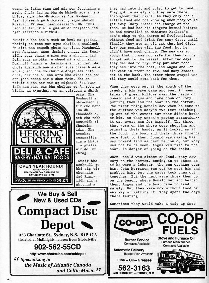 ceann da latha rinn iad air son feuchainn a mach. Chuir iad na bha de bhiadh aca anns a bh&ta;, agus chaidh Aonghas 'us Domhnull 'san toiseach gu h-iomaradh, agus shuidh Ruairidh Friseal 'san deireadh. Dh' fhui- rich an triuir eile gus an d' thigeadh iad 'gan iarraidh a rithis. 'Nuair a bha iad a mach am beul na geodha, thainig an tonn mor agus chaidh a mhullach 'n aird nan stuadh ghorm os cionn Dhomhnull agus Aonghas, agus thainig e nuas air Ruai? ridh, agus chuir e sios gus a ghrunnd iad fein agus am b'ta. A cheud ni a chunnaic Domhnull 'nuair a thainig e an uachdar, da chois Ruairidh nan stoban suas direach as a mhuir; ach cha do chuir e dragh sam bith orra, oir cha b' ann orra bha aire: 'se bh' ann gach neach air a shon fein. Bha an triuir a bha air tir ag eigheach 'sa bua? ladh nam bas, oir bha choltas gu 'n robh am biadh, an t-eathar, us an cairdean a dhith orra. Bha IDomhnull ag obrachadh gu tir cho math 'sa dh' fhaodadh e, ach cha robh Ruairidh ri fhaicinn idir. Bha Aonghas ceangailte ris a bh'ta --a ghalas air dol mu chrag. 'Nuair bha Domhnull gu bhi aig tir chunnaic iad Ruai? ridh air a ghrunnd a DELI & CAFE BAKERY.NATURAL FOODS I OPEN YEAR ROUND WINTER HOURS: MONDAY-FRIDAY 8 AM - 5:30 PM SATURDAY 9 AM-5 PM 3 NYANZA 7.5MI W OF BADDECK ON TCH 105 295-2275 We Buy & Sell New & Used CDs '' Compact Disc Depot ' 328 Charlotte St., Sydney, N.S. BlP 1C8 (located at McKnights...across from Globalville) 902-562-55CD http:www.chatsubo.com/cddepot '' Specializing in the Music of Atlantic Canada and Celtic Music. '' they had into it and tried to get to land. They got in safely and they were there throughout that night. As they only had a little food and not knowing when they would get away, Rory Fraser had charge of the food. He had had his fingers burned before; he had travelled on Minister MacLeod's son's ship to the shores of Newfoundland, without food and drink for many days, until finally they ate an old cat that had died. Rory was sparing with the food, but he didn't have much chance. The sea was so rough that it was not safe for them to try to get out to the vessel. After two days they decided to try. They put what food they had into the boat, and Angus and Don? ald went in front to row, and Rory Fraser sat in the back. The other three stayed un? til they would come back for them. When they were out at the mouth of the creek, a big wave came and went in moun? tains of green billows over the heads of Donald and Angus and came down on Rory, putting them and the boat to the bottom. The first thing Donald saw when he came to the surface was Rory's two feet sticking up out of the water; but that didn't both? er him, as they weren't paying attention-- it was every man for himself. The three that were on the shore were shouting and wringing their hands, as it looked as if the food, the boat and their three friends were lost to them. Donald was making his way toward land as best he could, but Rory was not to be seen. Angus was tied to the boat, in danger of going on the rocks. When Donald was almost on land, they saw Rory on the bottom, coming in to shore as if he were a lobster, the sea washing over him. John Morrison ran out to meet him and grabbed him, but the waves took them out together. But the next wave threw them up on the beach, where Donald met and helped them. Angus and the boat came to land safely. But they were now without food or any way of getting it. They spent two days there fasting. Sometimes they would take a trip up into 75' CO-OP FUELS Burner Service Contracts Available Automatic Delivery Budget Plan Available Lube - Oil - Greases 562-3163 503 PRINCE ST. - SYDNEY, N. S. Stove and Furnace Oil Furnace Maintenance Contracts Available 46