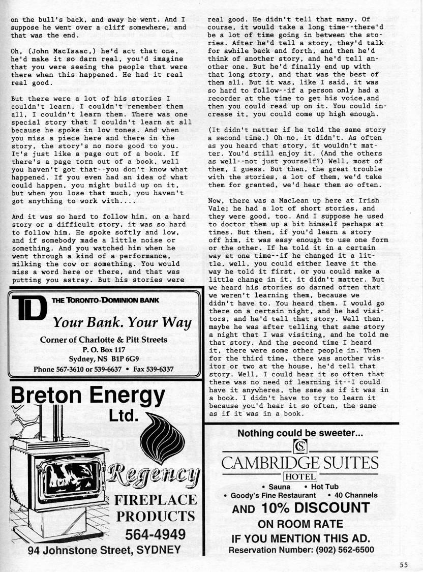Published by Ronald Caplan on 1996/12/1 (166 reads)on the bull's back, and away he went. And I suppose he went over a cliff somewhere, and that was the end. Oh, (John Maclsaac) he'd act that one, he'd make it so darn real, you'd imagine that you were seeing the people that were there when this happened. He had it real real good. But there were a lot of his stories I couldn't learn, I couldn't remember them all, I couldn't learn them. There was one special story that I couldn't learn at all because he spoke in low tones. And when you miss a piece here and there in the story, the story's no more good to you. It's just like a page out of a book. If there's a page torn out of a book, well you haven't got that--you don't know what happened. If you even had an idea of what could happen, you might build up on it, but when you lose that much, you haven't got anything to work with.... And it was so hard to follow him, on a hard story or a difficult story, it was so hard to follow him. He spoke softly and low, and if somebody made a little noise or something. And you watched him when he went through a kind of a performance, milking the cow or something. You would miss a word here or there, and that was putting you astray. But his stories were 1D THE TDROMTO-DOMINION BANK Your Bank. Your Way Corner of Charlotte & Pitt Streets P. O. Box 117 Sydney, NS B1P6G9 Phone 567-3610 or 539-6637 • Fax 539-6337 Breton Energy Ltd. FIREPLACE PRODUCTS 564-4949 94 Johnstone Street, SYDNEY real good. He didn't tell that many. Of course, it would take a long time--there'd be a lot of time going in between the sto? ries. After he'd tell a story, they'd talk for awhile back and forth, and then he'd think of another story, and he'd tell an? other one. But he'd finally end up with that long story, and that was the best of them all. But it was, like I said, it was so hard to follow--if a person only had a recorder at the time to get his voice,and then you could read up on it. You could in? crease it, you could come up high enough. (It didn't matter if he told the same story a second time.) Oh no, it didn't. As often as you heard that story, it wouldn't mat? ter. You'd still enjoy it. (And the others as well--not just yourself?) Well, most of them, I guess. But then, the great trouble with the stories, a lot of them, we'd take them for granted, we'd hear them so often. Now, there was a MacLean up here at Irish Vale; he had a lot of short stories, and they were good, too. And I suppose he used to doctor them up a bit himself perhaps at times. But then, if you'd learn a story off him, it was easy enough to use one form or the other. If he told it in a certain way at one time--if he changed it a lit? tle, well, you could either leave it the way he told it first, or you could make a little change in it, it didn't matter. But we heard his stories so darned often that we weren't learning them, because we didn't have to. You heard them. I would go there on a certain night, and he had visi? tors, and he'd tell that story. Well then, maybe he was after telling that same story a night that I was visiting, and he told me that story. And the second time I heard it, there were some other people in. Then for the third time, there was another vis? itor or two at the house, he'd tell that story. Well, I could hear it so often that there was no need of learning it--I could have it anywheres, the same as if it was in a book. I didn't have to try to learn it because you'd hear it so often, the same as if it was in a book. Nothing could be sweeter.. CAMBRIDGE SUITES iHOTELl • Sauna • Hot Tub • Goody's Fine Restaurant • 40 Channels AND 10% DISCOUNT ON ROOM RATE IF YOU MENTION THIS AD. Reservation Number: (902) 562-6500