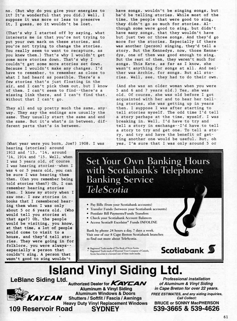 Published by Ronald Caplan on 1996/12/1 (194 reads)no. (But why do you give your energies to it? It's wonderful that you did.) Well, I suppose it was more or less to preserve it, I guess, so it wouldn't be lost. (That's why I started off by saying, what interests me is that you're not trying to put your own mark on these stories, and you're not trying to change the stories. You really seem to want to recapture, as you knew them.) That's why I wouldn't get some more stories down. That's why I couldn't get some more stories set down. Because I wouldn't make any changes. I'd have to remember, to remember as close to what I had heard as possible. There's a few stories that's just floating in the air, and I can't pick them out, but I know of them. I can't seem to find--there's a missing link there, and I can't find that. Without that I can't go. They all end up pretty much the same, any? way. They say the endings are usually the same. They usually start the same and end the same. But it's what's in between, dif? ferent parts that's in between. (What year were you born, Joe?) hearing (stories) around 1912 and '13, '14, around '14, 1914 and '15. Well, when I was 5 years old, of course I was hearing stories--when I was 4 or 5 years old, you can be sure I was hearing them then. (Can you remember being told stories then?) Oh, I can remember hearing stories then. I knew my story when I saw one. I saw stories in books that I remembered hear? ing them when I was only about 5 or 6 years old. (Who would tell you stories at that age?) Oh, the people would be visiting, you know, at that time, a lot of people would come to visit to a house, and they'd tell sto? ries. They were going in for folklore, you were always-- especially a person that couldn't sing. A person that wasn't good to sing wouldn't 1908. I was have songs, wouldn't be singing songs, but he'd be telling stories. While most of the time, the people that were good to sing, they didn't go so much for stories. Al? though some were good to sing, but didn't have many songs, that they wouldn't have but just two or three songs. And they'd go more for the stories. Especially if there was another (person) singing, they'd tell a story. But the Kennedys, now, those Kenne? dys, one of them was good enough to sing. But the rest of them, they weren't much for songs. This Kate, as far as I know, she wasn't anything for songs at all. And nei? ther was Archie, for songs. But all sto? ries. Well, see, they had to do their own. (And she was an older woman when you were 5 and 6 and 7 years old.) Yes, she was old. Of course, she was old before I got acquainted with her and to hear her tell? ing stories, she was getting up in years then. I suppose I was after starting to tell stories myself. The odd time I'd tell a story perhaps at the time, myself. I was breaking in. Well, I'd have to try and tell a story in exchange--I'd have to tell a story to try and get one. To tell a sto? ry, and try and have the benefit of get? ting another one would be useful. But, oh yes, I'm sure that I was only around 5 or Set Your Own Banking Hours with Scotiabanks Telephone Banking Service TeleScotia I • Pay Bills (from your Scotiabank accounts) • Transfer Funds (between your Scotiabank accounts) • Postdate Bill Payments/Funds Transfers • Check your Scotiabank Account Balances • Access Scotia? Excelsior* Funds INFOLINE Bank by phone 24 hours a day, 7 days a week. Visit one of our 8 Cape Breton Scotiabank branches to find out more about TeleScotia. ? Registered Trade-marks of The Bank, of Nova Scotia. • Registered Trade-mark of Montreal Trust Company of Can; Scotia Securities is a licensed user of tliese trade-marks. Scotiabank Island Vinyl Siding Ltd. LeBlanc Siding Ltd. m''''' ', Authorized Dealer for fCAY/lTJ'/XF Aluminum & Vinyl Siding ' Aluminum Windows & Doors 'JCA YUAN Shutters / Softfit / Fascia / Awnings Heavy Duty Vinyl Replacement Windows 109 Reservoir Road SYDNEY Professional installation of Aluminum & Vinyl Siding in Cape Breton for over 22 years. FREE ESTIMATES, and any siding inquiries, Call Collect: BRUCE or SONNY MacPHERSON 539-3665 & 539-4626 61