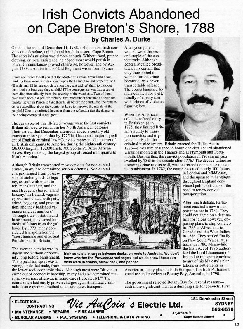 Irish Convicts Abandoned on Cape Breton's Shore, 1788 by Charles A. Burke On the afternoon of December 11,1788, a ship landed Irish con? victs on a desolate, uninhabited beach in eastern Cape Breton. The captain's mission was simple enough. Without food, proper clothing, or local assistance, he hoped most would perish in hours. Circumstances proved otherwise, however, and by Au? gust 1789, a soldier in the 42nd Regiment wrote from Sydney: I must not forget to tell you that the Master of a vessel from Dublin not thinking there were rascals enough upon the Island, thought proper to land 60 male and 18 female convicts upon the coast and left them to pick out their road the best way they could[.] [T]he consequence was that seven of them died immediately from the severity of the weather.... Two of them have since been hanged for robbery; two more under sentence of death for murder, seven in Prison to take their trials before the court...and the remain? der are travelling about the country at large to improve the morals of the people[.] One is comforted however from the reflection that the danger of their being corrupted is not great. ' The survivors of this ill-fated voyage were the last convicts Britain allowed to remain in her North American colonies. Their arrival that December afternoon ended a century old transportation system that by 1775 had become a major ingredi? ent of English criminal law.' Convicts represented a quarter of all British emigrants to America during the eighteenth century (36,000 English, 13,000 Irish, 700 Scottish'). After African slaves, they made up the largest group of forced immigrants to North America." Although Britain transported most convicts for non-capital crimes, many had committed serious offenses. Non-capital charges ranged from posses? sion of stolen goods to biga? my, assault with intent to rob, manslaughter, and the most frequent charge, grand larceny.' In Ireland, vagran? cy was associated with petty crime, begging, and prostitu? tion, and they banished va? grants in great numbers.' Through transportation and banishment, they saved hun? dreds of felons from the gal? lows. By 1773, many con? sidered transportation the "most humane and effectual Punishment [in Britain]."'' Irish convicts in cages between decks, en route to Australia. We don't know whether the Providence had cages, but we do know those con? victs were in chains, below deck, and penned. The average convict was in? digent and without opportu? nity long before banishment. The typical transport was a young, unskilled male, from the lower socioeconomic class. Although most were "driven to crime out of economic hardship, many had also committed rea? sonably serious offenses, in some cajes [repeatedly]."* The courts often laid easily proven charges against habitual crimi? nals as an expedient method to ensure quick transport. After young men, women were the sec? ond staple of the con? vict trade. Although generally called prosti? tutes, it is certain that they transported no women for the crime because it was never a transportable offence. The courts banished fe? male convicts for theft, usually of a petty sort, with crimes of violence figuring low. When the American colonies refused entry to British ships in 1775, they limited Brit? ain's ability to trans? port convicts and trig? gered a crisis in the criminal justice system. Britain enacted the Hulks Act in 1776 • a measure designed to house convicts aboard abandoned warships moored in the Thames and at Plymouth and Ports? mouth. Despite this, the convict population in Provincial jails swelled by 73% in the decade after 1776.' The decade witnesses a soaring crime rate as well, with increased dependence on cap? ital punishment. In 1782, the courts executed nearly 100 felons in London and Middlesex, and the upsurge in hangings 1 throughout England con- ' vinced public officials of the need to renew convict transportation. ' After much debate. Parlia? ment enacted a new trans? portation act in 1784. They could not agree on a destina? tion for felons however, op? posing plans to ship convicts in 1785 to Africa and to Canada and the West Indies in 1786. They settled finally on New South Wales, Aus? tralia, in 1786. Meanwhile, the Irish Act of 1786 author? ized the Lord Lieutenant of Ireland to transport convicts to any of his Majesty's plan? tations or settlements in America or to any place outside Europe.'? The Irish Parliament voted to send convicts to Botany Bay, Australia, in 1790. The government selected Botany Bay for several reasons • each more significant than as a dumping site for convicts. First, 'CC /iu('oU '' Electric Ltd • ELECTRICAL CONTRACTING • MAINTENANCE • REPAIRS • FIRE ALARMS' • BURGLAR ALARMS • P.A. SYSTEMS • TELEPHONE & DATA WIRING 151 Dorchester Street SYDNEY 562-6570 Anywhere in Cape Breton island 13