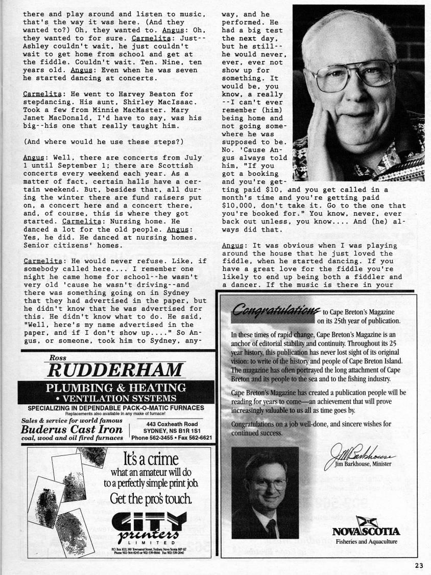 there and play around and listen to music, that's the way it was here. (And they wanted to?) Oh, they wanted to. Angus: Oh, they wanted to for sure. Carmelita: Just-- Ashley couldn't wait, he just couldn't wait to get home from school and get at the fiddle. Couldn't wait. Ten. Nine, ten years old. Angus: Even when he was seven he started dancing at concerts. Carmelita; He went to Harvey Beaton for stepdancing. His aunt, Shirley Maclsaac. Took a few from Minnie MacMaster. Mary Janet MacDonald, I'd have to say, was his big--his one that really taught him. (And where would he use these steps?) Angus: Well, there are concerts from July 1 until September 1; there are Scottish concerts every weekend each year. As a matter of fact, certain halls have a cer? tain weekend. But, besides that, all dur? ing the winter there are fund raisers put on, a concert here and a concert there, and, of course, this is where they got started. Carmelita: Nursing home. He danced a lot for the old people. Angus: Yes, he did. He danced at nursing homes. Senior citizens' homes. Carmelita: He would never refuse. Like, if somebody called here.... I remember one night he came home for school--he wasn't very old 'cause he wasn't driving--and there was something going on in Sydney that they had advertised in the paper, but he didn't know that he was advertised for this. He didn't know what to do. He said, "Well, here's my name advertised in the paper, and if I don't show up...." So An? gus, or someone, took him to Sydney, any- Ross RUDDERHAM PLUMBING & HEATING • VENTILATION SYSTEMS SPECIALIZING IN DEPENDABLE PACK-O-MATIC FURNACES Replacements also available in any make of furnace! Sales & service for world famous 777' Z TT' T" _' , ' . -r I 443 Coxheath Road Buderus Cast Iron sydney,nsbirisi coal, wood and oil fired furnaces ' Phone 562-3455 • Fax 562-6621 Its a crime whatanaimtairwifldo to a perfectly simple print job Get the pros touch way, and he performed. He had a big test the next day, but he still-- he would never, ever, ever not show up for something. It would be, you know, a really --I can't ever remember (him) being home and not going some? where he was supposed to be. No. 'Cause An? gus always told him, "If you got a booking and you're get? ting paid $10, and you get called in a month's time and you're getting paid $10,000, don't take it. Go to the one that you're booked for." You know, never, ever back out unless, you know.... And (he) al? ways did that. Angus: It was obvious when I was playing around the house that he just loved the fiddle, when he started dancing. If you have a great love for the fiddle you're likely to end up being both a fiddler and a dancer. If the music is there in your to Cape Breton's Magazine on its 25th year of publication. In these times of rapid change, Cape Breton's Magazine is an anchor of editorial stability and continuity Throughout its 25 year history, this publication has never lost sight of its original vi'on: to write of the history and people of Cape Breton Island. The magazine has often portrayed the long attachment of Cape Breton and its people to the sea and to the fishing industry. Cape Breton's Magaztoe has created a pubfication people will be reading for years to come • an achievement that will prove increasingly valuable to us all as time goes by Congratulations on a job well-done, and sincere wishes for contiiiueu success. Jim Baridiouse, Minister mobrriA. isKm Fisheries and Aquaculture 23