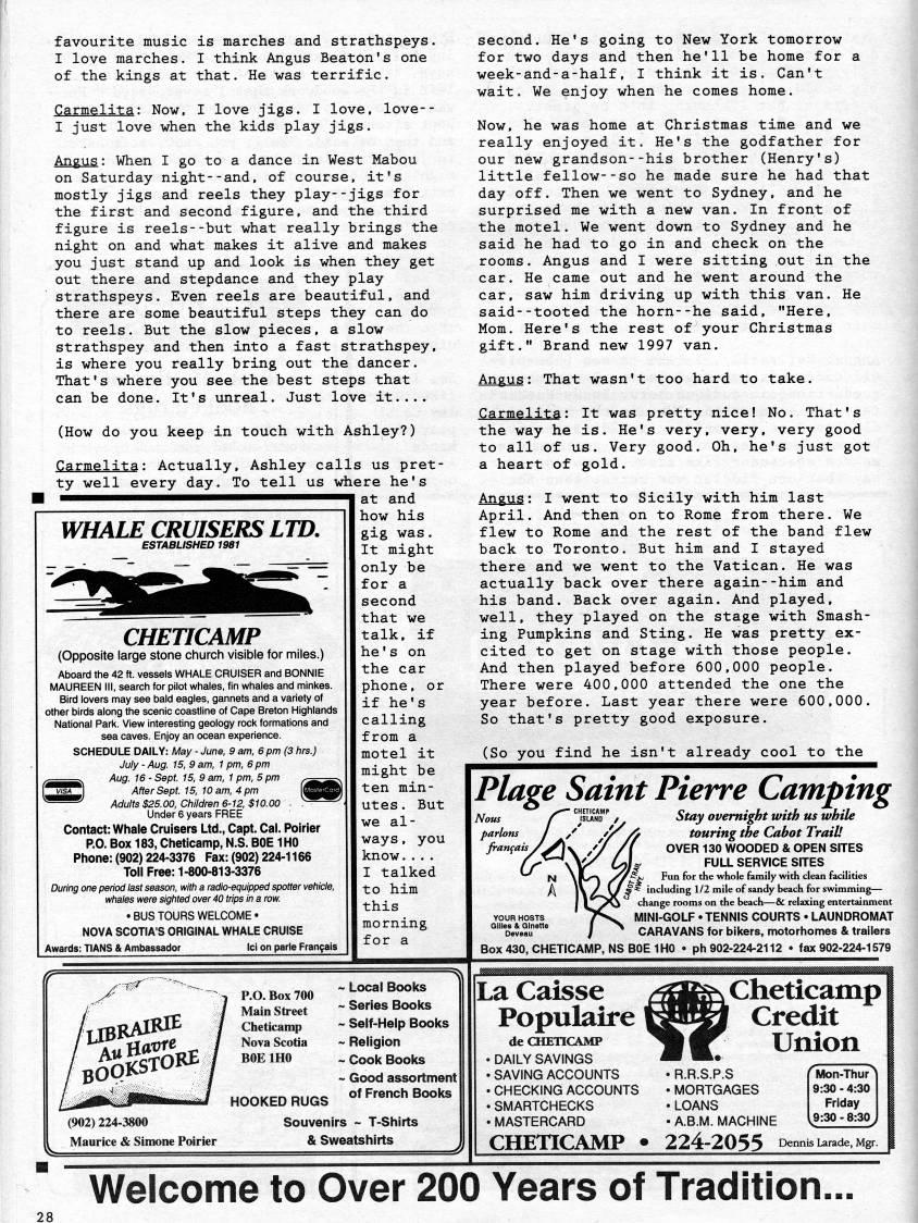 favourite music is marches and strathspeys. I love marches. I think Angus Beaton's one of the kings at that. He was terrific. Carmelita: Now, I love jigs. I love, love-- I just love when the kids play jigs. Angus: When I go to a dance in West Mabou on Saturday night--and, of course, it's mostly jigs and reels they play--jigs for the first and second figure, and the third figure is reels--but what really brings the night on and what makes it alive and makes you just stand up and look is when they get out there and stepdance and they play strathspeys. Even reels are beautiful, and there are some beautiful steps they can do to reels. But the slow pieces, a slow strathspey and then into a fast strathspey, is where you really bring out the dancer. That's where you see the best steps that can be done. It's unreal. Just love it.... (How do you keep in touch with Ashley?) Carmelita: Actually, Ashley calls us pret? ty well every day. To tell us where he's I at and how his gig was. It might only be for a second that we talk, if he's on the car phone, or if he's calling from a motel it might be ten min? utes . But we al? ways , you know.... I talked to him this WHALE CRUISERS LTD. ESTABLISHED 1981 CHETICAMP (Opposite large stone ciiurch visible for miles.) Aboard the 42 ft. vessels WHALE CRUISER and BONNIE MAUREEN III, search for pilot whales, fin whales and minkes. Bird lovers may see bald eagles, gannets and a variety of other birds along the scenic coastline of Cape Breton Highlands National Park. View interesting geology rock formations and sea caves. Enjoy an ocean experience. SCHEDULE DAILY: May - June, 9 am, 6 pm (3 hrs.) July - Aug. 15, 9 am, 1 pm, 6 pm y'''' Aug. 16 - Sept 15, 9 am, 1 pm, 5 pm [ w'j After Sept. 15, 10 am, 4 pm Adults $25.00, Children 6-12, $10.00 Under 6 years FREE Contact: Whale Cruisers Ltd., Capt. Cal. Poirier RO. Box 183, Cheticamp, N.S. BOE IHO Phone: (902) 224-3376 Fax: (902) 224-1166 Toll Free: 1-800-813-3376 During one period last season, with a radio-equipped spotter vehicle, whales were sighted over 40 trips in a row. • BUS TOURS WELCOME • NOVA SCOTIA'S ORIGINAL WHALE CRUISE Awards: TIANS & Ambassador lei or> parle Frangais morning for a second. He's going to New York tomorrow for two days and then he'll be home for a week-and-a-half, I think it is. Can't wait. We enjoy when he comes home. Now, he was home at Christmas time and we really enjoyed it. He's the godfather for our new grandson--his brother (Henry's) little fellow--so he made sure he had that day off. Then we went to Sydney, and he surprised me with a new van. In front of the motel. We went down to Sydney and he said he had to go in and check on the rooms. Angus and I were sitting out in the car. He came out and he went around the car, saw him driving up with this van. He said--tooted the horn--he said, "Here, Mom. Here's the rest of your Christmas gift." Brand new 1997 van. Angus: That wasn't too hard to take. Carmelita: It was pretty nice! No. That's the way he is. He's very, very, very good to all of us. Very good. Oh, he's just got a heart of gold. Angus: I went to Sicily with him last April. And then on to Rome from there. We flew to Rome and the rest of the band flew back to Toronto. But him and I stayed there and we went to the Vatican. He was actually back over there again--him and his band. Back over again. And played, well, they played on the stage with Smash? ing Pumpkins and Sting. He was pretty ex? cited to get on stage with those people. And then played before 600,000 people. There were 400,000 attended the one the year before. Last year there were 600,000. So that's pretty good exposure. (So you find he isn't already cool to the ' (902) 224-3800 Maurice & Simone Poirier ~ Local Books ~ Series Books ~ Self-Help Books ~ Religion ~ Cook Books ~ Good assortment HOOKED RUGS '' French Books Souvenirs ~ T-Shirts & Sweatshirts Plage Saint Pierre Camping cHniciMP '''y overnight with us while touring the Cabot Trail! OVER 130 WOODED & OPEN SITES FULL SERVICE SITES '' Fun for the whole fiunily with clean facilities '* including 1/2 mile of sandy beach for swimining • change rooms on the beach • & relaxing entertainment MINI-GOLF • TENNIS COURTS • LAUNDROMAT CARAVANS for bikers, motorhomes & trailers Box 430, CHETICAMP, NS BOE 1 HO • ph 902-224-2112 • fax 902-224-1579 YOUR HOSTS Gllles & GInette La Caisse Populaire Cheticamp Credit Union de CHETICAMP . DAILY SAVINGS • SAVING ACCOUNTS • R.R.S.P.S . CHECKING ACCOUNTS • MORTGAGES .SMARTCHECKS • LOANS . MASTERCARD • A.B.M. MACHINE CHETICAMP • 224-2055 Penr'lsUradcMgr. 'Mon-Thur' 9:30 - 4:30 Friday 9:30 - 8:30 Welcome to Over 200 Years of Tradition... 28