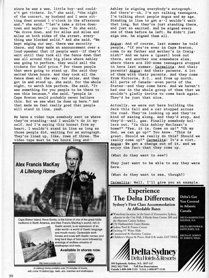 since he was a wee, little boy--and could? n't get tickets. So," she said, "the night of the concert, my husband and I were sit? ting down around 1 o'clock in the afternoon and," she said, "'Let's take a drive down? town and maybe--', you know." So she said, "We drove down, and for miles and miles and miles on both sides of the street, every? thing was blocked solid." And she said, "We kept edging our way, there was security there, and they made an annotmcement over a loud-speaker that if people want--if they'd wait until they took all the fence down that was all around this big place where Ashley was going to perform, they would sell the tickets for half price." For these people that were going to stand up. She said they waited three hours. And they took all the fence down all the way, for miles, and they got in and stood up, she said, for the whole night, to watch him perform. She said, "It was something for you people to be there to see this because," she said, "people in Cape Breton would probably never believe this. But we see what he does up here." And that made me feel really good that people will stand in line, yeah. We have a video tape somebody sent us where they're standing--and I wouldn't do it my? self. And I'm saying this honest from my heart, I wouldn't stand in line as long as those people did, waiting for an autograph. They're lined up, like, rows of three. The video tape must be two hours long and-- Cape Breton Island, Nova Scotia, is the home of one of the great fiddle traditions in North America, and Alex Francis MacKay's sound, rich in Gaelic accent, is an expression of an older world • a world of Gaelic language and mouth music; Clydesdale work horses and cows with Gaelic names; and long hard days of farm work followed by I evenings of endless streams of Istrathspeys and reels. Available in stores now. http:www.rounder.c( A Lifelong Home contains over 75 minutes of music, with some 76 distinct jigs, reels, airs, marches and strathspeys. Ashley is signing everybody's autograph. And there's--oh, I'm not talking teenagers, I'm talking about people Angus and my age. Standing in line to get a--I wouldn't wait that long. But they're just standing there, and just so excited. And he signed every one of them before he left. He didn't just sign one, he signed them all. Angus: And of course, last summer he told people, "If you're ever in Cape Breton, come to my father and mother's in Creig? nish!" And we have a (guest) book out there, and another one somewhere else, where there are 200-some teenagers stopped in here last summer. Carmelita: And their parents! Angus: And their parents. A lot of them with their parents. And they come from Victoria, B.C., and from up north. All parts of Canada--even parts of the States--and they come here. And we haven't had one in the whole group of them that we wouldn't gladly invite to come back again. They'd be just that nice. Actually, we were out here building the deck this fall and a car stopped across the road. They're looking up and they're kind of easing along. And they'd stop, and they'd--well, gee. Finally somebody hol? lers out, "Is this Ashley Maclsaac's home?" "Yes, it is. Come on up!" "Oh my God, we can go up!" You know. "This is great. Should we really do this? Should we really come up?" Carmelita: It's a riot. Angus: We get a charge out of it, and we enjoy the fact that they come up. (What do they want to see?) They just want to be able to say they were here. (What do they want to see, though?) Carmelita: Well, I'll give you an example. Experience The Delta Difference Sydney*s First Class Accommodation At Affordable Rates 'Waterfront location, in the heart of Downtown Sydney, adjacent to the City Hall, 3 blocks from Centre 200 and the Sheraton Casino Sydney. ' 152 Harbourview Guest Rooms. A Indoor Pool & Fitness Centre. A Exciting 55' Water Slide. A Continental & Maritime Cuisine. A Children's Menus & Prices, Kids 6 & under EAT FREE. DellaSydney Delta Hotels & Resorts 300 Esplanade, Sydney, N.S. BlP 1A7 (902) 562-7500 Toll Free Reservations Canada 1-800-268-1133 U.SA. 1-800-877-1133 30