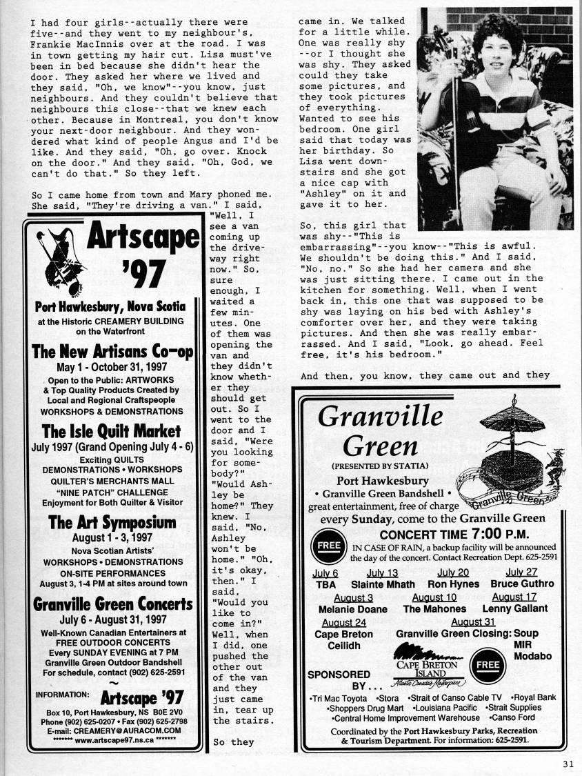 I had four girls--actually there were five--and they went to my neighbour's, Frankie Maclnnis over at the road. I was in town getting my hair cut. Lisa must've been in bed because she didn't hear the door. They asked her where we lived and they said, "Oh, we know"--you know, just neighbours. And they couldn't believe that neighbours this close--that we knew each ??other. Because in Montreal, you don't know your next-door neighbour. And they won? dered what kind of people Angus and I'd be like. And they said, "Oh, go over. Knock on the door." And they said, "Oh, God, we can't do that." So they left. So I came home from town and Mary phoned me. She said, "They're driving a van." I said. Artscape '97 Port Hawkesbury, Nova Scotia at the Historic CREAMERY BUILDING on the Waterfront The New Artisans Co-op IViayl-October 31,1997 Open to the Public: ARTWORKS & Top Quality Products Created by Local and Regional Craftspeople WORKSHOPS & DEMONSTRATIONS The Isle Quilt Market July 1997 (Grand Opening July 4 - 6) Exciting QUILTS DEMONSTRATIONS • WORKSHOPS QUILTER'S MERCHANTS MALL "NINE PATCH" CHALLENGE Enjoyment for Both Quilter & Visitor The Art Symposium August 1-3,1997 Nova Scotian Artists' WORKSHOPS • DEMONSTRATIONS ON-SITE PERFORMANCES August 3,1-4 PM at sites around town Granville Green Concerts July 6-August 31,1997 Weil-Known Canadian Entertainers at FREE OUTDOOR CONCERTS Every SUNDAY EVENING at 7 PM Granville Green Outdoor Bandshell For schedule, contact (902) 625-2591 INFORMATION: Artscape '97 Box 10, Port Hawkesbury, NS BOE 2V0 Phone (902) 625-0207 • Fax (902) 625-2798 E-mail: [email protected] ******* www.artscape97.ns.ca ******* Well, I see a van coming up the drive? way right now." So, sure enough, I waited a few min? utes . One of them was opening the van and they didn't know wheth? er they should get out. So I went to the door and I said, "Were you looking for some? body?" "Would Ash? ley be home-?" They knew. I said, "No, Ashley won't be home." "Oh, it's okay, then." I said, "Would you like to come in?" Well, when I did, one pushed the other out of the van and they just came in, tear up the stairs. So they came in. We talked for a little while. One was really shy --or I thought she was shy. They asked could they take some pictures, and they took pictures of everything. Wanted to see his bedroom. One girl said that today was her birthday. So Lisa went down? stairs and she got a nice cap with "Ashley" on it and gave it to her. So, this girl that was shy--"This is embarrassing"--you know--"This is awful. We shouldn't be doing this." And I said, "No, no." So she had her camera and she was just sitting there. I came out in the kitchen for something. Well, when I went back in, this one that was supposed to be shy was laying on his bed with Ashley's comforter over her, and they were taking pictures. And then she was really embar? rassed. And I said, "Look, go ahead. Feel free, it's his bedroom." And then, you know, they came out and they Granville Green (PRESENTED BY STATIA) Port Hawkesbury • Granville Green Bandshell • great entertainment, free of charge every Sunday, come to the Granville Green CONCERT TIME 7:00 P.M. IN CASE OF RAIN, a backup facility will be announced the day of the concert. Contact Recreation Dept. 625-2591 Julv13 July 20 July 27 Slainte Mhath Ron Hynes Bruce Guthro August 3 August 10 August 17 Melanie Doane The Mahones Lenny Gallant August 31 Granville Green Closing: Soup MIR ,_. Modabo Cape Breton Island July 6 TBA August 24 Cape Breton Ceilidh SPONSORED BY. • Tri Mac Toyota Stora -Strait of Canso Cable TV 'Royal Bank • Shoppers Drug Mart 'Louisiana Pacific -Strait Supplies • Central Home Improvement Warehouse 'Canso Ford Coordinated by the Port Hawkesbury Parks, Recreation & Tourism Department. For information: 625-2591.