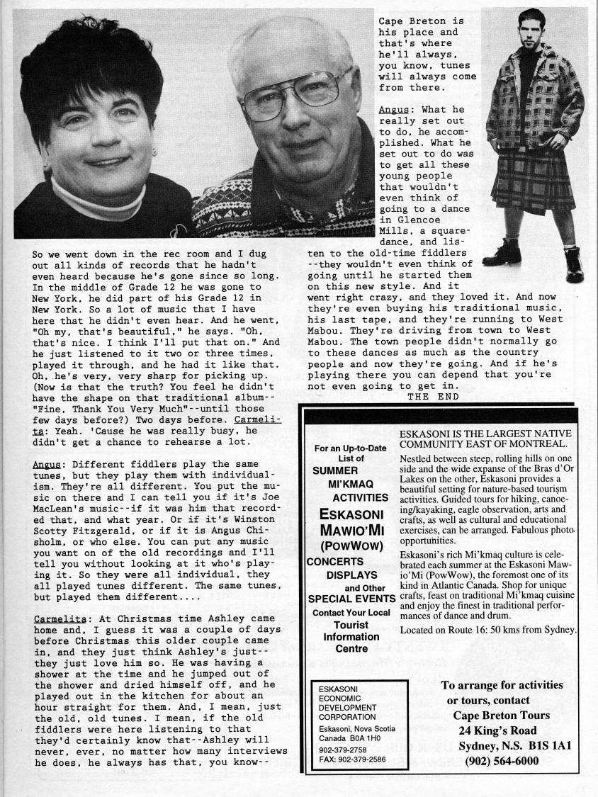 Published by Ronald Caplan on 1997/6/1 (284 reads)So we went down in the rec room and I dug out all kinds of records that he hadn't even heard because he's gone since so long. In the middle of Grade 12 he was gone to New York, he did part of his Grade 12 in New York. So a lot of music that I have here that he didn't even hear. And he went, "Oh my, that's beautiful," he says. "Oh, that's nice. I think I'll put that on." And he just listened to it two or three times, played it through, and he had it like that. Oh, he's very, very sharp for picking up. (Now is that the truth? You feel he didn't have the shape on that traditional album-- "Fine, Thank You Very Much"--until those few days before?) Two days before. Carmeli- ia: Yeah. 'Cause he was really busy, he didn't get a chance to rehearse a lot. Angus: Different fiddlers play the same times, but they play them with individual? ism. They're all different. You put the mu? sic on there and I can tell you if it's Joe MacLean's music--if it was him that record? ed that, and what year. Or if it's Winston Scotty Fitzgerald, or if it is Angus Chi? sholm, or who else. You can put any music you want on of the old recordings and I'll tell you without looking at it who's play? ing it. So they were all individual, they all played tunes different. The same tunes, but played them different.... Carmelita: At Christmas time Ashley came home and, I guess it was a couple of days before Christmas this older couple came in, and they just think Ashley's just-- they just love him so. He was having a shower at the time and he jumped out of the shower and dried himself off, and he played out in the kitchen for about an hour straight for them. And, I mean, just the old, old tunes. I mean, if the old fiddlers were here listening to that they'd certainly know that--Ashley will never, ever, no matter how many interviews he does, he always has that, you know-- Cape Breton is his place and that's where he'll always, you know, tunes will always come from there. Angus: What he really set out to do, he accom? plished. What he set out to do was to get all these young people that wouldn't even think of going to a dance in Glencoe Mills, a square- dance, and lis? ten to the old-time fiddlers --they wouldn't even think of going until he started them on this new style. And it went right crazy, and they loved it. And now they're even buying his traditional music, his last tape, and they're running to West Mabou. They're driving from town to West Mabou. The town people didn't normally go to these dances as much as the country people and now they're going. And if he's playing there you can depend that you're not even going to get in. THE END For an Up-to-Date List of SUMMER MI'KMAQ ACTIVITIES Eskasoni Mawio'Mi (POWWOW) CONCERTS DISPLAYS and Other SPECIAL EVENTS Contact Your Local Tourist Information Centre ESKASONI IS THE LARGEST NATIVE COMMUNITY EAST OF MONTREAL. Nestled between steep, rolling hills on one side and the wide expanse of the Bras d'Or Lakes on the other, Eskasoni provides a beautiful setting for nature-based tourism activities. Guided tours for hiking, canoe? ing/kayaking, eagle observation, arts and crafts, as well as cultural and educational exercises, can be arranged. Fabulous photo- opportunities. Eskasoni's rich Mi'kmaq culture is cele? brated each summer at the Eskasoni Maw? io'Mi (PowWow), the foremost one of its kind in Atlantic Canada. Shop for unique crafts, feast on traditional Mi'kmaq cuisine and enjoy the finest in traditional perfor? mances of dance and drum. Located on Route 16: 50 kms from Sydney. ESKASONI ECONOMIC DEVELOPMENT CORPORATION Eskasoni, Nova Scotia Canada BOA IHO 902-379-2758 FAX: 902-379-2586 To arrange for activities or tours, contact Cape Breton Tours 24 King's Road Sydney, N.S. BIS lAl (902) 564-6000