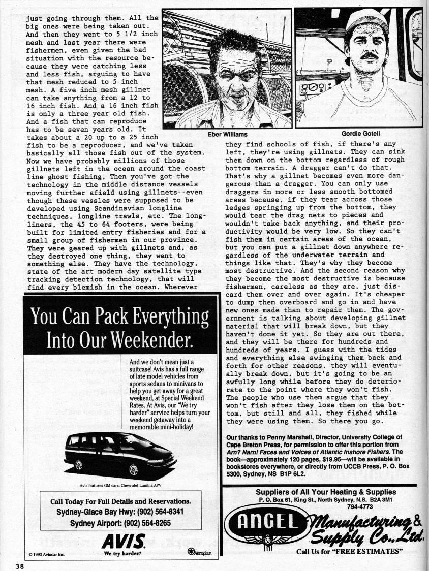 Published by Ronald Caplan on 1997/6/1 (320 reads)just going through them. All the big ones were being taken out. And then they went to 5 1/2 inch mesh and last year there were fishermen, even given the bad situation with the resource be? cause they were catching less and less fish, arguing to have that mesh reduced to 5 inch mesh. A five inch mesh gillnet can take anything from a 12 to 16 inch fish. And a 16 inch fish is only a three year old fish. And a fish that can reproduce has to be seven years old. It takes about a 20 up to a 25 inch Eber Williams fish to be a reproducer, and we've taken basically all those fish out of the system. Now we have probably millions of those gillnets left in the ocean around the coast line ghost fishing. Then you've got the technology in the middle distance vessels moving further afield using gillnets--even though these vessles were supposed to be developed using Scandinavian longline techniques, longline trawls, etc. The long- liners, the 45 to 64 footers, were being built for limited entry fisheries and for a small group of fishermen in our province. They were geared up with gillnets and, as they destroyed one thing, they went to something else. They have the technology, state of the art modern day satellite type tracking detection technology, that will find every blemish in the ocean. Wherever Gordie Gotell You Can Pack Everythini Into Our Weekender. And we don't mean just a suitcase! Avis has a full range of late model vehicles from sports sedans to minivans to help you get away for a great weekend, at Special Weekend Rates. At Avis, our "We try harder" service helps turn your weekend getaway into a memorable mini-holiday! Avis features GM cars. Chevrolet Lumina APV Call Today For Full Details and Reservations. Sydney-Glace Bay Hwy: (902) 564-8341 Sydney Airport: (902) 564-8265 ?? 1993 Aviscar Inc. AViS We try harder.* they find schools of fish, if there's any left, they're using gillnets. They can sink them down on the bottom regardless of rough bottom terrain. A dragger can't do that. That's why a gillnet becomes even more dan? gerous than a dragger. You can only use draggers in more or less smooth bottomed areas because, if they tear across those ledges springing up from the bottom, they would tear the drag nets to pieces and wouldn't take back anything, and their pro? ductivity would be very low. So they can't fish them in certain areas of the ocean, but you can put a gillnet down anywhere re? gardless of the underwater terrain and things like that. They's why they become most destructive. And the second reason why they become the most destructive is because fishermen, careless as they are, just dis? card them over and over again. It's cheaper to dump them overboard and go in and have new ones made than to repair them. The gov? ernment is talking about developing gillnet material that will break down, but they haven't done it yet. So they are out there, and they will be there for hundreds and hundreds of years. I guess with the tides and everything else swinging them back and forth for other reasons, they will eventu? ally break down, but it's going to be an awfully long while before they do deterio? rate to the point where they won't fish. The people who use them argue that they won't fish after they lose them on the bot? tom, but still and all, they fished while they were using them. So there you go. Our thanks to Penny Marshall, Director, University College of Cape Breton Press, for permission to offer this portion from Am? Narn! Faces and Voices of Atlantic insiiore Fishers. The book • approximately 120 pages, $19.95 • will be available In bookstores everywhere, or directly from UCCB Press, P. O. Box 5300, Sydney, NS B1P6L2. Suppliers of All Your Heating & Supplies P.O. Box 61. King St., North Sydney, N.S. B2A3M1 794-4773 Call Us for "FREE ESTIMATES" 38