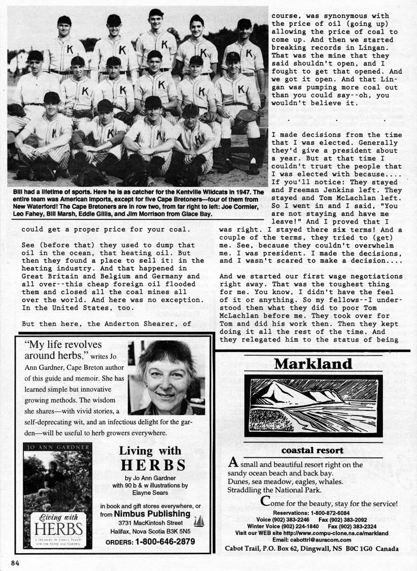 Bill had a lifetime of sports, liere he Is as catcher for the Kentvilie Wildcats In 1947. The entire team was American Imports, except for five Cape Bretoners • four of them from New Waterford! The Cape Bretoners are in row two, from far right to left: Joe Cormier, Leo Fahey, Bill Marsh, Eddie Gillis, and Jim Morrison from Giace Bay. could get a proper price for your coal. See (before that) they used to dump that oil in the ocean, that heating oil. But then they found a place to sell it: in the heating industry. And that happened in Great Britain and Belgium and Germany and all over--this cheap foreign oil flooded them and closed all the coal mines all over the world. And here was no exception. In the United States, too. But then here, the Anderton Shearer, of "My life revolves around herbs," writes jo Ann Gardner, Cape Breton author of this guide and memoir. She has learned simple but innovative growing methods. The wisdom she shares • with vivid stories, a self-deprecating wit, and an infectious delight for the gar? den • will be useful to herb growers everywhere. Living with HERBS by Jo Ann Gardner with 90 b & w illustrations by Elayne Sears in book and gift stores everywhere, or from Nimbus Publishing . 3731 MacKintosh Street IM Halifax, Nova Scotia B3K 5N5 ORDERS: 1-800-646-2879 course, was synonymous with the price of oil (going up) allowing the price of coal to come up. And then we started breaking records in Lingan. That was the mine that they said shouldn't open, and I fought to get that opened. And we got it open. And that Lin- " gan was pumping more coal out than you could say--oh, you wouldn't believe it. I made decisions from the time that I was elected. Generally they'd give a president about a year. But at that time I couldn't trust the people that I was elected with because.... If you'll notice: They stayed and Freeman Jenkins left. They stayed and Tom McLachlan left. So I went in and I said, "You are not staying and have me leave!" And I proved that I was right. I stayed there six terms! And a couple of the terms, they tried to (get) me. See, because they couldn't overwhelm me. I was president. I made the decisions, and I wasn't scared to make a decision.... And we started our first wage negotiations right away. That was the toughest thing for me. You know, I didn't have the feel of it or anything. So my fellows--I under? stood then what they did to poor Tom McLachlan before me. They took over for Tom and did his work then. Then they kept doing it all the rest of the time. And they relegated him to the status of being Markland coastal resort Pi. small and beautiful resort right on the sandy ocean beach and back bay. Dunes, sea meadow, eagles, whales. Straddling the National Park. V'ome for the beauty, stay for the service! Reservations: 1-800-872-6084 Voice (902) 383-2246 Fax (902) 383-2092 Winter Voice (902) 224-1840 Fax (902) 383-2324 Visit our WEB site http://www.compu-clone.ns.ca/markland Email: [email protected] Cabot Trail, P.O. Box 62, Dingwall, NS BOC IGO Canada 84