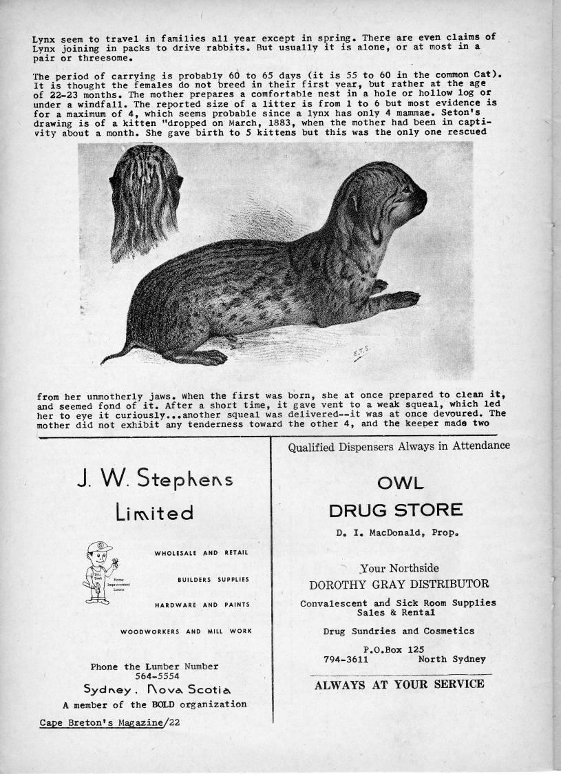 Published by Ronald Caplan on 1973/1/1 (627 reads)Lynx seem to travel in families all year except in spring. There are even claims of Lynx joining in packs to drive rabbits. But usually it is alone, or at most in a pair or threesome. The period of carrying is probably 60 to 65 days (it is 55 to 60 in the common Cat). It is thought the females do not breed in their first year, but rather at the age of 22-23 months. The mother prepares a comfortable nest in a hole or hollow log or under a windfall. The reported size of a litter is from 1 to 6 but most evidence is for a maximum of 4, which seems probable since a lynx has only 4 mammae. Seton's drawing is of a kitten "dropped on March, 1883, when the mother had been in capti? vity about a month. She gave birth to 5 kittens but this was the only one rescued from her unmotherly jaws, when the first was born, she at once prepared to clean it, and seemed fond of it. After a short time, it gave vent to a weak squeal, which led her to eye it curiously...another squeal was delivered • it was at once devoured. The mother did not exhibit any tenderness toward the other 4, and the keeper made two J W. StepKer s Lircvited 'r'l WHOLESALE AND RETAIL CSV'''Ita "ov"mem BUILDERS SUPPLIES "''''' HARDWARE AND PAINTS WOODWORKERS AND MILL WORK Phone the Lumber Number 564-5554 Sydrxey. IXo vev Scotidv A member of the BOLD organization Qualified Dispensers Always in Attendan OWL DRUG STORE D, I. MacDonald, Propo Jour Northside DOROTHY GRAY DISTRIBUTOR Convalescent and Sick Room Supplies Sales & Rental Drug Sundries and Cosmetics P.O.Box 125 794-3611 North Sydney ALWAYS AT YOUR SERVICE Cape Breton's Magazine/22