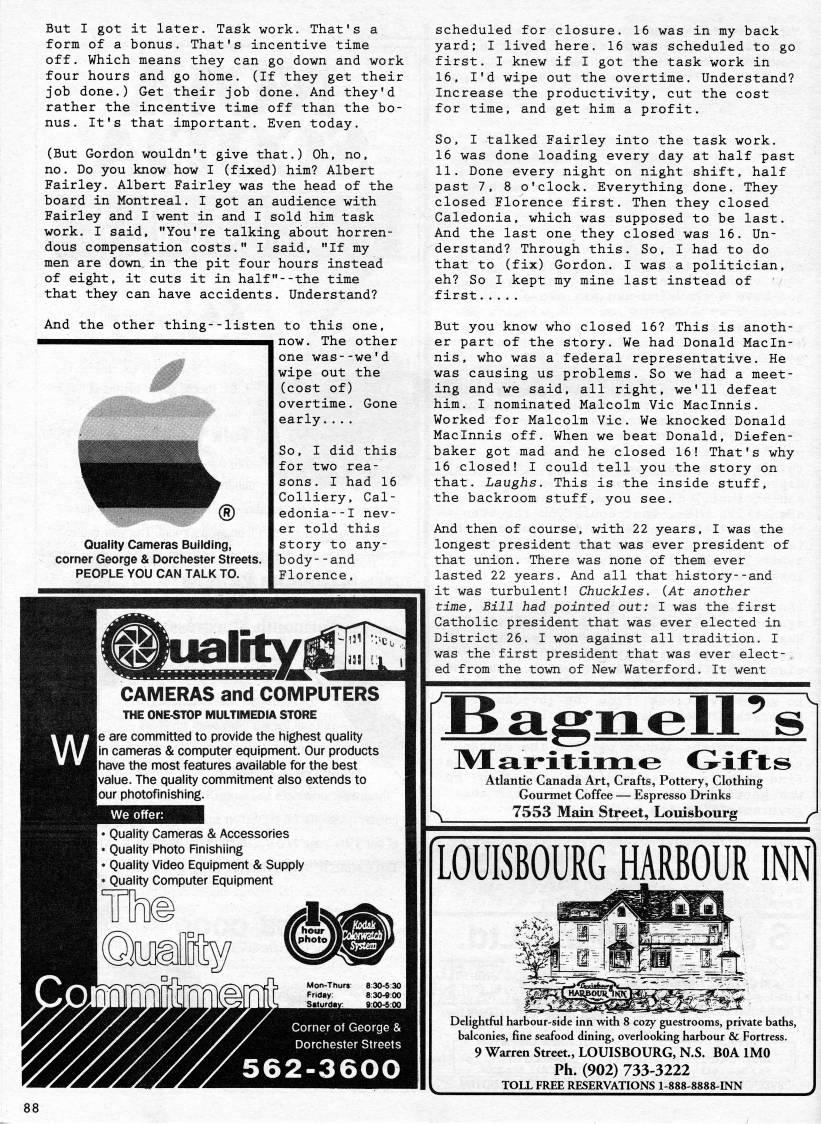But I got it later. Task work. That's a form of a bonus. That's incentive time off. Which means they can go down and work four hours and go home. (If they get their job done.) Get their job done. And they'd rather the incentive time off than the bo? nus. It's that important. Even today. (But Gordon wouldn't give that.) Oh, no, no. Do you know how I (fixed) him? Albert Fairley. Albert Fairley was the head of the board in Montreal. I got an audience with Fairley and I went in and I sold him task work. I said, "You're talking about horren? dous compensation costs." I said, "If my men are down in the pit four hours instead of eight, it cuts it in half"--the time that they can have accidents. Understand? scheduled for closure. 16 was in my back yard; I lived here. 16 was scheduled to go first. I knew if I got the task work in 16, I'd wipe out the overtime. Understand? Increase the productivity, cut the cost for time, and get him a profit. So, I talked Fairley into the task work. 16 was done loading every day at half past 11. Done every night on night shift, half past 7, 8 o'clock. Everything done. They closed Florence first. Then they closed Caledonia, which was supposed to be last. And the last one they closed was 16. Un? derstand? Through this. So, I had to do that to (fix) Gordon. I was a politician, eh? So I kept my mine last instead of first And the other thing- Quality Cameras Building, corner George & Dorchester Streets. PEOPLE YOU CAN TALK TO. • listen to this one, now. The other one was--we'd wipe out the (cost of) overtime. Gone early.... So, I did this for two rea? sons. I had 16 Colliery, Cal? edonia- -I nev? er told this story to any? body- -and Florence, But you know who closed 16? This is anoth? er part of the story. We had Donald Macln? nis, who was a federal representative. He was causing us problems. So we had a meet? ing and we said, all right, we'll defeat him. I nominated Malcolm Vic Maclnnis. Worked for Malcolm Vic. We knocked Donald Maclnnis off. When we beat Donald, Diefen- baker got mad and he closed 16! That's why 16 closed! I could tell you the story on that. Laughs. This is the inside stuff, the backroom stuff, you see. And then of course, with 22 years, I was the longest president that was ever president of that union. There was none of them ever lasted 22 years. And all that history--and it was turbulent! Chuckles. (At another time. Bill had pointed out: I was the first Catholic president that was ever elected in District 26. I won against all tradition. I was the first president that was ever elect-. ed from the town of New Waterford. It went Atlantic Canada Art, Crafts, Pottery, Clothing Gourmet Coffee • Espresso Drinks ' 7553 Main Street, Louisbourg ' LOUISBOURG HARBOUR INN Delightful harbour-side inn with 8 co2y guestrooms, private baths, balconies, fine seafood dining, overlooking harbour & Fortress. 9 Warren Street., LOUISBOURG, N.S. BOA IMO Ph. (902) 733-3222 TOIX FREE RESERVATIONS 1-888-8888-INN