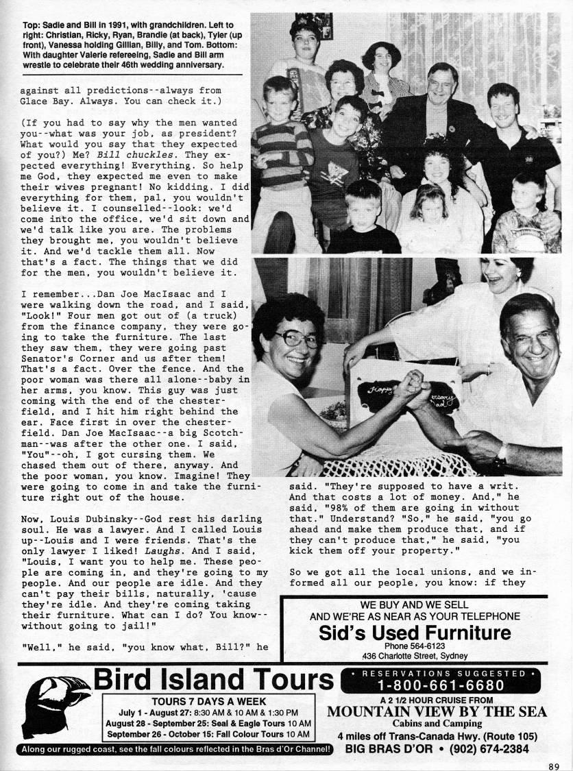 Top: Sadie and Bill in 1991, with grandchildren. Left to right: Christian, Ricky, Ryan, Brandie (at back), Tyler (up front), Vanessa holding Gillian, Billy, and Tom. Bottom: With daughter Valerie refereeing, Sadie and Bill arm wrestle to celebrate their 46th wedding anniversary. against all predictions--always from Glace Bay. Always. You can check it.) (If you had to say why the men wanted you--what was your job, as president? What would you say that they expected of you?) Me? Bill chuckles. They ex? pected everything! Everything. So help me God, they expected me even to make their wives pregnant! No kidding. I did everything for them, pal, you wouldn't believe it. I counselled--look: we'd come into the office, we'd sit down and we'd talk like you are. The problems they brought me, you wouldn't believe it. And we'd tackle them all. Now that's a fact. The things that we did for the men, you wouldn't believe it. I remember...Dan Joe Maclsaac and I were walking down the road, and I said, "Look!" Four men got out of (a truck) from the finance company, they were go? ing to take the furniture. The last they saw them, they were going past Senator's Corner and us after them! That's a fact. Over the fence. And the poor woman was there all alone--baby in her arms, you know. This guy was just coming with the end of the chester? field, and I hit him right behind the ear. Face first in over the chester? field. Dan Joe Maclsaac--a big Scotch? man- -was after the other one. I said, "You"--oh, I got cursing them. We chased them out of there, anyway. And the poor woman, you know. Imagine! They were going to come in and take the furni? ture right out of the house. Now, Louis Dubinsky--God rest his darling soul. He was a lawyer. And I called Louis up--Louis and I were friends. That's the only lawyer I liked! Laughs. And I said, "Louis, I want you to help me. These peo? ple are coming in, and they're going to my people. And our people are idle. And they can't pay their bills, naturally, 'cause they're idle. And they're coming taking their furniture. What can I do? You know-- without going to jail!" "Well," he said, "you know what. Bill?" he said. "They're supposed to have a writ. And that costs a lot of money. And," he said, "98% of them are going in without that." Understand? "So," he said, "you go ahead and make them produce that, and if they can't produce that," he said, "you kick them off your property." So we got all the local unions, and we in? formed all our people, you know: if they WE BUY AND WE SELL AND WE'RE AS NEAR AS YOUR TELEPHONE Sid's Used Furniture Phone 564-6123 436 Charlotte Street, Sydney Bird Island Tours ESERVATIONS SUGGESTED 1-800-661-6680 TOURS 7 DAYS A WEEK July 1 - August 27: 8:30 AM & 10 AM & 1:30 PM August 28 - September 25: Seal & Eagle Tours 10 AM September 26 - October 15: Fail Colour Tours 10 AM Along our rugged co [[BQBB A 2 1/2 HOUR CRUISE FROM MOUNTAIN VIEW BY THE SEA Cabins and Camping 4 miles off Trans-Canada Hwy. (Route 105) Sd BIG BRAS D'OR • (902) 674-2384 89