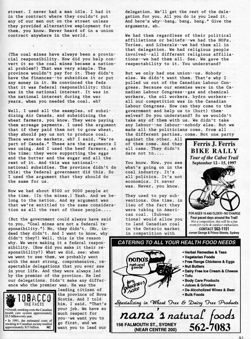 street. I never had a man idle. I had it in the contract where they couldn't put any of our men out on the street unless they provided alternative employment for them, you know. Never heard of in a union contract anywhere in the world. (The coal mines have always been a provin? cial responsibility. How did you help con? vert it so the coal mines became a nation? al problem?) That was very simple. The province wouldn't pay for it. They didn't have the finances--to subsidize it or put any money in it. We convinced the feds that it was federal responsibility; this was in the national interest. It was in the national interest during the war years, when you needed the coal, eh? Well, I used all the examples, of subsi? dizing Air Canada, and subsidizing the wheat farmers, you know. They were paying them acreage payments. I used the argument that if they paid them not to grow wheat, they should pay us not to produce coal. There were no markets, eh? I said, "We're part of Canada." These are the arguments I was using. And I used the beef farmers, at the time; they were supporting the eggs and the butter and the sugar and all the rest of it. And this was national-- national subsidies. The province didn't do this; the federal government did this. So I used the argument that they should do the same for us. Now we had about 8500 or 9000 people at the time. (In the mines.) Yeah. And we be? long to the nation. And my argument was that we're entitled to the same considera? tion as all the rest of these people.... (But the government could always have said to you, "Coal mines are not a federal re? sponsibility.") No, they didn't. (No, in? deed they didn't. And I want to know, why didn't they?) Well, this is the reason why. We were making it a federal respon? sibility. (How did you make it their re? sponsibility?) What we did, see: when we went to see them, we probably went with the most strong, comprehensive, re? spectable delegations that you ever saw in your life. And they were always led by the premier of the province. He led our delegations. Didn't make any differ? ence who the premier was. He was the leading citizen of tT n D i'l C C l ''? province of Nova luoALLu Scotia. And I told THE FACTS him, I said, "That's your job. We have so much respect for you--we want you to go first, and we want you to lead our Overall, smoking costs the Canadian health care system approximately $3.5 billion every year. • In 1991, the estimated costs of smoking to Canadian society totalled approximately $15 billion. NC delegation. We'll get the rest of the dele? gation for you. All you do is you lead it. And here's why--bang, bang, bang." Give the arguments, eh. We had them regardless of their political affiliations or beliefs--we had the NDPs, Tories, and Liberals--we had them all in that delegation. We had religious people involved--all different religious affilia? tions --we had them all. See. We gave the respectability to it. You understand? But we only had one union--us. Nobody else. We didn't want them. That's why I pulled us out of the Canadian Labour Con? gress. Because our enemies were in the Ca? nadian Labour Congress--gas and chemical workers, the oil workers, hydro workers-- all our competition was in the Canadian Labour Congress. How can they come to the government and help us to (hurt) them? selves? Do you understand? So we wouldn't take any of them with us. We didn't take any labour--no labour--nobody else. But we made all the politicians come, from all the different parties, come. Not one party against the other. All of them come. And they all came. They didn't dare not to... . You know. Now, you see what's going on in the coal industry. It's all politics. It's not economics. It never was. Never, you know. They used to pay sub? ventions. One time, in lieu of the fact they were taking in Ameri? can coal. (Subven? tions) would allow you to land Canadian coal in the Ontario market in competition with Ferris J. Ferris BIKE RALLY Tour of the Cabot Trail September 12 -15,1997 FOR AGES 16 AND OLDER • NO CHARGE Four paced days around the Trail! Not a competition, this will be a fun event for cycle & outdoor enthusiasts. CONTACT 562-1151 corner George & Prince Streets, Sydney CATERING TO ALL YOUR HEALTH FOOD NEEDS • Herbal Remedies & Teas • Vegetarian Foods • Free Range Cliickens & Eggs • Nut Butters • Dairy Free Ice Cream & Ciieese • Tofu • Body Care Products • Juices & Grinders • De-Alcohiolized Wines & Beer • Bulk Foods tSbzdxLUzLna in nA/h??cU 'i • ? ??r U'aixu 't • ? '3oaiicts. J2CLJ2CL 1 natural! foods. 156 FALMOUTH ST., SYDNEY EZii' h(9.'X (NEAR CENTRE 200) 3Dibf- / 300