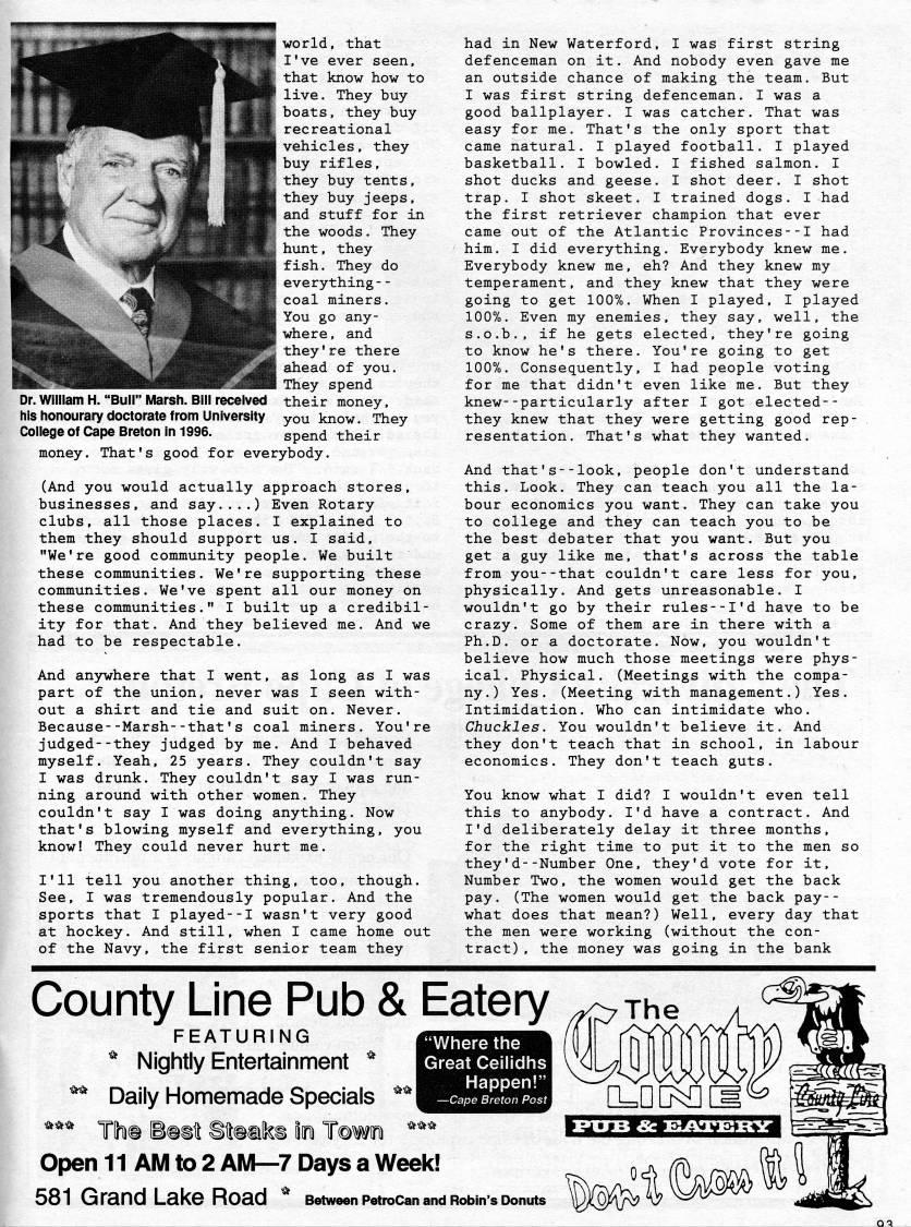 Dr. William H. "Bull" Marsh. Bill received his honourary doctorate from University College of Cape Breton In 1996. world, that I've ever seen, that know how to live. They buy boats, they buy recreational vehicles, they buy rifles, they buy tents, they buy jeeps, and stuff for in the woods. They hunt, they fish. They do everything-- coal miners. You go any? where , and they're there ahead of you. They spend their money, you know. They spend their money. That's good for everybody. (And you would actually approach stores, businesses, and say....) Even Rotary clubs, all those places. I explained to ' them they should support us. I said, I "We're good community people. We built these communities. We're supporting these communities. We've spent all our money on these communities." I built up a credibil? ity for that. And they believed me. And we had to be respectable. And anywhere that I went, as long as I was part of the union, never was I seen with? out a shirt and tie and suit on. Never. Because--Marsh--that's coal miners. You're judged--they judged by me. And I behaved myself. Yeah, 25 years. They couldn't say I was drunk. They couldn't say I was run? ning around with other women. They couldn't say I was doing anything. Now that's blowing myself and everything, you know! They could never hurt me. I'll tell you another thing, too, though. See, I was tremendously popular. And the sports that I played--I wasn't very good at hockey. And still, when I came home out of the Navy, the first senior team they had in New Waterford, I was first string defenceman on it. And nobody even gave me an outside chance of making the team. But I was first string defenceman. I was a good ballplayer. I was catcher. That was easy for me. That's the only sport that came natural. I played football. I played basketball. I bowled. I fished salmon. I shot ducks and geese. I shot deer. I shot trap. I shot skeet. I trained dogs. I had the first retriever champion that ever came out of the Atlantic Provinces--I had him. I did everything. Everybody knew me. Everybody knew me, eh? And they knew my temperament, and they knew that they were going to get 100%. When I played, I played 100%. Even my enemies, they say, well, the s.o.b., if he gets elected, they're going to know he's there. You're going to get 100%. Consequently, I had people voting for me that didn't even like me. But they knew--particularly after I got elected-- they knew that they were getting good rep? resentation. That's what they wanted. And that's--look, people don't understand this. Look. They can teach you all the la? bour economics you want. They can take you to college and they can teach you to be the best debater that you want. But you get a guy like me, that's across the table from you--that couldn't care less for you, physically. And gets unreasonable. I wouldn't go by their rules--I'd have to be crazy. Some of them are in there with a Ph.D. or a doctorate. Now, you wouldn't believe how much those meetings were phys? ical. Physical. (Meetings with the compa? ny.) Yes. (Meeting with management.) Yes. Intimidation. Who can intimidate who. Chuckles. You wouldn't believe it. And they don't teach that in school, in labour economics. They don't teach guts. You know what I did? I wouldn't even tell this to anybody. I'd have a contract. And I'd deliberately delay it three months, for the right time to put it to the men so they'd--Number One, they'd vote for it. Number Two, the women would get the back pay. (The women would get the back pay-- what does that mean?) Well, every day that the men were working (without the con? tract) , the money was going in the bank County Line Pub & Eatery FEATURING * Nightly Entertainment ' Daily Homemade Specials ' *** Tte BsM Steaks 38' Towm ''* Open 11 AM to 2 AM • 7 Days a Week! 581 Grand Lake Road * "Where the Great Ceilidhs Happen!" [L.D[F'I Between PetroCan and Robin's Donuts