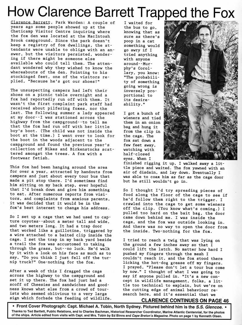 Published by Ronald Caplan on 1998/6/1 (2019 reads)How Clarence Barrett Trapped the Fox clarence Barrett. Park Warden: A couple of years ago some people showed up at the Cheticamp Visitor Centre inquiring where the fox den was located at the Macintosh Brook campground. Since the park doesn't keep a registry of fox dwellings, the at? tendants were unable to oblige with an an? swer, but the visitors persisted, wonder? ing if there might be someone else available who could tell them. The atten? dant wondered why they wished to know the whereabouts of the den. Pointing to his stockinged feet, one of the visitors re? plied, "Because he's got our shoes!" The unsuspecting campers had left their shoes on a picnic table overnight and a fox had reportedly run off with them. It wasn't the first complaint park staff had received about pilfering foxes, nor the last. The following summer a lady appeared at my door--I was stationed across the highway from the campground--to tell me that the fox had run off with her little boy's boot. (The child was not inside the boot at the time.) I went over to look for the boot in the woods adjacent to the campground and found the previous year's collection of Nikes and Birkenstocks scat? tered amongst the trees. A fox with a footwear fetish. This fox had been hanging around the area for over a year, attracted by handouts from campers and just about every tour bus that made a pit stop there. I'd sometimes find him sitting on my back step, ever hopeful that I'd break down and give him something to eat. After numerous reports from visi? tors , and complaints from anxious parents, it was decided that it would be in the fox's best interest to change his address. So I set up a cage that we had used to cap? ture coyotes--about a meter tall and wide, and two meters long. It had a trap door that worked like a guillotine, triggered by a wire attached to a baited clip inside the cage. I set the trap in my back yard beside a trail the fox was accustomed to taking through the grass, but--no luck. He'd walk by it with a look on his face as much as to say, "Do you think I just fell off the tur? nip truck?" One-nothing for the fox. After a week of this I dragged the cage across the highway to the campground and set it up there. The fox had just had a scoff of Cheesies and sandwiches and good? ness knows what else from a crowd of tour? ists who seemed oblivious to a very large sign which forbade the feeding of wildlife. I waited for the bus to go, knowing that as sure as there's poop in a cat something would go awry if I tried anything with anyone around--Mur? phy' s Corol? lary, you know: "The probabili? ty of something going wrong is inversely pro? portional to its desire- ability. " I got a bunch of wieners and tied them in an onion bag and hiing it from the clip in the cage. The fox sat down a few feet away, watching with half-closed eyes. When I finished rigging it up, I walked away a lit? tle piece and waited. The fox yawned with an air of disdain, and lay down. Eventually I was able to coax him as far as the cage door but he still wouldn't go in. So I thought I'd try spreading pieces of food along the floor of the cage to see if he'd follow them right to the trigger. I crawled into the cage to get some wieners off the clip. (You know what's coming.) I pulled too hard on the bait bag, the door came down behind me. I was inside the cage, and the fox was outside looking in. And there was no way to open the door from the inside. Two-nothing for the fox. I tried to reach a twig that was lying on the ground a few inches away so that I could lift the latch. No matter how hard I pushed my fingers through the mesh I couldn't reach it, and the fox stood there licking the hot-dog grease off my fingers. I prayed, "Please don't let a tour bus come by now." I thought of what I was going to say if anyone pulled in. "It's a new con? cept in wildlife management, folks, a lit? tle too technical to explain, but we're on the cutting edge of animal behaviour re? search here, and it's essential that we CLARENCE CONTINUES ON PAGE 46 • Front Cover Photograph: Capt. Michael A. Tobin, North Sydney. Pictured behind him is the S.S. Glencoe. • Thanks to Ted Bartlett, Public Relations, and to Charles Bachman, Historical Researcher Coordinator, IVIarine Atlantic Centennial, for the photos of the ships. Article edited from visits with Capt. and IVIrs. Tobin by Ed Binns and Cape Breton's Magazine. Photo on page 1 by Kenneth Olsen.