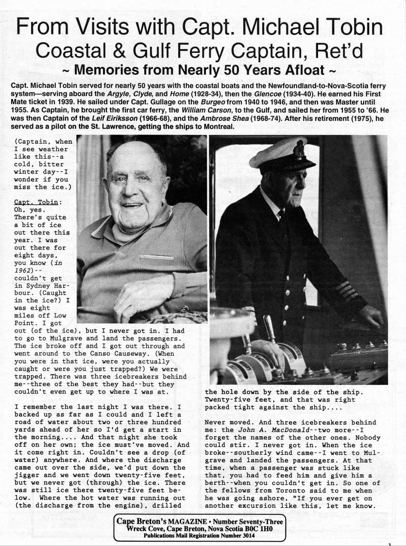 From Visits with Capt. Michael Tobin Coastal & Gulf Ferry Captain, Ret'd ~ Memories from Nearly 50 Years Afloat ~ Capt. Michael Tobin served for nearly 50 years with the coastal boats and the Newfoundland-to-Nova-Scotia ferry system • serving aboard the Argyle, Clyde, and Home (1928-34), then the Glencoe (1934-40). He earned his First Mate ticket in 1939. He sailed under Capt. Gullage on the BurgeoUom 1940 to 1946, and then was Master until 1955. As Captain, he brought the first car ferry, the William Carson, to the Gulf, and sailed her from 1955 to '66. He was then Captain of the Leif Eiriksson (1966-68), and the Ambrose Shea (1968-74). After his retirement (1975), he served as a pilot on the St. Lawrence, getting the ships to Montreal. (Captain, when I see weather like this--a cold, bitter winter day--I wonder if you miss the ice.) Capt. Tobin: Oh, yes. There's quite a bit of ice out there this year. I was out there for eight days, you know (in 1962)-- couldn't get in Sydney Har? bour. (Caught in the ice?) I was eight miles off Low f. """'''B f" 'KKSK -' Point. I got '' • ? JPii''iT''iL* out (of the ice), but I never got in. I had to go to Mulgrave and land the passengers. The ice broke off and I got out through and went around to the Canso Causeway. (When you were in that ice, were you actually caught or were you just trapped?) We were trapped. There was three icebreakers behind me--three of the best they had--but they couldn't even get up to where I was at. I remember the last night I was there. I backed up as far as I could and I left a road of water about two or three hundred yards ahead of her so I'd get a start in the morning.... And that night she took off on her own; the ice must've moved. And it come right in. Couldn't see a drop (of water) anywhere. And where the discharge came out over the side, we'd put down the jigger and we went down twenty-five feet, but we never got (through) the ice. There was still ice there twenty-five feet be? low. Where the hot water was running out (the discharge from the engine), drilled the hole down by the side of the ship. Twenty-five feet, and that was right packed tight against the ship.... Never moved. And three icebreakers behind me: the John A. MacDonald--tfo more--I forget the names of the other ones. Nobody could stir. I never got in. When the ice broke--southerly wind came--I went to Mul? grave and landed the passengers. At that time, when a passenger was stuck like that, you had to feed him and give him a berth--when you couldn't get in. So one of the fellows from Toronto said to me when he was going ashore, "If you ever get on another excursion like this, let me know. Cape Breton's MAGAZINE • Number Seventy-Three Wreck Cove, Cape Breton, Nova Scotia BOC IHO Publications Mail Registratioii Number 3014