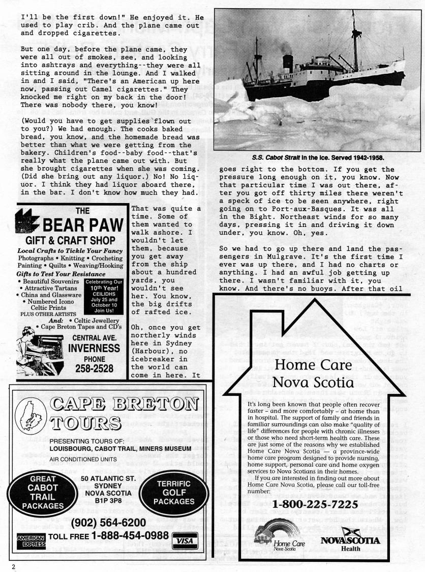 I'll be the first down!" He enjoyed it. He used to play crib. And the plane came out and dropped cigarettes. But one day, before the plane came, they were all out of smokes, see, and looking into ashtrays and everything--they were all sitting around in the lounge. And I walked in and I said, "There's an American up here now, passing out Camel cigarettes." They knocked me right on my back in the door! There was nobody there, you know! (Would you have to get supplies flown out to you?) We had enough. The cooks baked bread, you know, and the homemade bread was better than what we were getting from the bakery. Children's food--baby food--that's really what the plane came out with. But she brought cigarettes when she was coming. (Did she bring out any liquor.) No! No liq? uor. I think they had liquor aboard there, in the bar. I don't know how much they had. MA THE ?? BEAR PAW GIFT & CRAFT SHOP l'cal Crafts to Tickle Your Fancy Photographs • Knitting • Crocheting Painting • Quilts • Weaving/Hooking Gifts to Test Your Resistance • Beautiful Souvenirs • Attractive Tartans • China and Glassware • Numbered Icono Celtic Prints PLUS OTHER ARTISTS And: • Celtic Jewellery Cape Breton Tapes and CD's CENTRAL AVE. INVERNESS PHONE 258-2528 That was quite a time. Some of them wanted to walk ashore. I wouldn't let them, because you get away from the ship about a hundred yards, you wouldn't see her. You know, the big drifts of rafted ice. Oh, once you get northerly winds here in Sydney (Harbour), no icebreaker in the world can come in here. It (O'IPIl IBM'IT??! PRESENTING TOURS OF: LOUISBOURG, CABOT TRAIL, MINERS MUSEUM AIR CONDITIONED UNITS GREAT CABOT TRAIL PACKAGES' 50 ATLANTIC ST. SYDNEY NOVA SCOTIA B1P3P8 TERRIFIC GOLF PACKAGES (902)564-6200 I TOLL FREE 1 -888-454-0988 VISA S.S. Cabot Strait in the Ice. Served 1942-1958. goes right to the bottom. If you get the pressure long enough on it, you know. Now that particular time I was out there, af? ter you got off thirty miles there weren't a speck of ice to be seen anywhere, right going on to Port-aux-Basques. It was all in the Bight. Northeast winds for so many days, pressing it in and driving it down under, you know. Oh, yes. So we had to go up there and land the pas? sengers in Mulgrave. It's the first time I ever was up there, and I had no charts or anything. I had an awful job getting up there. I wasn't familiar with it, you know. And there's no buoys. After that oil z Home Care Nova Scotia It's long been known that people often recover faster - and more comfortably - at home than in hospital. The support of family and friends in familiar surroundings can also make "quality of life" differences for people with chronic illnesses or those who need short-term health care. These are just some of the reasons why we established Home Care Nova Scotia • a province-wide home care program designed to provide nursing, home support, personal care and home oxygen services to Nova Scotians in their homes. If you are interested in finding out more about Home Care Nova Scotia, please call our toll-free number: 1-800-225-7225 Home Caw ''''' Nova Scotia Health