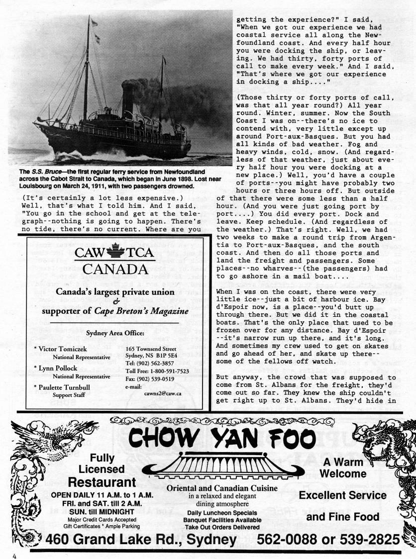 The S.S. Bruce • th& first regular ferry service from Newfoundland across the Cakx>t Strait to Canada, which began In June 1898. Lost r Louisbourg on March 24,1911, with two passengers drowned. (It's certainly a lot less expensive.) Well, that's what I told him. And I said, "You go in the school and get at the tele? graph- -nothing is going to happen. There's no tide, there's no current. Where are you CAW'TCA CANADA Canada's largest private union & supporter of Cape Breton *s Magazine Sydney Area Office: " Victor Tomiczek National Representative " Lynn Pollock National Representative " Paulette Turnbuii Support Staff 165 Townsend Street Sydney, NS BIP 5E4 Tel: (902) 562-3857 Toll Free: 1-800-591-7523 Fax: (902) 539-0519 e-mail: [email protected] getting the experience?" I said, "When we got our experience we had coastal service all along the New? foundland coast. And every half hour you were docking the ship, or leav? ing. We had thirty, forty ports of call to make every week." And I said, "That's where we got our experience in docking a ship...." (Those thirty or forty ports of call, was that all year round?) All year round. Winter, summer. Now the South Coast I was on--there's no ice to contend with, very little except up around Port-aux-Basques. But you had all kinds of bad weather. Fog and heavy winds, cold, snow. (And regard? less of that weather, just about eve? ry half hour you were docking at a new place.) Well, you'd have a couple of ports--you might have probably two hours or three hours off. But outside of that there were some less than a half hour. (And you were just going port by port....) You did every port. Dock and leave. Keep schedule. (And regardless of the weather.) That's right. Well, we had two weeks to make a round trip from Argen- tia to Port-aux-Basques, and the south coast. And then do all those ports and land the freight and passengers. Some places--no wharves--(the passengers) had to go ashore in a mail boat.... When I was on the coast, there were very little ice--just a bit of harbour ice. Bay d'Espoir now, is a place--you'd butt up through there. But we did it in the coastal boats. That's the only place that used to be frozen over for any distance. Bay d'Espoir --it's narrow run up there, and it's long. And sometimes my crew used to get on skates and go ahead of her, and skate up there-- some of the fellows off watch. But anyway, the crowd that was supposed to come from St. Albans for the freight, they'd come out so far. They knew the ship couldn't get right up to St. Albans. They'd hide in WOW VAN f 00 Fully Licensed ??yhrrmmv' Restaurant OPEN DAILY 11 A.M. to 1 A.M. FRI. and SAT. till 2 A.M. SUN. till MIDNIGHT Major Credit Cards Accepted Gift Certificates * Ample Parking Oriental and Canadian Cuisine in a relaxed and elegant dining atmosphere Daily Luncheon Specials Banquet Facilities Available Take Out Orders Delivered A Warm Welcome Excellent Service and Fine Food 460 Grand Lake Rd., Sydney 562-0088 or 539-2825'