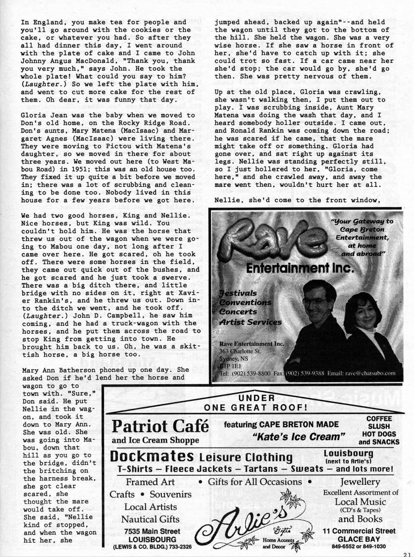 In England, you make tea for people and you'll go around with the cookies or the cake, or whatever you had. So after they all had dinner this day, I went around with the plate of cake and I came to John Johnny Angus MacDonald, "Thank you, thank you very much," says John. He took the whole plate! What could you say to him? (Laughter.) So we left the plate with him, and went to cut more cake for the rest of them. Oh dear, it was funny that day. Gloria Jean was the baby when we moved to Don's old home, on the Rocky Ridge Road. Don's aunts, Mary Matena (Maclsaac) and Mar? garet Agnes (Maclsaac) were living there. They were moving to Pictou with Matena's daughter, so we moved in there for about three years. We moved out here (to West Ma? bou Road) in 1951; this was an old house too. They fixed it up quite a bit before we moved in; there was a lot of scrubbing and clean? ing to be done too. Nobody lived in this house for a few years before we got here. We had two good horses. King and Nellie. Nice horses, but King was wild. You couldn't hold him. He was the horse that threw us out of the wagon when we were go? ing to Mabou one day, not long after I came over here. He got scared, oh he took off. There were some horses in the field, they came out quick out of the bushes, and he got scared and he just took a swerve. There was a big ditch there, and little bridge with no sides on it, right at Xavi? er Rankin's, and he threw us out. Down in? to the ditch we went, and he took off. (Laughter.) John D. Campbell, he saw him coming, and he had a truck-wagon with the horses, and he put them across the road to stop King from getting into town. He brought him back to us. Oh, he was a skit? tish horse, a big horse too. Mary Ann Batherson phoned up one day. She asked Don if he'd lend her the horse and wagon to go to town with. "Sure," Don said. He put Nellie in the wag? on, and took it down to Mary Ann. She was old. She was going into Ma? bou, down that hill as you go to the bridge, didn't the britching on the harness break, she got clear scared, she thought the mare would take off. She said, "Nellie kind of stopped, and when the wagon hit her, she jumped ahead, backed up again"--and held the wagon until they got to the bottom of the hill. She held the wagon. She was a very wise horse. If she saw a horse in front of her, she'd have to catch up with it; she could trot so fast. If a car came near her she'd stop: the car would go by, she'd go then. She was pretty nervous of them. Up at the old place, Gloria was crawling, she wasn't walking then, I put them out to play, i was scrubbing inside. Aunt Mary Matena was doing the wash that day, and I heard somebody holler outside. I came out, and Ronald Rankin was coming down the road; he was scared if he came, that the mare might take off or something. Gloria had gone over, and sat right up against its legs. Nellie was standing perfectly still, so I just hollered to her, "Gloria, come here," and she crawled away, and away the mare went then, wouldn't hurt her at all. Nellie, she'd come to the front window. my to :rifertainr'ntinc. mventk Concerts Artist Rave Ei|tertdnme|K|Jnc. ?? '' """rIotteSi '''' ; (902) 539-8800 Fax Patriot Cafe and Ice Cream Shoppe featuring CAPE BRETON MADE ''Kate's Ice Cream' COFFEE SLUSH HOT DOGS and SNACKS DOCkmateS Leisure Clothing "'''S T-Shirts - Fleece Jackets - Tartans - Siueats - and lots more! Framed Art Crafts • Souvenirs Local Artists Nautical Gifts 7535 Main Street LOUISBOURG (LEWIS & CO. BLDG.) 733-2326 • Gifts for All Occasions • Jewellery Excellent Assortment of Local Music (CD's & Tapes) and Books 11 Commercial Street GLACE BAY 849-6552 or 849-1030