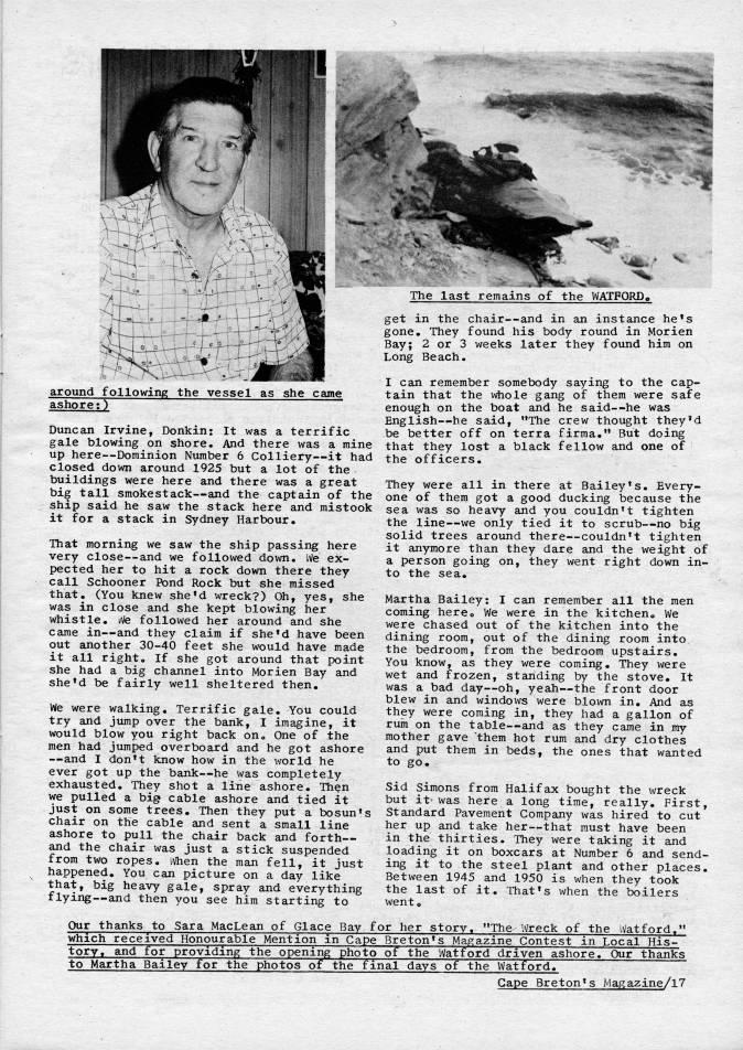 Published by Ronald Caplan on 1977/6/1 (687 reads)around following the vessel as she came ashore;) Duncan Irvine, Donkin: It was a terrific gale blowing on shore. And there was a mine up here • Dominion Number 6 Colliery~it had closed down around 1925 but a lot of the buildings were here and there was a great big tall smokestack • and the captain of the ship said he saw the stack here and mistook it for a stack in Sydney Harbour. That morning we saw the ship passing here very close • and we followed down. We ex? pected her to hit a rock down there they call Schooner Pond Rock but she missed that. (You knew she'd wreck?) Oh, yes, she was in close and she kept blowing her whistle, //e followed her around and she cetme in--and they claim if she'd have been out another 30-40 feet she would have made it all right. If she got around that point she had a big channel into Morien Bay and she'd be fairly well sheltered then. We were walking. Terrific gale. You could try and jump over the bank, I imagine, it would blow you right back on<, One of the men had jumped overboard and he got ashore --and I don't know how in the world he ever got up the bank • he was completely exhausted. They shot a line ashore. Th'n we pulled a big cable ashore and tied it just on some trees. Then they put a bosun's chair on the cable and sent a small line ashore to pull the chair back and forth • and the chair was just a stick suspended from two ropes. i;Vhen the man fell, it just happened. You can picture on a day like that, big heavy gale, spray and everything flying--and then you see him starting to The last remains of the WATFORD. et in the chair • and in an instance he's gone. They found his body round in Morien Bay; 2 or 3 weeks later they found him on Long Beach. I can remember somebody saying to the cap? tain that the whole gang of them were safe enough on the boat and he said--he was English • he said, "The crew thought they'd be better off on terra firma." But doing that they lost a black fellow and one of the officers. They were all in there at Bailey's. Every? one of them got a good ducking because the sea was so heavy and you couldn't tighten the line • we only tied it to scrub--no big solid trees around there--couldn't tighten it suiymore than they dare and the weight of a person going on, they went right down in? to the sea. Martha Bailey: I can remember all the men coming here. We were in the kitchen. We were chased out of the kitchen into the dining room, out of the dining room into the bedroom, from the bedroom upstairs. You know, as they were coming. They were wet and frozen, standing by the stove. It was a bad day • oh, yeah • the front door blew in and windows were blown in. And as they were coming in, they had a gallon of rum on the table--and as they came in my mother gave them hot rum and dry clothes and put them in beds, the ones that wanted to go. Sid Simons from Halifax bought the wreck but it was here a long tirae, really. First, Standard Pavement Company was hired to cut her up and take her • that must have been in the thirties. They were taking it and loading it on boxcars at Number 6 and send? ing it to the steel plant and other places. Between 1945 and 1950 is when they took the last of it. ITiat's when the boilers went. Our thanks to Sara MacLean of Glace Bay for her story, "The Wreck of the Watford," which received Honourable Mention in Cape Breton's Magazine Contest in Local His? tory, and for providing the opening photo of the Watford driven ashore. Our thanks to Martha Bailey for the photos of the final days of the WatfordT Cape Breton's Magazine/l7