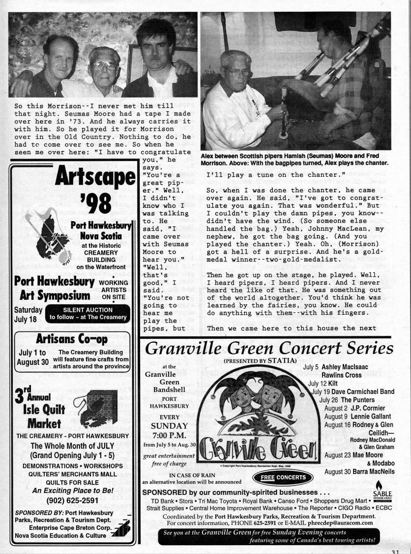 Published by Ronald Caplan on 1998/6/1 (520 reads)??''>''"- So this Morrison--! never met him till that night. Seumas Moore had a tape I made over here in '73. And he always carries it with him. So he played it for Morrison over in the Old Country. Nothing to do, he had tc come over to see me. So when he seen me over here: "I have to congratulate you," he says. "You're a great pip? er." Well, I didn't know who I was talking to. He said, "I came over with Seumas Moore to hear you." "Well, that's good," I said. "You're not going to hear me play the pipes, but Artscape '98 J Port Hawkesbury 1' Nova Scotia rj'O' at the Historic CREAIVIERY BUILDING on the Waterfront Port Hawkesbury working m . m . ARTISTS Art Symposium on site Saturday | July 18 SILENT AUCTION to follow ~ at The Creamery Artisans Co-op July 1 to The Creamery Building Auaust 30 ''" *?'*"''? fine crafts from " artists around the province 3rd Annual Isle Quilt Market THE CREAIVIERY - PORT HAWKESBURY The Whole Month Of JULY (Grand Opening July 1 - 5) DEMONSTRATIONS • WORKSHOPS QUILTERS' MERCHANTS MALL QUILTS FOR SALE An Exciting Place to Be! (902) 625-2591 SPONSORED BY: Port Hawkesbury Parks, Recreation & Tourism Dept. Enterprise Cape Breton Corp. Nova Scotia Education & Culture Alex between Scottish pipers Harnish (Seumas) Moore and Fred Morrison. Above: With the bagpipes turned, Alex plays the chanter. I'll play a tune on the chanter." So, when I was done the chanter, he came over again. He said, "I've got to congrat? ulate you again. That was wonderful." But I couldn't play the damn pipes, you know-- didn't have the wind. (So someone else handled the bag.) Yeah, Johnny MacLean, my nephew, he got the bag going. (And you played the chanter.) Yeah. Oh, (Morrison) got a hell of a surprise. And he's a gold- medal winner--two-gold-medalist. Then he got up on the stage, he played. Well, I heard pipers, I heard pipers. And I never heard the like of that. He was something out of the world altogether. You'd think he was learned by the fairies, you know. He could do anything with them--with his fingers. Then we came here to this house the next Granville Green Concert Series (PRESENTED BY STATIA) at the Granville Green Bandshell PORT HAWKESBURY EVERY SUNDAY 7:00 P.M. from July 5 to Aug. 30 great entertainment free of charge IN CASE OF RAIN an alternative location will be announced SPONSORED by our community-spirited businesses . TD Bank • Stora • Tri Mac Toyota • Royal Bank • Canso Ford • Shoppers Drug Mart • Strait Supplies • Central Home Improvement Warehouse • The Reporter • CIGO Radio • ECBC Coordinated by the Port Hawkesbury Parks, Recreation & Tourism Department. For concert information, PHONE 625-2591 or E-MAIL [email protected] Ashley Maclsaac Rawlins Cross 12 Kilt 'uly 19 Dave Carmichael Band July 26 The Punters August2 J.P.Cormier August 9 Lennie Gallant August 16 Rodney* Glen Ceilidh- Rodney lUlacDonald & Glen Graham August 23 Mae Moore & Modabo August 30 Barra MacNeils SABLE