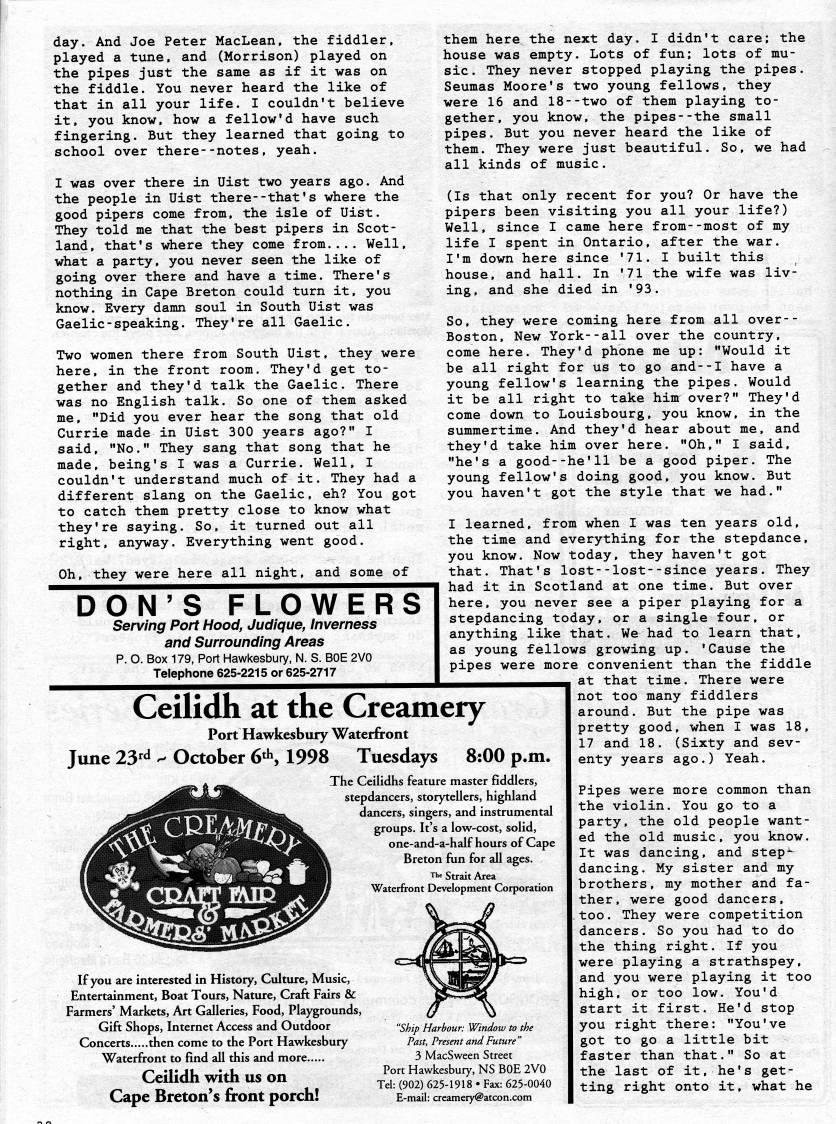 Published by Ronald Caplan on 1998/6/1 (434 reads)day. And Joe Peter MacLean, the fiddler, played a tune, and (Morrison) played on the pipes just the same as if it was on the fiddle. You never heard the like of that in all your life. I couldn't believe it, you know, how a fellow'd have such fingering. But they learned that going to school over there--notes, yeah. I was over there in Uist two years ago. And the people in Uist there--that's where the good pipers come from, the isle of Uist. They told me that the best pipers in Scot? land, that's where they come from.... Well, what a party, you never seen the like of going over there and have a time. There's nothing in Cape Breton could turn it, you know. Every damn soul in South Uist was Gaelic-speaking. They're all Gaelic. Two women there from South Uist, they were here, in the front room. They'd get to? gether and they'd talk the Gaelic. There was no English talk. So one of them asked me, "Did you ever hear the song that old Currie made in Uist 300 years ago?" I said, "No." They sang that song that he made, being's I was a Currie. Well, I couldn't understand much of it. They had a different slang on the Gaelic, eh? You got to catch them pretty close to know what they're saying. So, it turned out all right, anyway. Everything went good. Oh, they were here all night, and some of DON'S FLOWERS Serving Port Hood, Judique, Inverness and Surrounding Areas p. O. Box 179, Port Hawkesbury, N. S. BOE 2V0 Telephone 625-2215 or 625-2717 Ceilidh at the Creameiy Port Hawkesbury Waterfront June 23''' ' October 6'', 1993 Tuesdays 8:00 p.m. them here the next day. I didn't care; the house was empty. Lots of fun; lots of mu? sic. They never stopped playing the pipes. Seumas Moore's two young fellows, they were 16 and 18--two of them playing to? gether, you know, the pipes--the small pipes. But you never heard the like of them. They were just beautiful. So, we had all kinds of music. (Is that only recent for you? Or have the pipers been visiting you all your life?) Well, since I came here from--most of my life I spent in Ontario, after the war. I'm down here since '71. I built this house, and hall. In '71 the wife was liv? ing, and she died in '93. So, they were coming here from all over-- Boston, New York--all over the country, come here. They'd phone me up: "Would it be all right for us to go and--I have a young fellow's learning the pipes. Would it be all right to take him over?" They'd come down to Louisbourg, you know, in the summertime. And they'd hear about me, and they'd take him over here. "Oh," I said, "he's a good--he'11 be a good piper. The young fellow's doing good, you know. But you haven't got the style that we had." I learned, from when I was ten years old, the time and everything for the stepdance, you know. Now today, they haven't got that. That's lost--lost--since years. They had it in Scotland at one time. But over here, you never see a piper playing for a stepdancing today, or a single four, or anything like that. We had to learn that, as young fellows growing up. 'Cause the pipes were more convenient than the fiddle at that time. There were not too many fiddlers around. But the pipe was pretty good, when I was 18, 17 and 18. (Sixty and sev? enty years ago.) Yeah. The Ceilidhs feature master fiddlers, stepdancers, storytellers, highland dancers, singers, and instrumental groups. It's a low-cost, solid, one-and-a-half hours of Cape Breton fun for all ages. The Strait Area Waterfront Development Corporation If you are interested in History, Culture, Music, Entertainment, Boat Tours, Nature, Craft Fairs & Farmers' Markets, Art Galleries, Food, Playgrounds, Gift Shops, Internet Access and Outdoor Concerts.....then come to the Port Hawkesbury Waterfront to find all this and more Ceilidh with us on Cape Breton's front porch! "Ship Harbour: Window to the Past, Present and Future " 3 MacSween Street Port Hawkesbury, NS BOE 2V0 Tel: (902) 625-1918 • Fax: 625-0040 E-mail: [email protected] Pipes were more common than the violin. You go to a party, the old people want? ed the old music, you know. It was dancing, and step'- dancing. My sister and my brothers, my mother and fa? ther, were good dancers, too. They were competition dancers. So you had to do the thing right. If you were playing a strathspey, and you were playing it too high, or too low. You'd start it first. He'd stop you right there: "You've got to go a little bit faster than that." So at the last of it, he's get? ting right onto it, what he