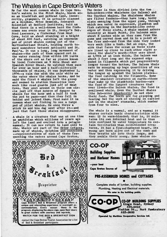 Published by Ronald Caplan on 1977/6/1 (325 reads)The Whales in Cape Breton's Waters By far the most common whale in Cape Bre? ton's waters is the Pilot Whale, known al? so as blackfish and pothead (and, incor? rectly, grampus). It is actually classed as a dolphin. Peter Beamish, Research Scientist at Bedford Institute, told us that there is a well-known herd the fish? ermen see every year in St. George's Bay. Fred Lawrence, a fisherman from Meat Cove, told us about standing at a height of about 400 feet, watching an enormous pod of pilot vdiales coming out of the Northumberland Strait, heading north to? ward somewhere between Anticosti and St. Paul's. It was a long, long movement of whales • the path of them spaced out in the water running from within 100 yards of the shore out as far as places known by local fishermen as 9 Mile Shoal and Spanish River Shoal. He watched them pass for over an hour and a half • literally thousands of vy'ales. It was September 1, 1974 • a calm day with the only white on the water where the whales broke. And he said the first 6 whales left the group and seemed to station themselves very much like road guards just off of Meat Cove. They went around in their own cir? cle just off that source of danger to whales for the hour and a half it took the pod to pass • and then they fell in behind and joined them. Fred said it is common when out fishing to see a large pod of pilot vdiales. He once threw a stick in and his dog went after it • and just that fast those whales disappeared. A whale is a creature that was at one time an amphibian which millions of years ago left the land and evolved into a pelagic mammal. It can now return to land only to die. Whales are part of the Order Cetacea, made up of whales, dolphins and porpoises • representatives of each of these fre? quenting the waters around Cape Breton. The Order is then divided into the two Sub-orders • the Whalebone (or Baleen) and the Toothed Whales. The Whalebone Whales are filter feeders • they have long, horny slats emerging from the upper gums, through which sea water is expressed, plankton and fish catching in the mustache-like outer edges of these slats. A whale washed ashore recently at Black Point. Its baleens were about 8 inches wide as they came from the gums and curved down and in to a point at the free end • and from the side they looked very much like a tusk. But on edge, the side that faces the ocean as these slats are lined up close to each other right a- cross the whale's mouth • they were about an l/8th of an inch thick. The baleen was about 3 feet long and the exposed edge ended in filaments which got progressively longer toward the bottom. The Baleen Whale eats by scooping up huge quantities of sea water and then expressing it by driving the tongue up against the baleen plates • the food catching in the filaments. Some of the smallest creatures on earth • those that make up the planktonic hordes • are the food of the largest creatures that ever lived • the Baleen Whales. The food is swallowed whole. Even the Toothed Whales (the Sub-order Odontoceti) do not chew their food. The teeth are for grasping and tearing but the work of chewing is carried out in the whales' stomachs, which nximber from four to nine. The whale is a mammal, and as a mammal it shares certain basic characteristics with man: it is warm-blooded; that is, it main? tains its own internal heat and is thus less confined by water temperature to cer? tain territories than cold-blooded crea? tures. It has a four-chambered heart. Its young are t>orn alive out of the womb and they breathe air into their lungs. And they suckle their young. Some whales re- i ' .tf'.* .*'* 'L* >?'* .-i*.* - • • ? .*?'? ast Droaram offers a l'| / Cape Breton's Bed & Breakfast program offers a unique and interesting experience in overnight ac? commodations. Every season those in the program, dispfaying the above sign, open their doors to greet visitors with courtesy and warmth. WATCH FOR THE BED & BREAKFAST SIGN -OR- contact the Cape Breton Tourist Association for a list of Bed & Breakfast participants re CO-OP Building Supplies and Harbour Homes • your best Cape Breton Source of PRE-ASSEMBLED HOMES and COHAGES • Complete stocks of lumber, building supplies. Plumbing, Heating and Electcical materials. W? cafmr to th? building public CO-OD COOP BUILDING SUPPLIES '' '' '' '' 1 Kings Road, Sydney 539<-6410 Station St?, Fort Ha''esbury 625-2600 Op?r?f?d by MaritinM Co-op?rativ? SorvicM Ltd.