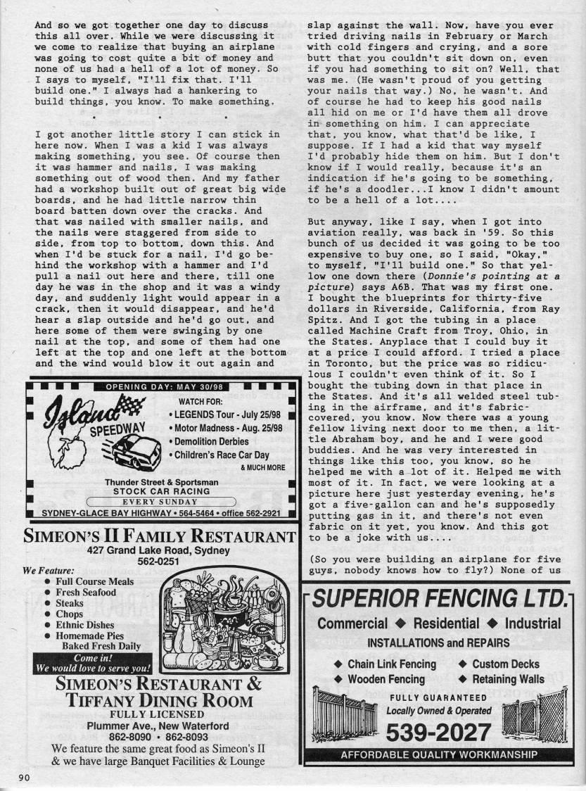 And so we got together one day to discuss this all over. While we were discussing it we come to realize that buying an airplane was going to cost quite a bit of money and none of us had a hell of a lot of money. So I says to myself, "I'll fix that. I'll build one." I always had a hankering to build things, you know. To make something. I got another little story I can stick in here now. When I was a kid I was always making something, you see. Of course then it was hammer and nails, I was making something out of wood then. And my father had a workshop built out of great big wide boards, and he had little narrow thin board batten down over the cracks. And that was nailed with smaller nails, and the nails were staggered from side to side, from top to bottom, down this. And when I'd be stuck for a nail, I'd go be? hind the workshop with a hammer and I'd pull a nail out here and there, till one day he was in the shop and it was a windy day, and suddenly light would appear in a crack, then it would disappear, and he'd hear a slap outside and he'd go out, and here some of them were swinging by one nail at the top, and some of them had one left at the top and one left at the bottom and the wind would blow it out again and WATCH FOR: I • LEGENDS Tour-July 25/98 | • Motor Madness - Aug. 25/98 • Demolition Derbies • Children's Race Car Day & MUCH MORE Thunder Street & Sportsman | STOCK CAR RACING ( EVERY SUNDAY ) • SYDNEY-GLACE BAY HIGHWAY ?? 564-5464 ? office 562-2921 I SIMEON'S II Family Restaurant 427 Grand Lake Road, Sydney 562-0251 We Feature: • Full Course Meals • Fresh Seafood • steaks • Chops • Ethnic Dishes • Homemade Pies Baked Fresh Daily Come in! We would love to serve you! SIMEON'S Restaurant & Tiffany Dining Room FULLY LICENSED Piummer Ave., New Waterford 862-8090 • 862-8093 We feature the same great food as Simeon's II ?& we have large Banquet Facilities & Lounge slap against the wall. Now, have you ever tried driving nails in February or March with cold fingers and crying, and a sore butt that you couldn't sit down on, even if you had something to sit on? Well, that was me. (He wasn't proud of you getting your nails that way.) No, he wasn't. And of course he had to keep his good nails all hid on me or I'd have them all drove in something on him. I can appreciate that, you know, what that'd be like, I suppose. If I had a kid that way myself I'd probably hide them on him. But I don't know if I would really, because it's an indication if he's going to be something, if he's a doodler...I know I didn't amount to be a hell of a lot.... But anyway, like I say, when I got into aviation really, was back in '59. So this bunch of us decided it was going to be too expensive to buy one, so I said, "Okay," to myself, "I'll build one." So that yel? low one down there {Bonnie's pointing at a picture) says A6B. That was my first one. I bought the blueprints for thirty-five dollars in Riverside, California, from Ray Spitz. And I got the tubing in a place called Machine Craft from Troy, Ohio, in the States. Anyplace that I could buy it at a price I could afford. I tried a place in Toronto, but the price was so ridicu? lous I couldn't even think of it. So I bought the tubing down in that place in the States. And it's all welded steel tub? ing in the airframe, and it's fabric- covered, you know. Now there was a young fellow living next door to me then, a lit? tle Abraham boy, and he and I were good buddies. And he was very interested in things like this too, you know, so he helped me with a lot of it. Helped me with most of it. In fact, we were looking at a picture here just yesterday evening, he's got a five-gallon can and he's supposedly putting gas in it, and there's not even fabric on it yet, you know. And this got to be a joke with us.... (So you were building an airplane for five guys, nobody knows how to fly?) None of us SUPERIOR FENCING LTD: Commercial Residential Industrial INSTALLATIONS and REPAIRS 4 Chain Link Fencing Wooden Fencing ' Custom Decks 4 Retaining Walls FULLY GUARANTEED Locally Owned & Operated 539-2027 AFFORDABLE QUALITY WORKMANSHIP