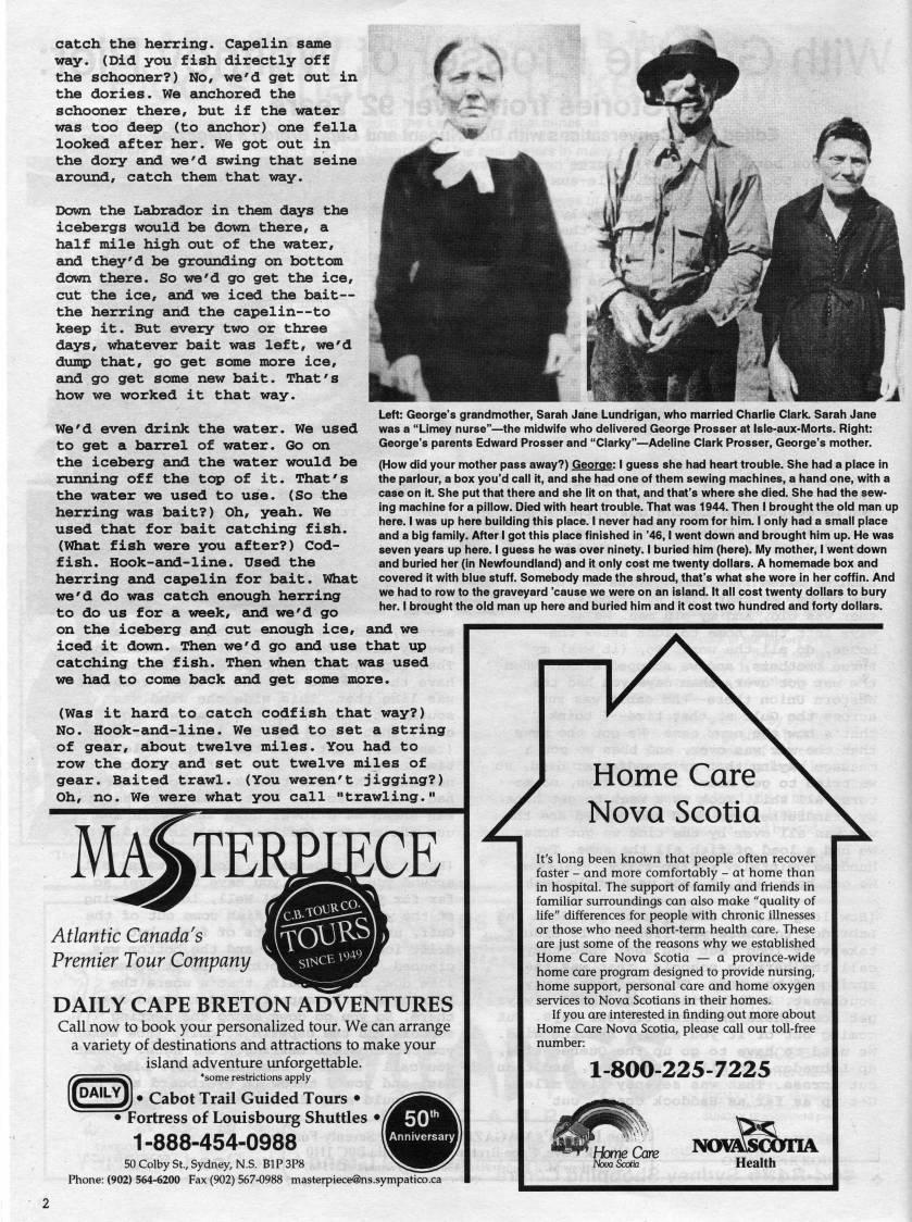 Published by Ronald Caplan on 1999/6/1 (1025 reads)catch the herring. Capelin same way. (Did you fish directly off the schooner?) No, we'd get out in the dories. We anchored the schooner there, but if the water was too deep (to anchor) one fella looked after her. We got out in the doxry and we'd swing that seine around, catch them that way. Down the LeQsrador in them days the icebergs would be down there, a half mile high out of the water, and they'd be groxinding on bottom down there. So we'd go get the ice, cut the ice, and we iced the bait • the herring and the capelin • to keep it. But every two or three days, whatever bait was left, we'd dump that, go get some more ice, euid go get some new bait. That's how we worked it that way. We'd even drink the water. We used to get a barrel of water. Go on the iceberg and the water would be running off the top of it. That's the water we used to use. (So the herring was bait?) Oh, yeah. We used that for bait catching fish. (What fish were you after?) Cod? fish. Hook-and-line. Used the herring and capelin for bait. What we'd do was catch enough herring to do us for a week, emd we'd go on the iceberg and cut enough ice, and we iced it down. Then we'd go and use that up catching the fish. Then when that was used we had to come back and get some more. (Was it hard to catch codfish that way?) No. Hook-and-line. We used to set a string of gear, about twelve miles. You had to row the dory and set out twelve miles of gear. Baited trawl. (You weren't jigging?) Oh, no. We were what you call "trawling." Left: George's grandmother, Sarah Jane Lundrigan, who married Charlie Clark. Sarah Jane was a "Limey nurse" • the midwife who delivered George Prosser at Isle-aux-Morts. Right: George's parents Edward Prosser and "Clarky" • Adeline Clark Prosser, George's mother. (How did your mother pass away?) George: i guess she had heart trouble. She had a place in the parlour, a box you'd call it, and she had one of them sewing machines, a hand one, with a case on it. She put that there and she lit on that, and that's where she died. She had the sew? ing machine for a pillow. Died with heart trouble. That was 1944. Then I brought the old man up here. I was up here building this place. I never had any room for him. I only had a small place and a big family. After I got this place finished in '46,1 went down and brought him up. He was seven years up here. I guess he was over ninety. I buried him (here). My mother, i went down and buried her (in Newfoundland) and it only cost me twenty dollars. A homemade box and covered it with blue stuff. Somebody made the shroud, that's what she wore in her coffin. And we had to row to the graveyard 'cause we were on an island. It all cost twenty dollars to bury her. I brought the old man up here and buried him and it cost two hundred and forty dollars. Atlantic Canada's Premier Tour Company DAILY CAPE BRETON ADVENTURES Call now to book your personalized tour. We can arrange a variety of destinations and attractions to make your island adventure unforgettable. *some restrictions apply I • Cabot Trail Guided Tours • • Fortress of Louisbourg Shuttles • 1-888-454-0988 50 Colby St., Sydney, N.S. BIP 3P8 Phone: (902) 564-6200 Fax (902) 567-0988 [email protected] / Home Core Nova Scotia It's long been known that people often recover faster - and more comfortably - at home than in hospital. The support of family and friends in familiar surroundings can also make "quality of life" differences for people with chronic illnesses or those who need short-term health care. These are just some of the reasons why we established Home Care Nova Scotia • a province-wide home care program designed to provide nursing, home support, personal care and home oxygen services to Nova Scotians in their homes. If you are interested in finding out more about Home Care Nova Scotia, please call our toil-free number: 1-800-225-7225