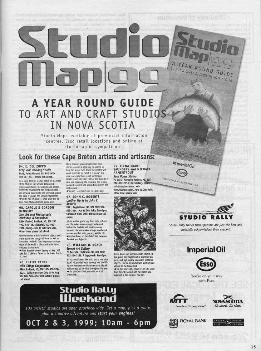 Published by Ronald Caplan on 1999/6/1 (784 reads)V U U ' ''?uf,f,''Of.'? A YEAR ROUND GUIDE TO ART AND CRAFT STUDIC IN NOVA SCOTIA Studio Maps available at provincial information centres, Esso retail locations and online at ,' studiomap.ns.sympatico.ca / Look for these Cape Breton artists and artisansf 94. E. DEL ZOPPO Grey Seal Weaving Studio RR#1, Point Michaud, NS, BOE 1W0?? 902-587-2777. Please call ahead. On a large loom in a small cabin on the shore of the Atlantic, Del weaves damask silk scarves and shawls. The colours and designs reflect the environment; the finished pieces are personal statements with universal appeal. The work is unique, the setting magnificent, • -ffoute 247 of Route 4. Walk down the hill from Point Michaud Beach picnic area. 95. CAROLE & GORDON KENNEDY Iron Art and Photographs Workshop & Showroom RR#4 (Tarbot) Baddeck, NS, BOE IBO • 902-929- 2821 (Studio), 902-929- 2318(Home). June to Oct: 9ani-5pm. Other times please call ahead. Gordon creates artistic functional objects and metal sculptures using traditional as well as innovative methods. Carol expresses a unique vision of the world in black and white hand- coloured photographs. • ??Pass Baddeck towards Sydney on Hwy. 105, take Exit 1,18km to larM on the Cabot Trail in St. Ann's. 96. CLAIRE RYDER Wild Things Cooperative RR#4, Baddeck, NS, BOE 180*902-929- 2021. Daily: 9am-5pm; July 15 to Aug 15:9am-7pm. After mid-October please call ahead. Claire han/ests wood already fallen from storms, erosion & lightening or washed up from the sea or river. When she creates with wood she looks for "what it is saying" and what is already there, quiet but formed. Cracks, knots and lines tell her the medium is alive and speaking. The sculpture has a finely polished contrast with wonderfully silvered nat? ural colours. ??-Tarbot - on Cabot Trail, St. Ann's Bay. 97. JOHN C. ROBERTS Leather Works by John C. Roberts RR#1, Englishtown, NS, BOC 1H0*902- 929-2414. May to Oct: Daily, 9am-5pm; Sun:10am-5pm. Other times please call ahead. John's leather goods vary from belts to buck? ets. He makes museum reproductions of leather fire buckets and soldiers accou? trements. He also makes a large selection of braided and flat belts, purses, wallets, etc. " • ??/ncf/an Brook, on the Cabot Trail, between Baddeck and Ingonish. 98. WILLIAM D. ROACH Sunset Art Gallery PO Box 584, Cheticamp, NS, BOE IHO* 902-224-2119. 7 days/week: 9am-6pm. Bill is a well known folk artist and a real char? acter! His painted wood carvings are spiritlift- ing and demonstrate his unique style. He will welcome you at any time throughout the year. ''??On the Cabot Trail, one mile north of 99. TEENA MARIE SAUNDERS and MICHAEL ARMENTROUT Ross House Studio PO Box 2, Margaree Harbour, NS, BOE 2B0*902-235-2112(Tel/Fax). "' [email protected]. web: www.rosshouse.com. June to Oct: Daily. Other times please call. • ?''f'&mioji; Teena Marie and Michael create limited edi? tion prints and original art of Maritime sub? jects, and high quality, decorated utilitarian objects. Housed in two historic buildings corv venient to the Cabot Trail. ?-0/) the Shore Rd., (Route 219) 100 yards from the intersection with the Cabot Trail. Adjacent to the Harbour View Inn. STUDIO RALLY studio Rally thinks their sponsors are just the best and gratefully acknowledges their support: Imperial Oil You're on your way with Esso. Sfcudio RaLLy UJeelienfJ From here. To everywhere • Sio IMuU. So CMiS/. i Start your engines! OCT 2 & 3, 1999; 10am - 6pm ROYAL BANK 15