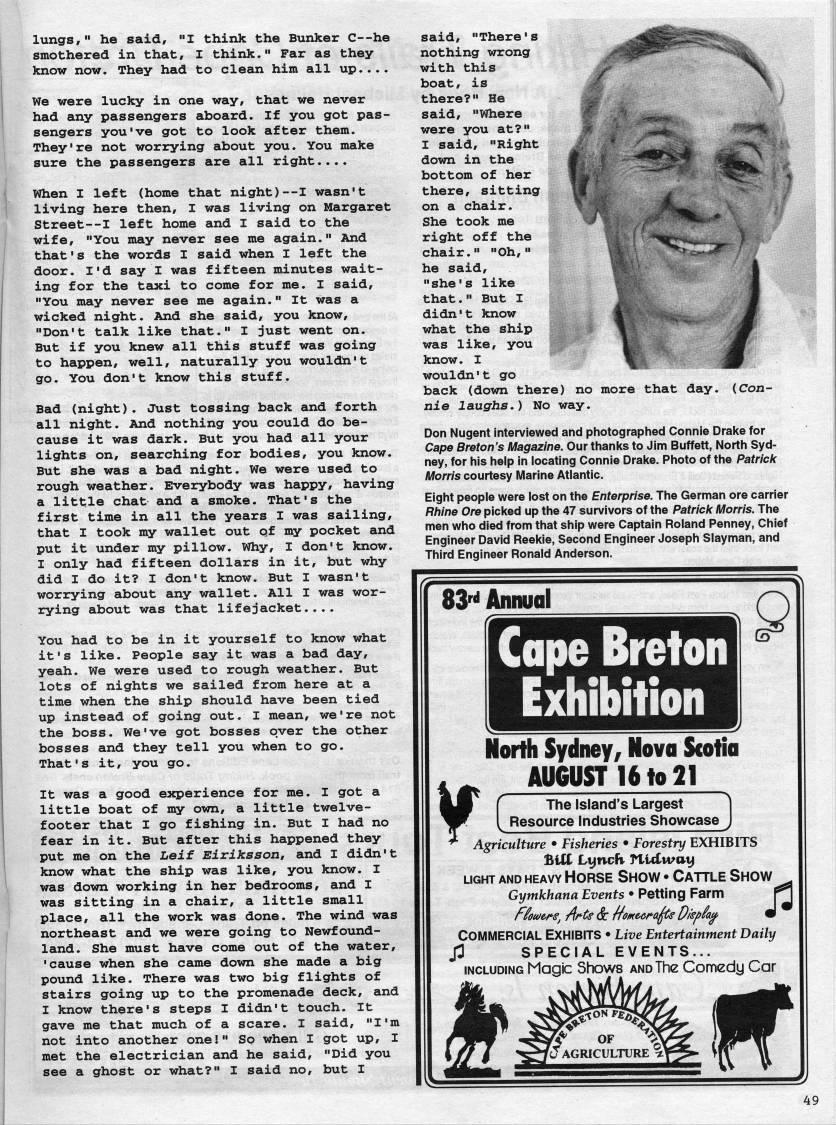 lungs," he said, "I think the Bunker C • he smothered in that, I think." Far as they know now. They had to clean him all up.... We were lucky in one way, that we never had any passengers aboard. If you got pas? sengers you've got to look after them. They' re not worrying about you. You make sure the passengers are all right.... When I left (home that night)--I wasn't living here then, I was living on Margaret Street • I left home and I said to the wife, "You may never see me again." And that's the words I said when I left the door. I'd say I was fifteen minutes wait? ing for the taxi to come for me. I said, "You may never see me again." It was a wicked night. And she said, you know, "Don't talk like that." I just went on. But if you knew all this stuff was going to happen, well, naturally you wouldh't go. You don't know this stuff. Bad (night). Just tossing back and forth all night. And nothing you could do be? cause it was dark. But you had all your lights on, searching for bodies, you know. But she was a bad night. We were used to rough weather. Everybody was happy, having a little chat and a smoke. That's the first time in all the years I was sailing, that I took my wallet out of my pocket and put it under my pillow. Why, I don't know. I only had fifteen dollars in it, but why did I do it? I don't know. But I wasn't worrying about any wallet. All I was wor? rying about was that lifejacket.... You had to be in it yourself to know what it's like. People say it was a bad day, yeah. We were used to rough weather. But lots of nights we sailed from here at a time when the ship should have been tied up instead of going out. I mean, we're not the boss. We've got bosses over the other bosses and they tell you when to go. That's it, you go. It was a good experience for me. I got a little boat of my own, a little twelve- footer that I go fishing in. But I had no fear in it. But after this happened they put me on the Leif Eiriksson, and I didn't know what the ship was like, you know. I was down working in her bedrooms, and I was sitting in a chair, a little small place, all the work was done. The wind was northeast and we were going to Newfound? land. She must have come out of the water, 'cause when she came down she made a big pound like. There was two big flights of stairs going up to the promenade deck, and I know there's steps I didn't touch. It gave me that much of a scare. I said, "I'm not into another one!" So when I got up, I met the electrician and he said, "Did you see a ghost or what?" I said no, but I said, "There's nothing wrong with this boat, is there?" He said, "Where were you at?" I said, "Right down in the bottom of her there, sitting on a chair. She took me right off the chair." "Oh," he said, "she's like that." But I didn't know what the ship was like, you know. I wouldn't go back (down there) no more that day. nie laughs.) No way. {Con- Don Nugent interviewed and photographed Connie Drake for Cape Breton's Magazine. Our thanks to Jim Buffett, North Syd? ney, for his help in locating Connie Drake. Photo of the Patrick Morris courtesy Marine Atlantic. Eight people were lost on the Enterprise. The German ore carrier Rhine Ore picked up the 47 survivors of the Patrick Morris. The men who died from that ship were Captain Roland Penney, Chief Engineer David Reekie, Second Engineer Joseph Slayman, and Third Engineer Ronald Anderson. 83' Annual Cape Breton Exhibition Horth Sydney, Nova Scotia AUGUST 16 to 21 '' ( The Island's Largest 'm [' Resource Industries Showcase j "' Agriculture • Fisheries • Forestry EXHIBITS iBitC Lt'nch Tlidwa' LIGHT AND HEAVY HORSE SHOW • CATTLE SHOW Gymkhana Events • Petting Farm f COMMERCIAL EXHIBITS • Live Entertainment Daily P SPECIAL EVENTS... INCLUDING Magic Shows and Tiie Comedy Cor