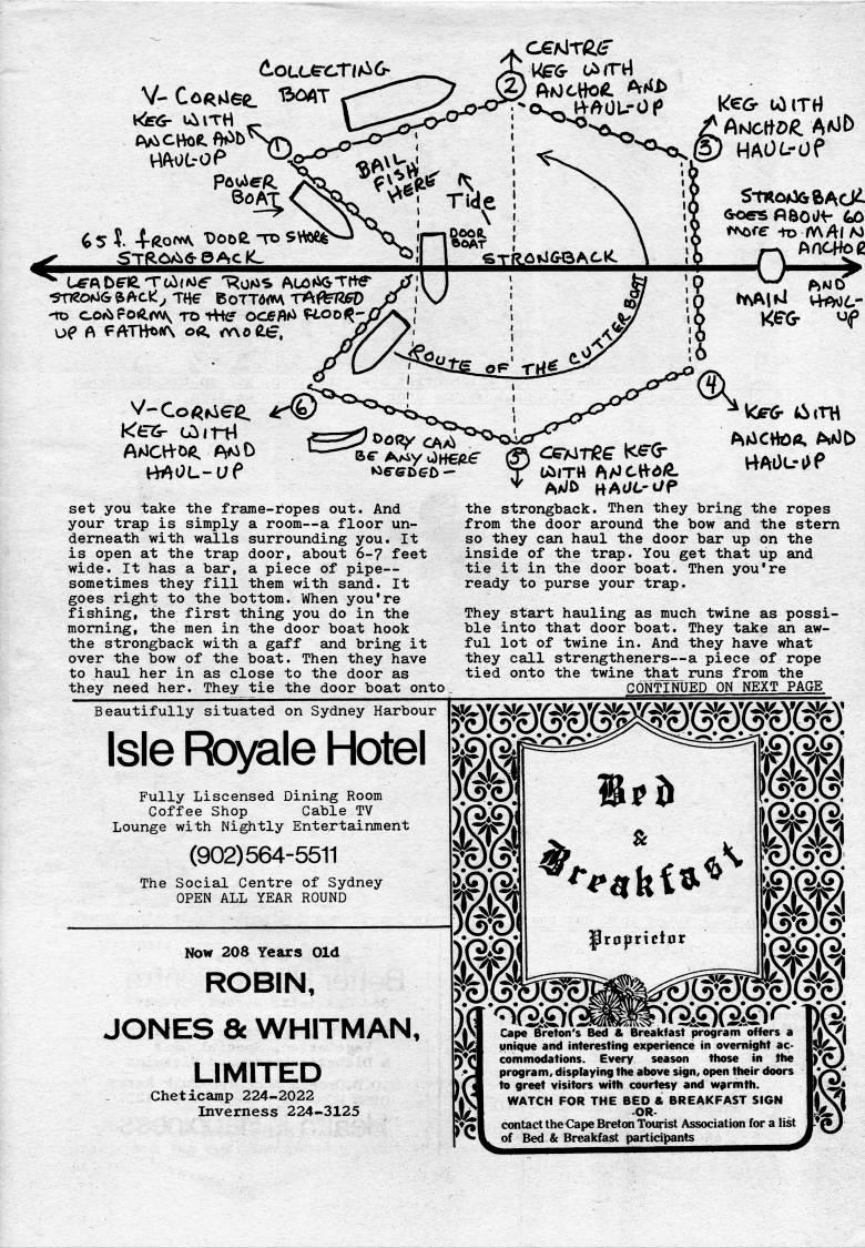 Published by Ronald Caplan on 1977/8/1 (380 reads)KCG- tOlTH S:) HAOL-Of <'oesPIBOUV 40 t4A0L-l>P set you take the frame-ropes out. And your trap is simply a room • a floor un? derneath with walls surrounding you. It is open at the trap door, about 6-7 feet wide. It has a bar, a piece of pipe • sometimes they fill them with sand. It goes right to the bottom. When you're fishing, the first thing you do in the morning, the men in the door boat hook the strongback with a gaff and bring it over the bow of the boat. Then they have to haul her in as close to the door as they need her. They tie the door boat onto. aa/J> haul-tip the strongback. Then they bring the ropes from the door around the bow guid the stem so they can haul the door bar up on the inside of the trap. You get that up and tie it in the door boat. Then you're ready to purse your trap. They start hauling as much twine as possi? ble into that door boat. They take an aw? ful lot of twine in. And they have what they call strengtheners • a piece of rope tied onto the twine that runs from the CONTINUED ON NEXT PAGE Beautifully situated on Sydney Harbour Isle Royale Hotel Fully Liscensed Dining Room Coffee Shop Cable TV Lounge with Nightly Entertainment (902)564-5511 The Social Centre of Sydney OPEN ALL YEAR ROUND Now 208 Years Old ROBIN, JONES & WHITMAN, LIMITED Cheticamp 224-2022 Inverness 224-3125 |/| l Cape Breton's Bed & Bi-eakfast program offers a J'VS unique and interesting experience in overniglit ac- P'V commodations. Every season those in ttie • ' program, dispfaying the alMve sign, open their doors 1' I to greet visitors with courtesy and warmth. F| WATCH FOR THE BED & BREAKFAST SIGN Jc OR t??35 I contact the Cape Breton Tourist Association for a list r '' of Bed & Breakfast participants j