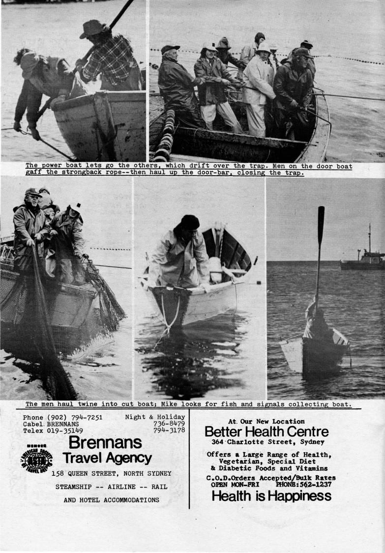 Published by Ronald Caplan on 1977/8/1 (403 reads)The power boat lets go the others, which drift over the trap. Men on the door boat gaff the strongback rope • then haul up the door-bar, closing the trap. The men haul twine into cut boat; Mike looks for fish and signals collecting boat Phone (902) 794-7251 Cabel. BRENNANS Night & Holiday 736-8479 Telex 019-35149 794-3178 Brennans Travel Agency 158 QUEEN STREET, NORTH SYDNEY STEAMSHIP • AIRLINE • RAIL AND HOTEL ACCOMMODATIONS At. Our New Location Better Health Centre 364 Charlotte Street, Sydney Offers a Large Range of Health, Vegetarian, Special Diet & Diabetic Foods and Vitamins C.O.D.Orders Accepts/Bulk Rates OBBN MON?FRI IHiOmt5'Z'XZ27 Health is Happiness
