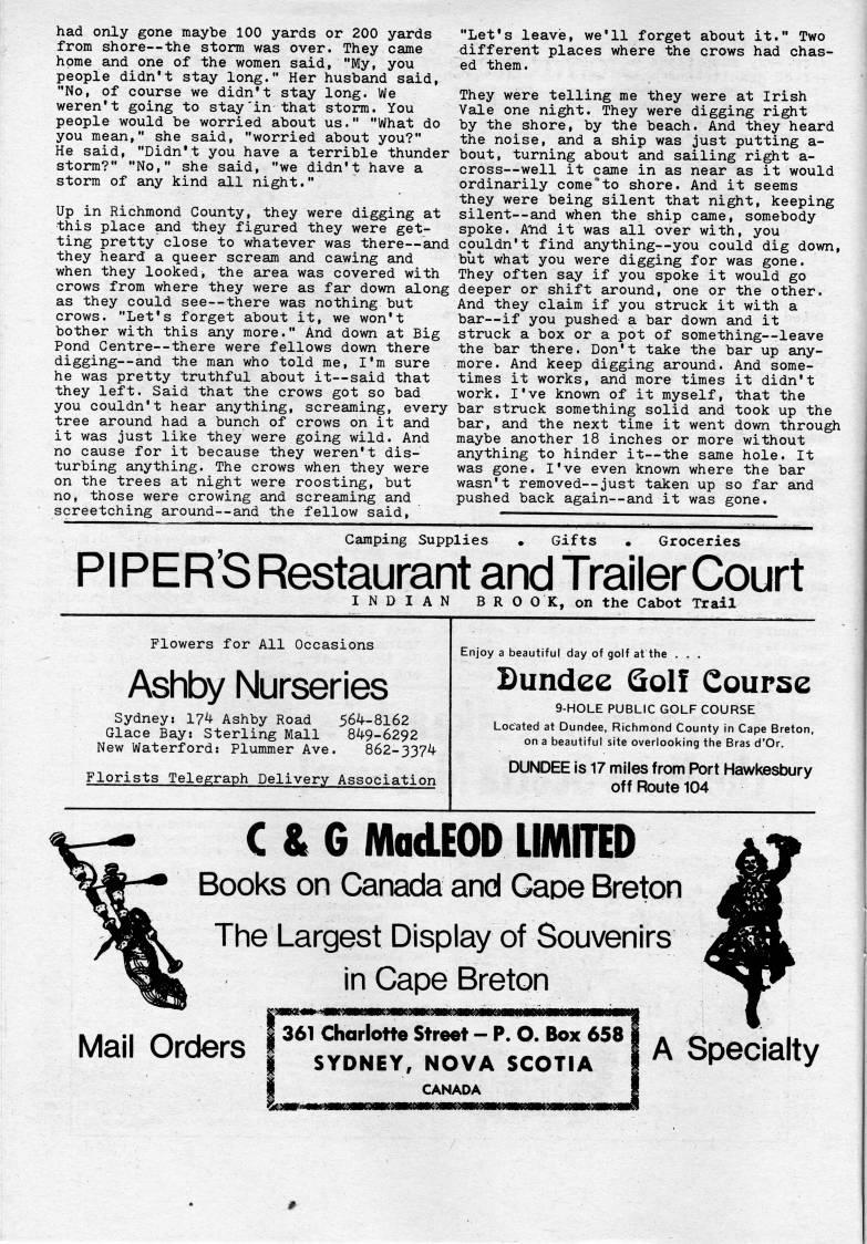 Published by Ronald Caplan on 1977/8/1 (468 reads)had only gone maybe 100 yards or 200 yards from shore • the storm was over. They came home and one of the women said, "My, you people didn't stay long." Her husband said, "No, of course we didn't stay long. We weren't going to stay'in that storm. You people would be worried about us." "What do you mean," she said, "worried about you?" He said, "Didn't you have a terrible thunder storm?" "No," she said, "we didn't have a storm of any kind all night." Up in Richmond County, they were digging at this place and they figured they were get? ting pretty close to whatever was there • and they heard a queer scream and cawing and when they looked, the area was covered with crows from where they were as far down along as they could see • there was nothing but crows. "Let's forget about it, we won't bother with this any more." And down at Big Pond Centre • there were fellows down there digging • and the man who told me, I'm sure he was pretty truthful about it • said that they left. Said that the crows got so bad you couldn't hear anything, screaming, every tree around had a bunch of crows on it and it was just like they were going wild. And no cause for it because they weren't dis? turbing anything. The crows when they were on the trees at night were roosting, but no, those were crowing and screaming and screetching around • and the fellow said. "Let's leavis, we'll forget about it." Two different places where the crows had chas? ed them. They were telling me they were at Irish Vale one night. They were digging right by the shore, by the beach. And they heard the noise, and a ship was just putting a- bout, turning about and sailing right a- cross • well it came in as near as it would ordinarily come"to shore. And it seems they were being silent that night, keeping silent • and when the ship came, somebody spoke. And it was all over with, you couldn't find anything • you could dig down, but what you were digging for was gone. They often say if you spoke it would go deeper or shift around, one or the other. And they claim if you struck it with a bar • if you pushed a bar down and it struck a box or a pot of something--leave the bar there. Don't take the bar up any? more. And keep digging around. And some? times it works, and more times it didn't work. I've known of it myself, that the bar struck something solid and took up the bar, and the next time it went down through maybe another 18 inches or more without anything to hinder it • the same hole. It was gone. I've even known where the bar wasn't removed • just taken up so far and pushed back again • and it was gone. Camping Supplies Gifts Groceries PIPER'S Restaurant andlrailer Court INDIAN B R O O K, on the Cabot Trail Flowers for All Occasions Ashby Nurseries Sydney: 174 Ashby Road 564-8162 Glace Bay: Sterling Mall 849-6292 New Waterford: Plummer Ave. 862-3374 Florists Telegraph Delivery Association Enjoy a beautiful day of golf at the . . . Dundee Sol! Course 9-HOLE PUBLIC GOLF COURSE Located at Dundee, Richmond County in Cape Breton, on a beautiful site overlooking the Bras d'Or. DUNDEE is 17 miles from Port Hawkesbury Off Route 104 C & G MadEOD LIMITED Books on Canada and Gape Breton The Largest Display of Souvenirs in Cape Breton Mail Orders I 361 Charlotte Street - P. O. Box 658 SYDNEY, NOVA SCOTIA CANADA A Specialty