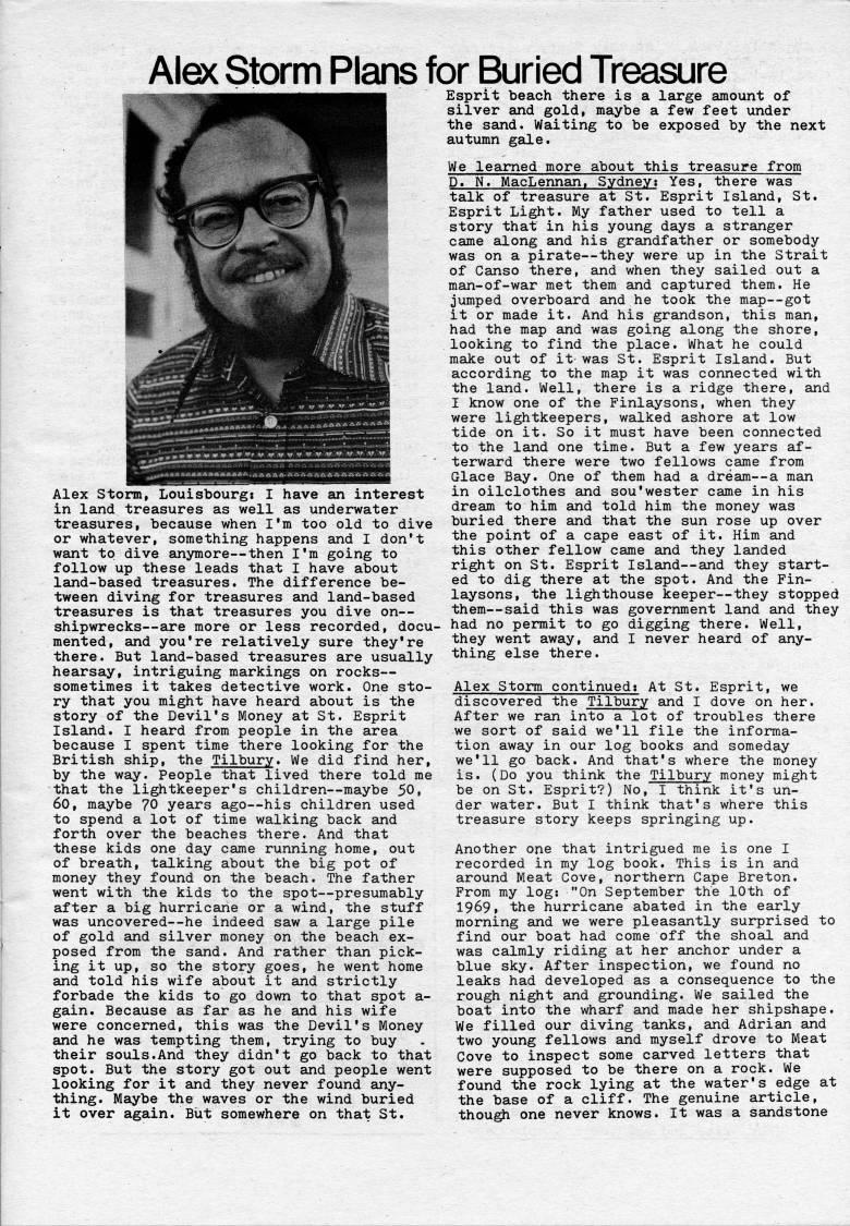 Published by Ronald Caplan on 1977/8/1 (885 reads)Alex Storm Plans for Buried Treasure Alex Storm, Louisbourg: I have an interest in land treasures as well as underwater treasures, because when I'm too old to dive or whatever, something happens and I don't want to dive anymore • then I'm going to follow up these leads that I have about land-based treasures. The difference be? tween diving for treasures and land-based treasures is that treasures you dive on • shipwrecks • are more or less recorded, docu? mented, and you're relatively sure they're there. But land-based treasures are usually hearsay, intriguing markings on rocks • sometimes it takes detective work. One sto? ry that you might have heard about is the story of the Devil's Money at St. Esprit Island. I heard from people in the area because I spent time there looking for the British ship, the Tilbury. We did find her, by the way. People that lived there told me that the lightkeeper's children • maybe 50, 60, maybe 70 years ago • his children used to spend a lot of time walking back and forth over the beaches there. And that these kids one day came running home, out of breath, talking about the big pot of money they found on the beach. The father went with the kids to the spot • presumably after a big hurricane or a wind, the stuff was uncovered • he indeed saw a large pile of gold and silver money on the beach ex? posed from the sand. And rather than pick? ing it up, so the story goes, he went home and told his wife about it and strictly forbade the kids to go down to that spot a- gain. Because as far as he and his wife were concerned, this was the Devil's Money and he was tempting them, trying to buy their souls.And they didn't go back to that spot. But the story got out and people went looking for it and they never found any? thing. Maybe the waves or the wind buried it over again. But somewhere on that St. Esprit beach there is a large amount of silver and gold, maybe a few feet under the sand. Waiting to be exposed by the next autumn gale. We learned more about this treasure from D. N. MacLennan, Sydney; Yes, there was talk of treasure at St. Esprit Island, St. Esprit Light. My father used to tell a story that in his young days a stranger came along and his grandfather or somebody- was on a pirate • they were up in the Strait of Canso there, and when they sailed out a man-of-war met them and captured them. He jumped overboard and he took the map • got it or made it. And his grandson, this man, had the map and was going along the shore, looking to find the place. What he could make out of it-was St. Esprit Island. But according to the map it was connected with the land. Well, there is a ridge there, and I know one of the Finlaysons, when they were lightkeepers, walked ashore at low tide on it. So it must have been connected to the land one time. But a few years af? terward there were two fellows came from Glace Bay. One of them had a dream • a man in oilclothes and sou'wester came in his dream to him and told him the money was buried there and that the sun rose up over the point of a cape east of it. Him and this other fellow came and they landed right on St. Esprit Island • and they start? ed to dig there at the spot. And the Fin? laysons, the lighthouse keeper • they stopped them • said this was government land and they . had no permit to go digging there. Well, they went away, and I never heard of any? thing else there. Alex Storm continued; At St. Esprit, we discovered the Tilbury and I dove on her. After we ran into a lot of troubles there we sort of said we'll file the informa? tion away in our log books and someday we'll go back. And that's where the money is. (Do you think the Tilbury money might be on St. Esprit?) No, I think it's un? der water. But I think that's where this treasure story keeps springing up. Another one that intrigued me is one I recorded in my log book. This is in and around Meat Cove, northern Cape Breton. From my log: "On September the 10th of 1969, the hurricane abated in the early morning and we were pleasantly surprised to find our boat had come off the shoal and was calmly riding at her anchor under a blue sky. After inspection, we found no leaks had developed as a consequence to the rough night and grounding. We sailed the boat into the wharf and made her shipshape. We filled our diving tanks, and Adrian and two young fellows and myself drove to Meat Cove to inspect some carved letters that were supposed to be there on a rock. We found the rock lying at the water's edge at the base of a cliff. The genuine article, though one never knows. It was a sandstone