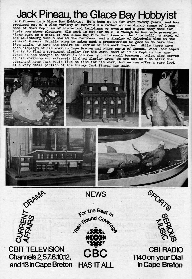 Published by Ronald Caplan on 1977/8/1 (834 reads)Hobbyist Jack Pineau is a Glace Bay Hobbyist. He's been at it for ov/r twenty years and has 'o'f n''n'"'' ?' f-"'''" Z''''' ?' materials a rather extraordinary ra'ge of Kems-! t'lL i ''?? ''P','''' ?' historical buildings or events and a good many made for t'oi' ',':'h'''''* pleasure. His work is not for sale, although hi has made prLenta- +i2''.'''''v '' ' "'"''' ?' ''? '1''? ''y Fi'e Hall (now at the fire hall), a model of the Louisbourg museum now at the fortress, and a display of Caledonia Mine at the Miners' Museum. Usually when he makes such a presentation he goes on to mice that ilZ H?''' "'' 5'r "'""' r''"*" collection of his work togethef. While the?' have for if ?''??nH ''' work in Cape Breton and other parts'f Canada, what Jack hopes for IS to find a permanent display for his work. Most of it is kept in the manv IV'UtJ'vly.''.'''f ''i '"''r '' ''' '''ly ''i'' '"''11 basement,'hich aLHerves as his workshop and extremely limited display area. We are not able to offer the permanent home Jack would like to find for his work, but we can offer a rare look at a very small portion of the things Jack Pineau h4s made. CBITTELEVISION Channels 2,5,7,8,10,12, and 13 In Cape Breton C BC HAS IT ALL CBI RADD 1140 on your Dial in Cape Breton