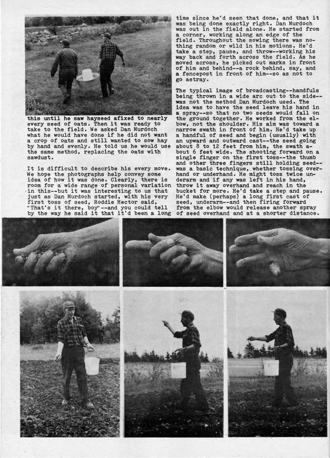 Published by Ronald Caplan on 1977/12/1 (414 reads)this until he saw hayseed afixed to nearly every seed of oats. Then it was ready to take to the field. We asked Dan Murdoch what he would have done if he did not want a crop of oats and still wanted to sow hay by hand and evenly. He told us he would use the same method, replacing the oats with sawdust. It is difficult to describe his every move. We hope the photographs help convey some idea of how it was done. Clearly, there is room for a wide range of personal variation • in this • but it was interesting to us that just as Dan Murdoch started, with his very first toss of seed, Roddie Hector said, "That's it there, boy" • and you could tell by the way he said it that it'd been a long time since he'd seen that done, and that it was being done exactly right. Dan Murdoch was out in the field alone. He started from a corner, working along an edge of the field. Throughout the sowing there was no? thing random or wild in his motions. He'd take a step, pause, and throw • working his way back and forth across the field. As he moved across, he picked out marks in front of him and behind • a rock behind, say, and a fencepost in front of him • so as not to go astray. The typical image of broadcasting • handfuls being thrown in a wide arc out to the side • was not the method Dan Murdoch used. The idea was to have the seed leave his hand in a spray • so that no two seeds would fall on the ground together. He worked from the el? bow, not the shoulder. His aim was toward a narrow swath in front of him. He'd take up a handful of seed and begin (usually) with an upward and outward cast • the seed going about 8 to 12 feet from him, the swath a- bout 6 feet wide. The shooting forward on a single finger on the first toss • the thumb and other three fingers still holding seed • was a basic technique, whether tossing over? hand or underhand. He might toss twice un? derarm and if any was left in his hand, throw it away overhand and reach in the bucket for more. He'd take a step and pause. He'd make (perhaps) a long first cast of seed, underarm • and then firing forward from the elbow would release another spray of seed overhand and at a shorter distance.
