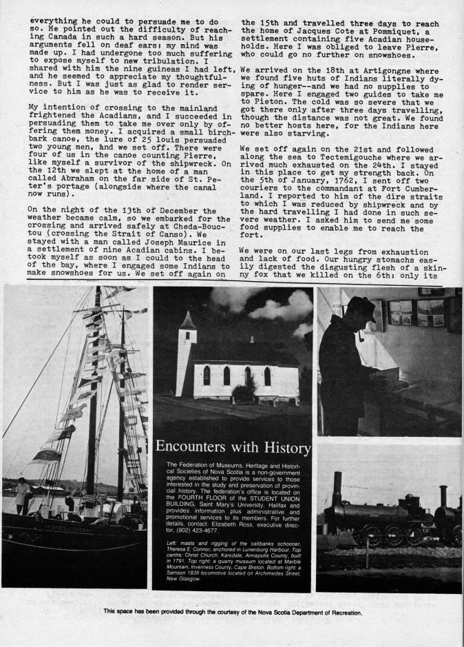 Published by Ronald Caplan on 1977/12/1 (519 reads)everything he could to persuade me to do so. He pointed out the difficulty of reach? ing Canada in such a hard season. But his arguments fell on deaf ears; my mind was made up. I had undergone too much suffering to expose myself to new tribulation. I shared with him the nine guineas I had left, and he seemed to appreciate my thoughtful- ness. But I was just as glad to render ser? vice to him as he was to receive it. My intention of crossing to the mainls'nd frightened the Acadians, and I succeeded in persuading them to take me over only by of? fering them money. I acquired a small birch? bark canoe, the lure of 25 louis persuaded two young men, Sind we set off. There were four of us in the canoe counting Pierre, like myself a survivor of the shipwreck. On the 12th we slept at the home of a man called Abraham on the far side of St. Pe? ter's portage (alongside where the canal now runs). On the night of the 13th of December the weather became calm, so we embarked for the crossing and arrived safely at Cheda-Bouc- tou (crossing the Strait of Canso). We stayed with a man called Joseph Maurice in a settlement of nine Acadian cabins. I be? took myself as soon as I could to the head of the bay, where I engaged some Indians to make snowshoes for us. We set off again on the 15th and travelled three days to reach the home of Jacques Cote at Pommiquet, a settlement containing five Acadian house? holds. Here I was obliged to leave Pierre, who could go no further on snowshoes. We arrived on the l8th at Artigongne where we found five huts of Indians literally dy? ing of hunger • and we had no supplies to spare. Here I engaged two guides to take me to Pieton. The cold was so severe that we got there only after three days travelling, though the distance was not great. We found no better hosts here, for the Indians here were also starving. We set off again on the 21st and followed along the sea to Tectemigouche where we ar? rived much exhausted on the 24th. I stayed in this place to get my strength back. On the 5th of January, 1762, I sent off two couriers to the commandant at Fort Cumber? land. I reported to him of the dire straits to which I was reduced by shipwreck and by the hard travelling I had done in such se? vere weather. I asked him to send me some food supplies to enable me to reach the fort. We were on our last legs from exhaustion and lack of food. Our hungry stomachs eas? ily digested the disgusting flesh of a skin? ny fox that we killed on the 6th; only its Ui Encounters with History The Federation of Museums, Heritage and Histori? cal Societies of Nova Scotia is a non-government agency established to provide services to those interested in the study and preservation of provin? cial history. The federation's office is located on the FOURTH FLOOR of the STUDENT UNION BUILDING, Saint Marys University, Halifax and provides information plus administrative and promotional services to its members. For further details, contact: Elizabeth Ross, executive direc? tor, (902) 423-4677. Left: masts and rigging of the saltbanks schooner, Theresa E. Connor, anchored in Lunenburg Harbour. Top centre: Christ Church, Karsdale, Annapolis County, built in 1791. Top right: a quarry museum located at Marble Mountain, Inverness County, Cape Breton. Bottom right: a Samson 1838 locomotive located on Archimedes Street, This space has been provided through the courtesy of the Nova Scotia Department of Recreation.