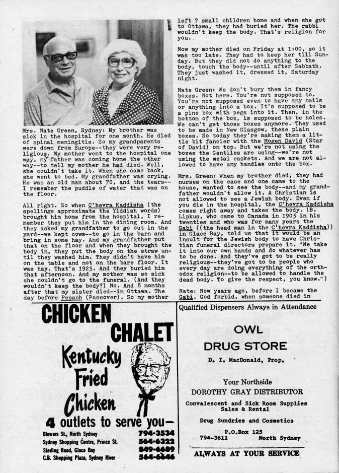 Published by Ronald Caplan on 1977/12/1 (349 reads)Mrs. Nate Green, Sydney: My brother was sick in the hospital for one month. He died of spinal meningitis. So my grandparents were down from Europe • they* were very re? ligious. My mother went to the hospital one way, my*father was coming home the other w*ay--to tell my mother he had died. Well, she couldn't take it. When she came back, she went to bed. My grandfather was crying. He was an old man about 70, and the tears • I remember the puddle of water that was on the floor. All right. So when C'hevra Kaddisha (the spellings approximate the Yiddish words) brought him home from the hospital, I re? member they put him in the dining room. And they asked my grandfather to go out in the yard • we kept cows • to go in the barn and bring in some hay. And my grandfather put that on the floor and when they brought the body in, they put the body on the straw un? til they washed him. They didn't have him on the table and not on the bare floor. It was hay. That's 1925- And they buried him that afternoon. And my mother was so sick she couldn't go to the funeral. (And they wouldn't keep the body?) No. And 8 months after that my sister died • in Ottawa. The day before Pesach ('assover). So my mother left 7 small children home and when she got to Ottawa, they had buried her. The rabbi wouldn't keep the body. That's religion for you. . Now my mother died on Friday at 1:00, so it was too late. They had to keep her till Sun? day. But they did not do anything to the body, touch the body--until after Sabbath. They just washed it, dressed it, Saturday night. Nate Green: We don't bury them in fancy boxes. Not here. You're not supposed to. You're not supposed even to have any nails or anything into a box. It's supposed to be a pine box with pegs into it. Then, in the bottom of the box, is supposed to be holes. We can't get those boxes anymore. They used to be made in New Glasgow, these plain boxes. So today they're making them a lit? tle bit fancier with the Mogen David (Star of David) on top. But we're not using the boxes the Gentiles are using • we're not using the metal caskets. And we are not al? lowed to have any handles onto the box. Mrs. Green: When my brother died, they had nurses on the case and one came to the house, wanted to see the body • and my grand? father wouldn't allow it. A Christian is not allowed to see a Jewish body. Even if you die in the hospital, the C'hevra Kaddisha comes right away and takes the body. (B. Lipkus, who came to Canada in 1905 in his twenties and who was for many years the Gabi ((the head man in the C'hevra Kaddisha)) in Glace Bay, told us that it would be an insult for the Jewish body to have Chris? tian funeral directors prepare it. "We take it into our own hands and do whatever has to be done. And they've got to be really religious • they've got to be people who every day are doing everything of the orth? odox religion • to be allowed to handle the dead body. To give the respect, you know.") Nate: Now years ago, before I became the Gabi, God forbid, when someone died in CHICKEN _ CHALET K?ntU(;la| fried 4 outlets to serve'you- BioweR St, North Sydney 794-3S34 Sydney Shopping Centre, Prince St Sterling Road, Glace Bay CB. Shopping Pbza, Sydney River Qualified Dispensers Always in Attendance OWL DRUG STORE D. ! MacDonald t Propo Your Northside DOROTHY GRAY DISTRIBUTOR Convalescent and Sick Room Supplies Sales & Rental Drug Sundries and Cosnetics P.O.Box 125 794-3611 North Sydney AI4WAYS AT YOUR SERVICE