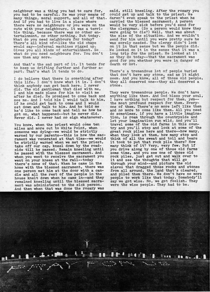 Published by Ronald Caplan on 1977/12/1 (304 reads)neighbour was a thing you had to care for, you had to be careful. He was your means of many things, moral support, and all of that. And if you had to live in a place where there were no neighbours or you were on the outs with your neighbours, it was a terri? ble thing, because there was no other en? tertainment, no other nothing. But today. What do you need neighbours for today? There's all kind of-*-like the old chaps would say • infernal machines rigged up. Gives you all kinds of entertainment. So what do you need neighbours for. You don't use them any more. And that's the sad part of it. It tends for to keep us drifting further and further a- part. That's what it tends to do. I do believe that there is something after this life. I don't know what it is. I don't think anybody can get back here. I never did. The old gentleman that died with me, I and him made plans for him to visit me after he died. He promised to come back and see me. And I told him I would talk to him, if he could get back to come and I would set down and talk to him. And he told me he'd like to come back and tell me how he got on, what happened • but he never did. Never did. I never had no sign whatsoever. You know, when the priest would come ten miles and more out to White Point, when someone was dying • we would be strictly warned by our parents • this is how the sac? rament was venerated at that time • we would be strictly warned when we met the priest, take off our cap, kneel down by the road? side till he passed. Remain kneeling until he passed with the blessed sacrament. And when you went to receive the sacrament you went on your knees at the rail • today there's none of that. When he came in the home with the blessed sacrament, there was one person met him at the door with a can? dle and all the rest of the people in the house knelt down when he came in • and they remained kneeling until the blessed sacra? ment was administered to the sick person. And then when that was done the rosary was said, still kneeling. After the rosary you could get up and talk to the priest. We daren't even speak to the priest when he carried the blessed sacrament. A person would be very sick before you'd send for the clergyman. (So a person would know they were going to die?) Well, that was about the size of the situation. And we wouldn't send for him until you were pretty sure he was sorely needed. The clergy didn't look on it in that sense but we the people did. We looked on it in the sense that it was a long trip for the priest. He looked at it as they do today • that the sacrament was good for you whether you were in danger of death or not. There's a tremendous lot of people buried that don't have any stone, sad as it might seem. And you know, all of those old people, they all deserved one • they all deserved a stone.. They were tremendous people. We don't have anything like them. And God bless your soul, I have nothing but respect for them, ye's • the most profound respect for them. Every? one of them. There's no more left like them and no more to come like them. All you need do sometimes, if you have a little imagina? tion, is roam through the countryside and let your imagination run wild. And you'll travel some of the old farms in this coun? try and you'll stop and look at some of the great rock piles here and there • how many, when they look at them, how many stop and think of all the sweat and toil and tears it took to put that rock pile there? How many think of it? Very, very few. But if you drive along by one of those old farms some time, and you see one of those old rock piles, just get out and walk over to it and see the thoughts that will go through your mind • and picture the old slaves that dragged those rocks and stones from all around, the land that's cleared, and piled them there. We don't have no more people to work like that today. Somebody'll say we got wise. No, we got foolish. They were the wise people. They had to be. 11 I i-? '* • ? I • ? 1'' i