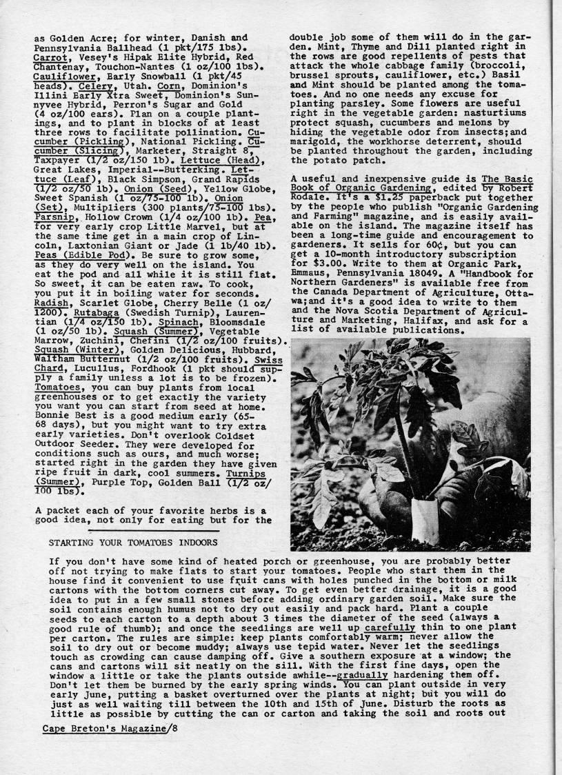 as Golden Acre; for winter, Danish and Pennsylvania Ballhead (1 pkt/175 lbs). Carrot, Vesey's Hipak Elite Hybrid, Red Chantenay, Touchon-Nantes (1 oz/lOO lbs). Cauliflower, Early Snowball (1 pkt/45 heads). Celery, Utah. Corn, Dominion's mini Early Xtra Sweet, Dominion's Sun- nyvee Hybrid, Perron's Sugar and Gold (4 oz/lOO ears). Plan on a couple plant? ings, and to plant in blocks of at least three rows to facilitate pollination. Cu- cumber (Pickling), National Pickling. Cu? cumber (SlicingT* Marketer, Straight 8, Taxpayer Cl/2 oz/150 lb). Lettuce (Head), Great Lakes, Imperial • Butterking. Let? tuce (Leaf), Black Simpson, Grand Rapids (1/2 oz/50 lb). Onion (Seed). Yellow Globe, Sweet Spanish (1 oz/75-100 lb). Onion (Set). Multipliers (300 plants/75-100 lbs). Parsnip. Hollow Crown (1/4 oz/lOO lb). Pea, for very early crop Little Marvel, but at the same time get in a main crop of Lin? coln, Laxtonian Giant or Jade (1 lb/40 lb). Peas (Edible Pod). Be sure to grow some, as they do very well on the island. You eat the pod and all while it is still flat. So sweet, it can be eaten raw. To cook, you put it in boiling water for seconds. Radish. Scarlet Globe, Cherry Belle (1 oz/ 1200). Rutabaga (Swedish Turnip), Lauren- tian (1/4 oz/150 lb). Spinach, Bloomsdale (1 oz/50 lb). Squash (Summer), Vegetable Marrow, Zuchini, Chefini (1/2 oz/lOO fruits), Squash (Winter). Golden Delicious, Hubbard, waltham Butternut (1/2 oz/lOO fruits). Swiss Chard, Lucullus, Fordhook (1 pkt should sup? ply a family unless a lot is to be frozen). Tomatoes, you can buy plants from local greenhouses or to get exactly the variety you want you can start from seed at home. Bonnie Best is a good medium early (65- 68 days), but you might want to try extra early varieties. Don't overlook Coldset Outdoor Seeder. They were developed for conditions such as ours, and much worse; started right in the garden they have given ripe fruit in dark, cool summers. Turnips (Summer). Purple Top, Golden Ball (1/2 oz/ 100 lbs). ' A packet each of your favorite herbs is a good idea, not only for eating but for the double job some of them will do in the gar? den. Mint, Thyme and Dill planted right in the rows are good repellents of pests that attack the whole cabbage family (broccoli, brussel sprouts, cauliflower, etc.) Basil and Mint should be planted among the toma? toes. And no one needs any excuse for planting parsley. Some flowers are useful right in the vegetable garden: nasturtiums protect squash, cucumbers and melons by hiding the vegetable odor from insects;and marigold, the workhorse deterrent, should be planted throughout the garden, including the potato patch. A useful and inexpensive guide is The Basic Book of Organic Gardening, edited by Robert Rodale. It's a $1.25 paperback put together by the people who publish "Organic Gardening and Farming" magazine, and is easily avail? able on the island. The magazine itself has been a long-time guide and encouragement to gardeners. It sells for 60<;i, but you can get a lO-month introductory subscription for $3.00. Write to them at Organic Park, Emmaus, Pennsylvania 18049. A "Handbook for Northern Gardeners" is available free from the Canada Department of Agriculture, Otta? wa; and it's a good idea to write to them and the Nova Scotia Department of Agricul? ture and Marketing, Halifax, and ask for a list of available publications. STARTING YOUR TOMJVTOES INDOORS If you don't have some kind of heated porch or greenhouse, you are probably better off not trying to make flats to start your tomatoes. People who start thera in the house find it convenient to use fi;uit cans with holes punched in the bottom or milk cartons with the bottom corners cut away. To get even better drainage, it is a good idea to put in a few small stones before adding ordinary garden soil. Make sure the soil contains enough humus not to dry out easily and pack hard. Plant a couple seeds to each carton to a depth about 3 times the diameter of the seed (always a good rule of thumb); and once the seedlings are well up carefully thin to one plant per carton. The rules are simple: keep plants comfortably warm; never allow the soil to dry out or become muddy; always use tepid water. Never let the seedlings touch as crowding can cause damping off. Give a southern exposure at a window; the cans and cartons will sit neatly on the sill. With the first fine days, open the window a little or take the plants outside awhile • gradually hardening them off. Don't let them be burned by the early spring winds. You can plant outside in very early June, putting a basket overturned over the plants at night; but you will do just as well waiting till between the 10th and 15th of June. Disturb the roots as little as possible by cutting the can or carton and taking the soil and roots out Cape Breton's Magazine/8