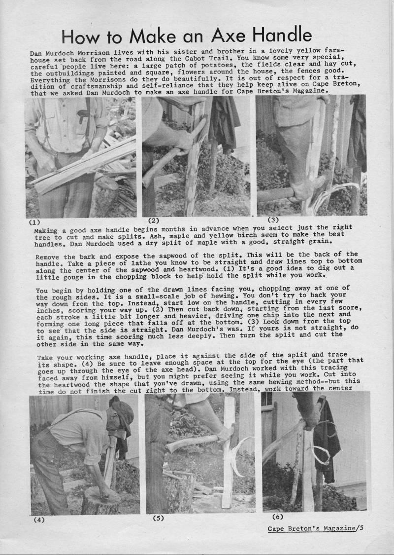 Published by Ronald Caplan on 1972/10/31 (11758 reads)How to Make an Axe Handle Dan Murdoch Morrison lives with his sister and brother in a lovely yellow farm? house set back from the road along the Cabot Trail. You know some very special, careful people live here: a large patch of potatoes, the fields clear and hay cut, the outbuildings painted and square, flowers around the house, the fences good. Everything the Morrisons do they do beautifully. It is out of respect for a tra? dition of craftsmanship and self-reliance that they help keep alive on Cape Breton, that we asked Dan Murdoch to make an axe handle for Cape Breton's Magazine. i?j (2) (3) Making a good axe handle be;gins months in advance when you select just the right tree to cut and make splits. Ash, maple and yellow birch seem to make the best handles. Dan Murdoch used a dry split of maple with a good, straight grain. Remove the bark and expose the sapwood of the split. This will be the back of the handle. Take a piece of lathe you know to be straight and draw lines top to bottom along the center of the sapwood and heartwood. (1) It's a good idea to dig out a little gouge in the chopping block to help' hold the split while you work. You begin by holding one of the drawn lines facing you, chopping away at one of the rough sides. It is a small-scale job of hewing. You don't try to hack your way down from the top. Instead, start low on the handle, cutting in every few inches, scoring your way up. (2) Then cut back down, starting from the last score, each stroke a little bit longer and heavier, driving one chip into the next and forming one long piece that falls off at the bottom. (3) Look down from the top to see that the side is straight. Dan Murdoch's was. If yours is not straight, do it again, this time scoring much less deeply. Then turn the split and cut the other side in the same way. Take your working axe handle, place it against the side of the split and trace its shape. (4) Be sure to leave enough space at the top for the eye (the part that goes up through the eye of the axe head). Dan Murdoch worked with this tracing faced away from himself, but you might prefer seeing it while you work. Cut into the heartwood the shape that you've drawn, using the same hewing method • but this tim<=?? do not finish the cut riglit t-y :' 'ottora. Instead, work toward the center (5) (6) Cape Breton's Magazine/5