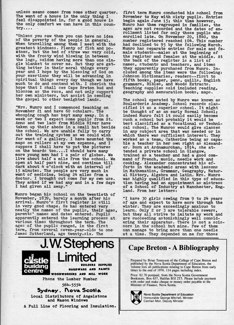 Published by Ronald Caplan on 1978/8/1 (376 reads)unless means comes from some other quarter. The want of a house is the only thing I feel disappointed in, for a good house is the only comfort we can have in this coun? try. ... "Unless you saw them you can have no idea of the poverty of the people in general. When travelling among them I meet with the greatest kindness. Plenty of fish and po- atoes, but the bed of straw was very cold, with the frosty wind blowing in between the logs, seldom having more than one sin? gle blanket to cover me. But they are get? ting better in their moral things every year and.I hope by the blessing of God on your exertions they will be advancing in spiritual things every day though we have much to do and contend with. I cherish the hope that I shall see Cape Breton bud and blossom as the rose, and not only support her own ministers, but assist in sending the gospel to other benighted lands. "Mrs. Munro and I commenced teaching on November 21 and have 60 scholars. The whooping cough has kept many away. In a week or two I expect some pupils from St. Anns and two lads from Middle River have taken up their abode in a small hut beside the school. We are unable fully to carry out the training system as we could wish for want of a gallery. I have mounted the maps on rollers at my own expense, and I suppose I shall have to put the pictures on the boards too....I should have many more young men had I a pair of globes. We live about half a mile from the school. We open at half past nine, and continue till dark about 4 o'clock with an interval of 15 minutes. The people are very much in want of medicine, being 24 miles from a doctor. I brought out some for my own use. They asked if we had any and in a few days I had given all away." Munro began his school on the twentieth of November, 1839, barely a month after his arrival. Munro's first register is still in very good shape. He has entered very neatly the names of the pupils, their ages, parents' names and dates entered. Pupils apparently entered the learning process at, various times throughout the term. The ages of the pupils ranged, in the first term, from several seven-year-olds to one-' James Sutherland, age twentjr'-six. The fil'st term Munro conducted his school from November to May with sixty pupils. Entries begin again June 15; this time however, Munro has them regrouped in families, the ages are not recorded and the dates of en? rollment listed for only those pupils who enrolled late. On November 20, l840, the number registered reached 104. This nximber had declined to 95 by the following March. Mtinro has separate entries for male and fe? male students • males at the beginning of the register and females at the middle. At the back of the register is a list of names, students and teachers, and items they apparently purchased from Munro. In? cluded among the items were the following; Johnson Dictionaries, readers • first to fifth books, paper, pens, quills, English grammars. Bibles, and Woods Extracts. Teaching supplies sold included reading, geography and mensuration books, maps. The school operated by Munro was known as Boularderie Academy. School records clas? sified it as a superior school. It might be thought of as an early Normal School? indeed Munro felt it could easily become such a school but probably it would be best classified as a Vocational or Techni? cal school. The Munros would give classes in any subject area that was needed or in which there was sufficient interest. They worked as a team, Catherine being as capa? ble a teacher in her own right as Alexand? er. Born at Ardnamurchan, I8l4, she at? tended a private school in Glasgow, trained as a teacher and had a good com? mand of French, music, needle work and cooking. Alexander concentrated his ef? forts in the academic areas with lessons in Mathematics, Grammar, Geography, Natur? al History, Algebra and Latin. Mrs. Munro was highly qualified in this type of educa? tion having had an appointment as' mistress of a School of Industry at Manchester, Eng? land. From her letters: "I have 30 girls sewing from 9 to 24 years of age and expect to have more through the winter. They are exceedingly anxious to learn. Only 2 or 3 are tolerable sewers, but they all strive to imitate my work and are succeeding astonishingly well consid? ering their apparatus. There is not a scis? sors in the"school but mine. Few of them can manage to bring more than one needle at a time. They depended on me for those J. W. Stephens cSSstle Limited building centre ??UllDilkS SUPHIIS harpWari an?? faints WOODWORKIRS AND JMtlL WORK Phone the Lumber Number Sydit my 564-5554 , IXovak Scotia Local Distributors of Angelstone and Mason Windows A Full Line of Flooring and Insulation. Cape Breton - A Bibliography Prepared by Brian Tennyson of the College of Cwpe Breton and published by the Nova Scotia Department of Education, the volume lists all publications relating to Cape Breton from early times to the end of 1976. 114 pages including index. Price: $2.70 postpaid, from the Nova Scotia Government Bookstore, Box 637, Halifax B3J 2T3. Please include payment with order and make cheque or money order payable to the Minister of Finance, Nova Scotia. Nova Scotia Department of Education Honourable George Mitchell, Minister Carmen Moir, Deputy Minister