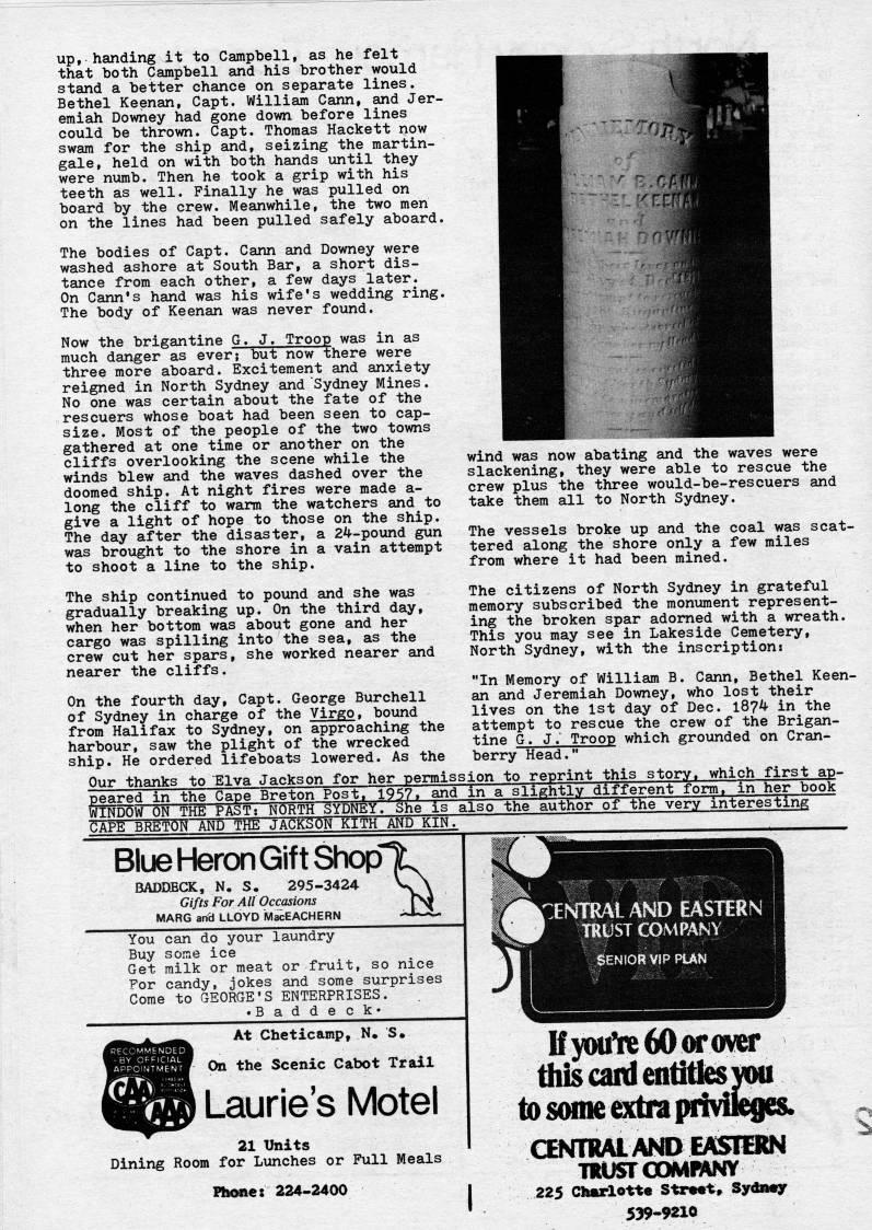 Published by Ronald Caplan on 1978/8/1 (357 reads)up, handing it to Campbell, as he felt that both Campbell and his brother would stand a better chance on separate lines. Bethel Keenan, Capt. William Cann, and Jer? emiah Downey had gone down before lines could be thrown. Capt. Thomas Hackett now swam for the ship and, seizing the martin? gale, held on with both hands imtil they were numb. Then he took a grip with his teeth as well. Finally he was pulled on board by the crew. Meanwhile, the two men on the lines had been pulled safely aboard. The bodies of Capt. Cann and Downey were washed ashore at South Bar, a short dis? tance from each other, a few days later. On Cann's hand was his wife's wedding ring. The body of Keenan was never found. Now the brigantine G. J. Troop was in as much danger as ever; but now there were three more aboard. Excitement and anxiety reigned in North Sydney and "Sydney Mines. No one was certain about the fate of the rescuers whose boat had been seen to cap? size. Most of the people of the two towns gathered at one time or another on the cliffs overlooking the scene while the winds blew and the waves dashed over the doomed ship. At night fires were made a- long the cliff to warm the watchers and to give a light of hope to those on the ship. The day after the disaster, a 24-pound gun was brought to the shore in a vain attempt to shoot a line to the ship. The ship continued to pound and she was gradually breaking up. On the third day, when her bottom was about gone and her cargo was spilling into the sea, as the crew cut her spars, she worked nearer and nearer the cliffs. On the fourth day, Capt. George Burchell of Sydney in charge of the Virgo, bound from Halifax to Sydney, on approaching the harbour, saw the plight of the wrecked ship. He ordered lifeboats lowered. As the Our thanks to Elva Jackson for her permisi wind was now abating and the waves were slackening, they were able to rescue the crew plus the three would-be-rescuers and take them all to North Sydney. The vessels broke up and the coal was scat? tered along the shore only a few miles from where it had been mined. The citizens of North Sydney in grateful memory subscribed the monument represent? ing the broken spar adorned with a wreath. This you may see in Lakeside Cemetery, North Sydney, with the inscription: "In Memory of William B. Cann, Bethel Keen? an and Jeremiah Downey, who lost their lives on the 1st day of Dec. 1874 in the attempt to rescue the crew of the Brigan? tine G. J. Troop which grounded on Cran? berry Head." sion to reprint this story, which first ap? peared in the Gape Breton Post, 1957t and m a slightly different form, in her book WINDOVTON" THE PAST; NORTH SYDNEY. She is also the author of the very interesti"ng CAPE BRETON AND THE JACKSON KITH AND KIN Blue Heron Gift ShopT BADDECK, N. S. 295-3424 V/ Gifts For All Occasions J>' MARG and LLOYD MacEACHERN • ' • ??>*?? You can do your laundry Buy some ice Get milk or meat or fruit, so nice For candy, jokes and some surprises Come to GEORGE'S ENTERPRISES. • Baddeck* At Cheticamp, N. S. On the Scenic Cabot Trail Laurie's Motel 21 Units Dining Room for Lunches or Full Meals Ph'fie: 224-2400 rENTRAl AND EASTERN ' TRUST COMPANY SENIOR VIP PUN lfyMi'k?60orover this canl entities you to some extra privikges. aNTRAl AND EASTERN TRUST OOMMNY 225 Ckarlottc StoMt. Sydnajr 539-9210 S,