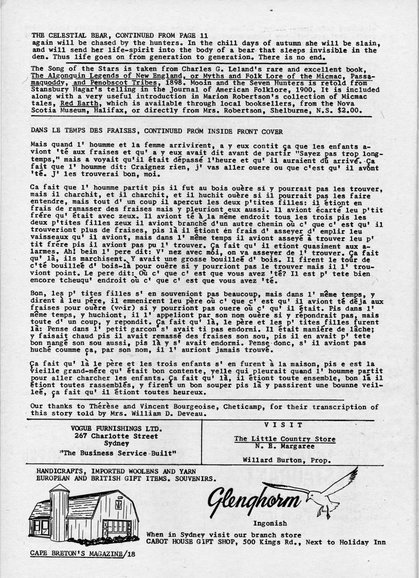 Published by Ronald Caplan on 1973/3/1 (645 reads)THE CELESTIAL BEAR, CONTINUED FROM PAGE 11 again will be chased by the hunters. In the chill days of autumn she will be slain, and will send her life-spirit into the body of a bear that sleeps invisible in the den. Thus life goes on from generation to generation. There is no end. The Song of the Stars is taken from Charles G. Leland's rare and excellent book. The Algonquin Legends of New England, or Myths and Folk Lore of the Micmac, Passa? maquoddy. and Penobscot Tribes. 1898. Mooin and the Seven Hunters is retold from Stansbury Hagar's telling in the Journal of American Folklore, 1900. It is included along with a very useful introduction in Marion Robertson's collection of Micmac tales. Red Earth, which is available through local booksellers, from the Nova Scotia Museum, Halifax, or directly from Mrs, Robertson, Shelburne, N.S. $2.00. DANS LE TEMPS DES FRAISES, CONTINUED FROM INSIDE FRONT COVER Mais quand 1' houmme et la femme arrivirent, a y eux contit ca que les enfants a- viont 'te aux fraises et qu' a y eux avait dit avant de partir "Sayez pas trop long? temps," mais a voyait qu'il 6tait depasse I'heure et qu' il auraient dS arriv'. Ca fait que 1' houmme dit: Craignez rien, j' vas aller ouere ou que c'est qu?? il avont • t$. J' les trouverai bon, moi. Ca fait que 1' houmme partit pis il fut au bois ouere si y pourrait pas les trouver, mais il charchit, et il charchit, et il huchit ou're si il pourrait pas les faire entendre, mais tout d' un coup il apercut les deux p'tites filles: il 'tiont en frais de ramasser des fraises mais y pleuriont eux aussi, II aviont ecarte' leu p'tit frere qu' 'tait avec zeux, II aviont te la meme endroit tous les trois pis les deux p'tites filles zeux il aviont branche d'un autre chemin ou c' que c' est qu' il trouveriont plus de fraises, pis la il etiont en frais d' asseyer d' emplir leu vaisseaux qu' il aviont, mais dans 1?? m'me temps il aviont asseye a trouver leu p' tit frere pis il aviont pas pu 1?? trouver. Ca fait qu' il etiont quasiment aux a- larmes. Ah! bein 1' pere dit: V nez avec moi, on va asseyer de 1?? trouver. Ca fait qu' la, ils marchisent.'Y avait une grosse bouillee d' bois. II firent le tour de c'te bouille' d* boiS-la pour ouire si y pourriont pas le trouver mais il 1' trou- viont point. Le pere dit:'cfu c' que c' est que vous avez 'tS? II est p* tete bien encore tcheuqu* endroit ou c' que c' est que vous avez 'te. Bon, les p' tites filles s' en souveniont pas beaucoup, mais dans 1' meme temps, y dirent leu pere, il emmenirent leu pere ou c' que c' est qu' il aviont tS d • ja au " " ' - . _- ' ', mais furent _ petit garcon*s' avait ti pas y faisait chaud pis il avait remasse des fraises son sou, pis il en avait p?? tete bon nange son sou aussi, pis ilk. y s' avait endormi, Pense done, s' il aviont pas huche coumme ca, par son nom, il 1' auriont jamais trouve. Ca fait qu' la le pere et les trois enfants s' en furent a la maison, pis e est la' vieille grand-m're qu' etait bon contente, yelle qui pleurait quand 1' houmme partit pour aller charcher les enfants, Ca fait qu' lE, il etiont toute ensemble, bon la il etiont toutes rassembl's, y firent un bon souper pis la y passirent une bounne veil- lee, ca fait qu' il Etiont toutes heureux. Our thanks to Therese and Vincent Bourgeoise, Cheticamp, for their transcription of this story told by Mrs. William D. Deveau, VOGUE FURNISHINGS LTD. 267 Charlotte Street Sydney "the Business Service-Built" VISIT The Little Country Store N. • ?? Margaree Willard Burton, Prop. HANDICRAFTS, IMPORTED WOOLENS AND YARN EUROPEAN AND BRITISH GIFT ITEMS. SOUVENIRS Ingonish When in Sydney visit our branch store CABOT HOUSE GIFT SHOP, 500 Kings Rd., Next to Holiday Inn CAPE BRETON'S MAGAZINE/lS