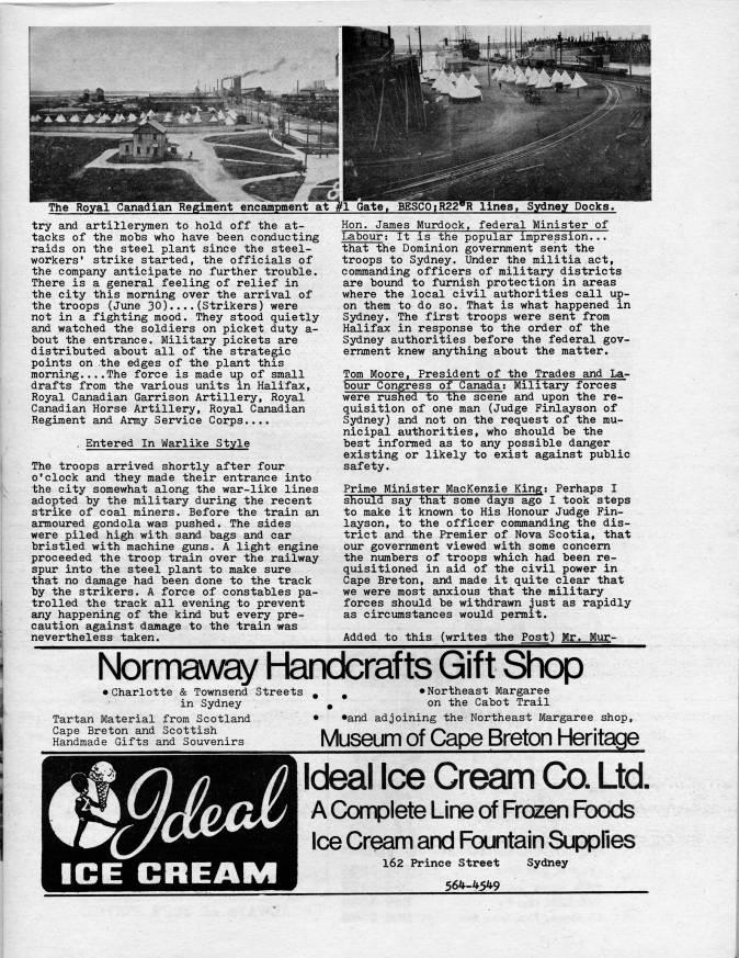 The Royal Canadian Regiment enc'pment at'fl Gate try and artillerymen to hold off the at? tacks of the mobs who have been conducting raids on the steel plant since the steel? workers* strike started, the officials of the company anticipate no further trouble. There is a general feeling of relief in the city this morning over the arrival of the troops (June 30)....(Strikers) were not in a fighting mood. They stood quietly and watched the soldiers on picket duty a- bout the entrance. Military pickets are distributed about all of the strategic points on the edges of the plant this morning....The force is made up of small drafts from the various units in Halifax, Royal Canadian Garrison Artillery, Royal Canadian Horse Artillery, Royal Canadian Regiment and Army Service Corps.... • Entered In Warlike Style The troops arrived shortly after four o'clock and they made their entrance into the city somewhat along the war-like lines adopted by the military during the recent strike of coal miners. Before the train an armoured gondola was pushed. The sides were piled high with sand bags and car bristled with machine guns. A light engine proceeded the troop train over the railway spur into the steel plant to make sure that no damage had been done to the track by the strikers. A force of constables pa? trolled the track all evening to prevent any happening of the kind but every pre? caution against damage to the train was nevertheless taken. Docks. Hon. James Murdock, federal Minister of Labour; It is the popular impression... that the Dominion government sent the troops to Sydney. Under the militia act, commanding officers of military districts are bound to furnish protection in areas where the local civil authorities call up? on them to do so. That is what happened in Sydney. The first troops were sent from Halifax in response to the order of the Sydney authorities before the federal gov? ernment knew anything about the matter, Tom Moore, President of the Trades and La? bour Congress of Canada; Military forces were rushed to the scene and upon the re? quisition of one man (Judge Finlayson of Sydney) and not on the request of the mu? nicipal authorities, who should be the best informed as to any possible danger existing or likely to exist against public safety. Prime Minister MacKenzie King; Perhaps I should say that some days ago I took steps to make it known to His Honour Judge Fin? layson, to the officer commanding the dis? trict and the Premier of Nova Scotia, that our government viewed with some concern the numbers of troops which had been re? quisitioned in aid of the civil power in Cape Breton, and made it quite clear that we were most anxious that the military forces should be withdrawn just as rapidly as circumstances would permit. Added to this (writes the Post) Mr. Mur- Normaway Handcrafts Gift Shop • Charlotte & Townsend Streets in Sydney Tartan Material from Scotland Cape Breton and Scottish Handmade Gifts and Souvenirs • Northeast Margaree on the Cabot Trail • • and adjoining the Northeast Margaree shop. Museum of Cape Breton Heritage Ideal Ice Cream Co. Ltd. A Complete Line of Frozen Foods Ice Cream and Fountain Supplies 162 Prince Street Sydney