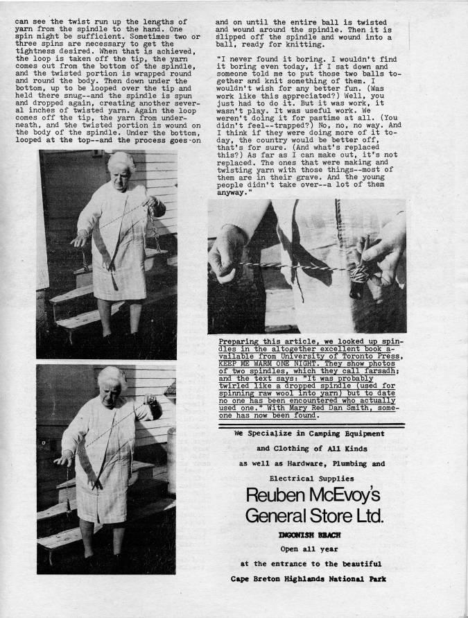 Published by Ronald Caplan on 1979/6/1 (568 reads)can see the twist run up the lengths of yarn from the spindle to the hand. One spin might be sufficient. Sometimes two or three spins are necessary to get the tightness desired. When that is achieved, the loop is taken off the tip, the yam comes out from the bottom of the spindle, and the twisted portion is wrapped round and round the body. Then down under the bottom, up to be looped over the tip and held there snug • and the spindle is spun and dropped again, creating another sever? al inches of twisted yarn. Again the loop comes off the tip, the yarn from under? neath, and the twisted portion is wound on the body of the spindle. Under the bottom, looped at the top • and the process goes-on and on until the entire ball is twisted and wound around the spindle. Then it is slipped off the spindle and wound into a ball, ready for knitting. "I never found it boring. I wouldn't find it boring even today, if I sat down and someone told me to put those two balls to? gether and knit something of them. I wouldn't wish for any better fun. (Was work like this appreciated?) Well, you just had to do it. But it was work, it wasn't play. It was useful work. We weren't doing it for pastime at all. (You didn't feel • trapped?) No, no, no way. And I think if they were doing more of it to? day, the country would be better off, that's for sure. (And what's replaced this?) As far as I can make out, it's not replaced. The ones that were making and twisting yarn with those things • most of them are in their grave. And the young people didn't take over • a lot of them anyway." Preparing this article, we looked up spin? dles in the altogether excellent book a- vailable from University of Toronto Press, KEEP ME WARM ONE NIGHT. They show phoioj- of two spindles, which they call farsadh; and the text says; "It was probably twirled like a dropped spindle (used for spinning raw wool into yarn) but to date no one has been encountered who actually used one." With Mary Red Dan Smith, some? one has now been founds We Specialize in Camping Bquipment and Clothing of All Kinds as well as Hardware, Plumbing and ??lectrical Supplies Reuben McEvoys General Store Ltd. XNGONISR mSCtt Open all year sit the entrance to the beautiful Cape Breton Highlands National Park
