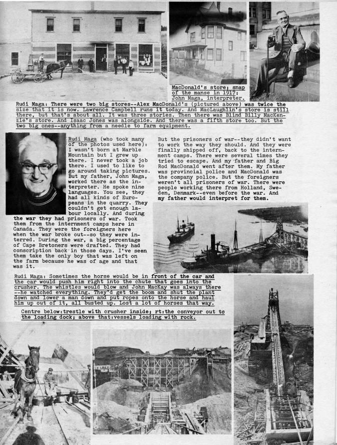 Published by Ronald Caplan on 1979/6/1 (693 reads)MacDonald's store; snap of the manse m 1917; John Maga, interpreter. Rudi Maga; There were two big stores • Alex MacDonald's (pictured above) was twice the • ?? I < 1 ?? I ?? • jt'mn ??iii . T • 'r: 5! , u. f ?? I ??' i??jL-. size"'at it is now. Lawrence Campbell runs it today. And MacLaughlin's store is still there, but that's about all. It was three stories. Then there was Blind Billy MacKen? zie 's store. And Isaac Jones was alongside. And there was a fifth store too. But the two big ones • smything from a needle to farm equipment. But the prisoners of war • they didn't want to work the way they should. And they were finally shipped off, back to the intern? ment camps. There were several times they tried to escape. And my-father and Big Rod MacDonald went after them. My father was provincial police and MacDonald was the company police. But the foreigners weren't all prisoners of war. There were people working there from Holland, Swe? den, Denmark • even before the war. And my father would interpret for them. IRudi Maga (who took many I of the photos used here); I wasn't born at Marble Mountain but I grew up there. I never took a job there. I used to like to go around taking pictures. But my father, John Maga, worked there as the in? terpreter. He spoke nine languages. You see, they I had all kinds of Euro? peans in the quarry. They couldn't get enough la? bour locally. And during the war they had prisoners of war. Took them from the internment camps here in Canada. They were the foreigners here when the war broke out • so they were in? terred. During the war, a big percentage of Cape Bretoners were drafted. They had conscription back in those days. I've seen them take the only boy that was left on the farm because he was of age and that was it. Rudi Maga; Sometimes the horse would be in front of the car and the car would push him right into the chute that goes into the crusher. The whistles would blow and John MacKay was always there --he watched everything. They'd get the boom and shut the plant down and lower a man down and put ropes onto the horse and haul him up out of it, all busted up. Lost a lot of horses that way. Centre below;trestle with crusher inside; rt:the conveyor out to the loading dock; above that;vessels loading with rock.