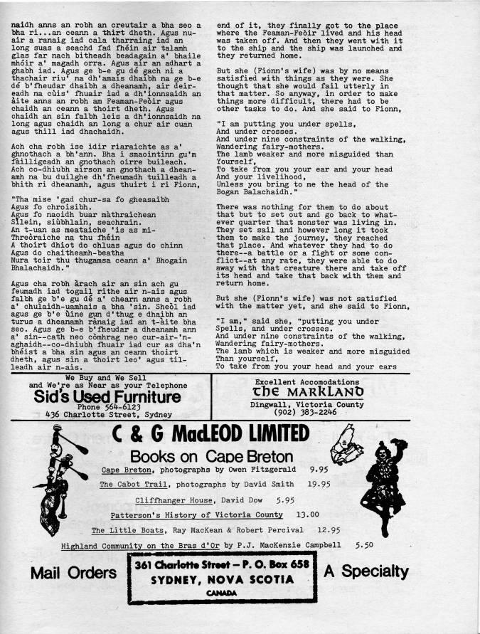 Published by Ronald Caplan on 1979/6/1 (316 reads)naidh anns an robh aji creutair a bha seo a bha ri...an ceann a thirt dheth. Agus nu? air a ranaig iad cala tharraing iad an long suas a seachd fad fhein air talamh glas far nach bitheadh beadagain a' bhaile mhoir a' magadh orra. Agus air an adhart a ghabh iad. Agus ge b-e gu de gach ni a thachair riu' na dh'amais dhaibh na ge b-e de b'fheudar dhaibh a dheanamh, air deir- eadh na cuis' fhuair iad a dh'ionnsaidh an aite anns an robh am Feaman-Feoir agus chaidh an ceann a thoirt dheth. Agus chaidh an sin falbh leis a dh'ionnsaidh na long agus chaidh an long a chur air cuan agus thill iad dhachaidh. Ach cha robh ise idir riaraichte as a' ghnothach a bh'ann. Bha i smaointinn gu'm failligeadh an gnothach oirre buileach. Ach co-dhiubh airson an gnothach a dhean? amh na bu duilghe dh'fheumadh tuilleadh a bhith ri dheanamh, agus thuirt i ri Fionn, "Tha mise 'gad chur-sa fo gheasaibh Agus fo chroisibh. Agus fo naoidh buar mathraichean Silein, siubhlain, seachrain. An t-uan as meataiche''is as mi- Threoraiche na thu fhein A thoirt dhiot do chluas agus do chinn Agus do chaitheamh-beatha Mura toir thu thugamsa ceann a' Bhogain Bhalachaidh." Agus cha robh arach air an sin ach gu feumadh iad togail rithe air n-ais agus falbh ge b'e gu de a' chearn anns a robh a' chulaidh-uamhais a bha 'sin. Sheol iad agus ge b'e liine gixn d'thug e dhaibh an turus a dheanamh ranaig iad an t-aite bha seo. Agus ge b-e b'fheudar a dheanamh ann a' sin • cath neo comhrag neo cur-air-'n- aghaidh • co-dhiubh fhuair iad cur as dha'n bheist a bha sin agus an ceann thoirt dheth, agus sin a thoirt leo' agus til? leadh air n-ais. end of it, they finally got to the place where the Feaman-Feoir lived and his head was taken off. And then they went with it to the ship and the ship was launched and they returned home. But she (Fionn's wife) was by no means satisfied with things as they were. She thought that she would fail utterly in that matter. So anyway, in order to make things more difficult, there had to be other tasks to do. And she said to Fionn, "I am putting you imder spells. And under crosses. And under nine constraints of the walking, Wandering fairy-mothers. The lamb weaker and more misguided than Yourself, To take from you your ear and your head And your livelihood. Unless you bring to me the head of the Began Balachaidh." There was nothing for them to do about that but to set out and go back to what? ever quarter that monster was living in. They set sail and however long it took them to make the journey, they reached that place. And whatever they had to do there • a battle or a fight or some con? flict • at any rate, they were able to do away with that creature there and take off its head and take that back with them and return home. But she (Fionn's wife) was not satisfied with the matter yet, and she said to Fionn, "I am," said she, "putting you under Spells, and under crosses. And under nine constraints of the walking. Wandering fairy-mothers. The lamb which is weaker and more misguided Than yourself. To take from you your head and your ears We Buy and We Sell and We're as Near as your Telephone Sid's Used Furniture Phone 564-6123 436 Charlotte Street, Sydney Excellent Accomodations the MARklANt) Dingwall, Victoria Coimty (902) 383-2246 C & G MadEOD LIMITED Books on Caoe Breton Cape Breton, photographs by Owen Fitzgerald 9.95 The Cabot Trail, photographs by David Smith 19.95 Cliffhanger House, David Dow 5-95 Patterson's History of Victoria County I3.OO The Little Boats, Ray MacKean & Robert Percival 12.95 Highland Community on the Bras d'Or by P.J. MacKenzie Campbell 5.50 Mail Orders Chorlotto StrMt - P. O, Box 658 SYDNEY, NOVA SCOTIA CAMADA A Specialty