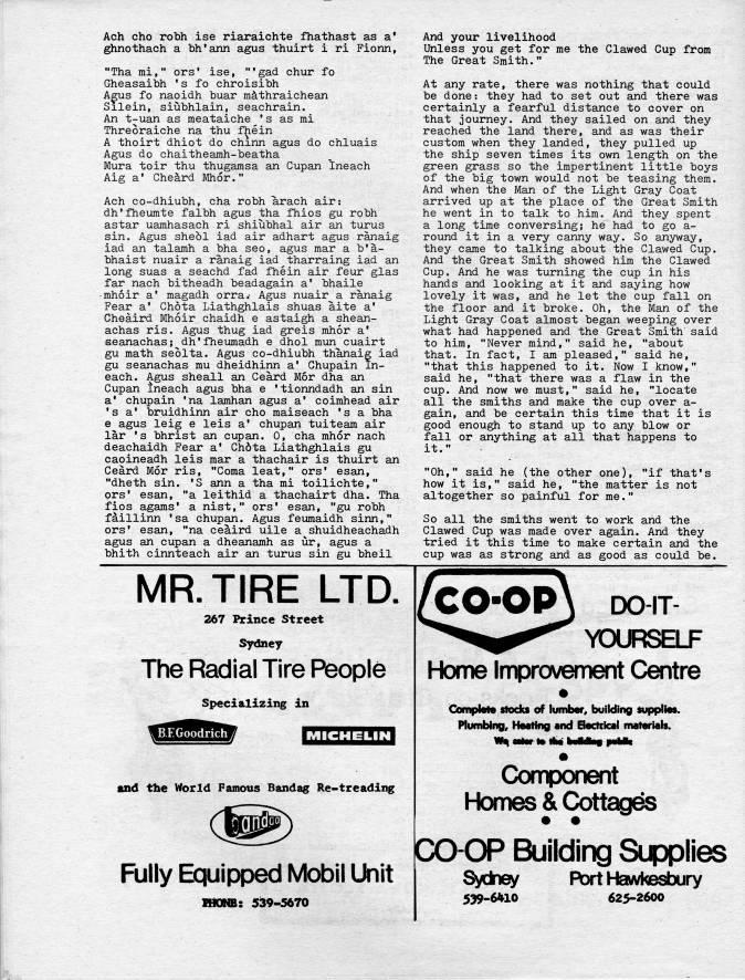 Published by Ronald Caplan on 1979/6/1 (276 reads)Ach cho robh ise riaraichte fhathast as a* ghnothach a bh'ann agus thuirt i ri Fionn, "Tha mi," ors' ise, "'gad chur fo Gheasaibh 's fo chroisibh Agus fo naoidh buar mathraichean Silein, siubhlain, seachrain. An t-uan as meataiche ''s as mi Threoraiche na thu fhein A thoirt dhiot do chinn agus do chluais Agus do chaitheamh-beatha Mura toir thu thugamsa an Cupan Ineach Aig a' Che'rd B/Ihor." Ach co-dhiubh, cha robh arach air: dh'fheumte falbh agus tha fhios gu robh astar uamhasach ri shiubhal air an turus sin. Agus sheol iad air adhart agus ranaig iad an talamh a bha seo, agus mar a b'a- bhaist nuair a ranaig iad'tharraing iad an long suas a seachd fad fhein air feur glas far nach bitheadh beadagain a' bhaile • mhoir a' magadh orra.- Agus nuair'a ranaig Fear a' Chota Liathghlais shuas aite a' Cheaird Mh6ir chaidh e astaigh a shean- achas ris. Agus thug iad greis mhor a' seanachas ;'dh'fheiimadh e dhol mun cuairt gu math seblta. Agus co-dhiubh thanaig iad gu seanachas mu dheidhinn a' Chupain In- each. Agus sheall an Ceard Mor dha an Cupan tneach agus bha e 'tionndadh an sin a' chupain 'na lamhan agus a' coimhead air 's a' bruidhinn air cho maiseach 's a bha e agus leig e leis a' chupan tuiteam air Iar 's bhrist an cupan. 0, cha mhor nach deachaidh Fear a' Ch6ta Liathghlais gu caoineadh leis mar a thachair is thuirt an Ceard Mor ris, "Coma leat," ors' esan, "dheth sin. 'S ann a tha mi toilichte," ors' esan, "a leithid a thachairt dha. Tha fios agams' a nist," ors' esan, "gu robh faillinn 'sa chupan. Agus feumaidh sinn," ors' esan, "na ceaird uile a shuidheachadh agus an cupan a dheanamh as ur, agus a bhith cinnteach air an turus sin gu bheil And your livelihood Unless you get for me the Clawed Cup from The Great Smith." At any rate, there was nothing that could be done: they had to set out and there was certainly a fearful distance to cover on that journey. And they sailed on and they reached the land there, and as was their custom when they landed, they pulled up the ship seven times its own length on the green grass so the impertinent little boys of the big town would not be teasing them. And when the Man of the Light Gray Coat arrived up at the place of the Great Smith he went in to talk to him. And they spent a long time conversing; he had to go a- round it in a very canny way. So anyway, they came to talking about the Clawed Cup. And the Great Smith showed him the Clawed Cup. And he was turning the cup in his hands and looking at it and saying how lovely it was, and he let the cup fall on the floor and it broke. Oh, the Man of the Light Gray Coat almost began weeping over what had happened and the Great Smith said to him, "Never mind," said he, "about that. In fact, I am pleased," said he, "that this happened to it. Now I know," said he, "that there was a flaw in the cup. And now we must," said he, "locate all the smiths and make the cup over a- gain, and be certain this time that it is good enough to stand up to any blow or fall or anything at all that happens to it." "Oh," said he (the other one), "if that's how it is," said he, "the matter is not altogether so painful for me." So all the smiths went to work and the Clawed Cup was made over again. And they tried it this time to make certain and the cup was as strong and as good as could be. MR.TIRE LTD. 267 Prince Street Sydney The Radial Tire People Specializing in BEGoodrichv MICHELIN and the Vforld Famous Bandag Re-treading in Fully Equipped Mobil Unit XHONB: 539-5670 CO"OP DO-IT- YOURSELF Home Improvement Centre Completo stocks of lumber, building suppUos. Phimblng, HMting and Secttical matarials. • Component Homes & Cottages COOP Building Supplies Sydney Port Hentvkesbury 539-6''10 625-2600
