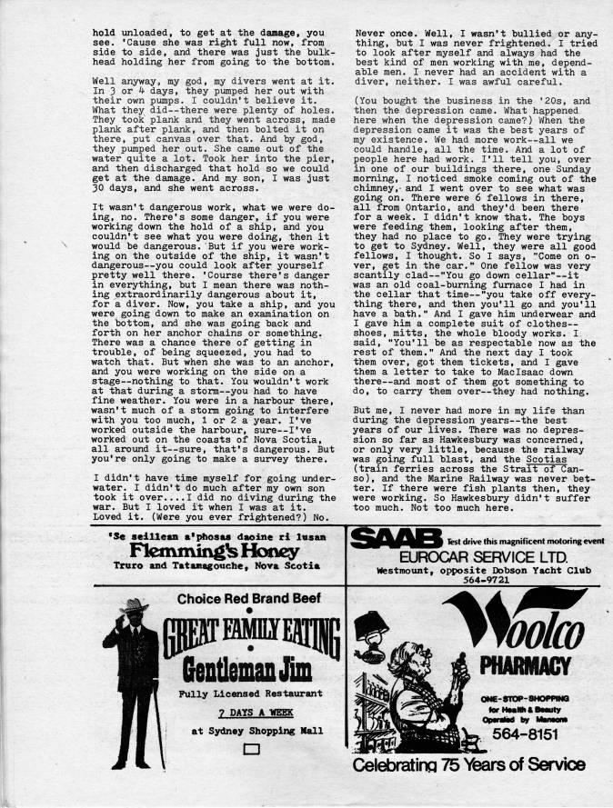Published by Ronald Caplan on 1979/6/1 (235 reads)hold unloaded, to get at the damage, you see. 'Cause she was right full now, from side to side, and there was just the bulk? head holding her from going to the bottom. Well anyway, my god, my divers went at it. In 3 or 4 days, they pumped her out with their own pumps. I couldn't believe it. What they did • there were plenty of holes. They took plank and they went across, made plank after plank, and then bolted it on there, put canvas over that. And by god, they pumped her out. She came out of the water quite a lot. Took her into the pier, and then discharged that hold so we could get at the damage. And my son, I was just 30 days, and she went across. It wasn't dangerous work, what we were do? ing, no. There's some danger, if you were working down the hold of a ship, and you couldn't see what you were doing, then it would be dangerous. But if you were work? ing on the outside of the ship, it wasn't dangerous • you could look after yourself pretty well there. 'Course there's danger in everything, but I mean there was noth? ing extraordinarily dangerous about it, for a diver. Now, you take a ship, and you were going down to make an examination on the bottom, and she was going back and forth on her anchor chains or something. There was a chance there of getting in trouble, of being squeezed, you had to watch that. But when she was to an anchor, and you were working on the side on a stage • nothing to that. You wouldn't work at that during a storm • you had to have fine weather. You were in a harbour there, wasn't much of a storm going to interfere with you too much, 1 or 2 a year. I've worked outside the harbour, sure • I've worked out on the coasts of Nova Scotia, all around it • sure, that's dangerous. But you're only going to make a survey there. I didn't have time myself for going under? water. I didn't do much after my own son took it over....I did no diving during the war. But I loved it when I was at it. Loved it. (Were you ever frightened?) No. Never once. Well, I wasn't bullied or any? thing, but I was never frightened. I tried to look after myself and always had the best kind of men working with me, depend? able men. I never had an accident with a diver, neither. I was awful careful. (You bought the business in the '20s, and then the depression came. What happened here when the depression came?) When the depression came it was the best years of my existence. We had more work • all we could handle, all the time. And a lot of people here had work. I'll tell you, over in one of our buildings there, one Sunday morning, I noticed smoke coming out of the chimney,' and I went over to see what was going on. There were 6 fellows in there, all from Ontario, and they'd been there for a week. I didn't know that. The boys were feeding them, looking after them, they had no place to go. They were trying to get to Sydney. Well, they were all good fellows, I thought. So I says, "Come on 0- ver, get in the car." One fellow was very scantily clad • "You go down cellar" • it was an old coal-burning furnace I had in the cellar that time • "you take off every? thing there, and then you'll go and you'll have a bath." And I gave him imderwear and I gave him a complete suit of clothes • shoes, mitts, the whole bloody works. I said, "You'll be as respectable now as the rest of them." And the next day I took them over, got them tickets, and I gave them a letter to take to Maclsaac down there • and most of them got something to do, to carry them over • they had nothing. But me, I never had more in my life than during the depression years • the best years of our lives. There was no depres? sion so far as Hawkesbury was concerned, or only very little, because the railway was going full blast, and the Scotias (train ferries across the Strait of Can- so ), and the Marine Railway was never bet? ter. If there were fish plants then, they were working. So Hawkesbury didn't suffer too much. Not too much here. 'Se seillean a'phosas daoine ri Ittsaa Flonining' Hom' Truro and Tatanagouehe. Nova Scotia Choice Red Brand Beef mm Gentleman Jim Fully Licensed Restaurant 7 DAYS A uman at Sydney Shopping Mall iZI lest drive this magnificent nu>toring event EUROCAR SERVICE LTD. Westmoimt, opi?osite Dobson Yacht Club 564-9721 fWfl? PNAinUCY 0NE-8T0P-SHOPPINQ forHMMi&BMttty; 564-8161 Celebrating 75 Years of Servioe