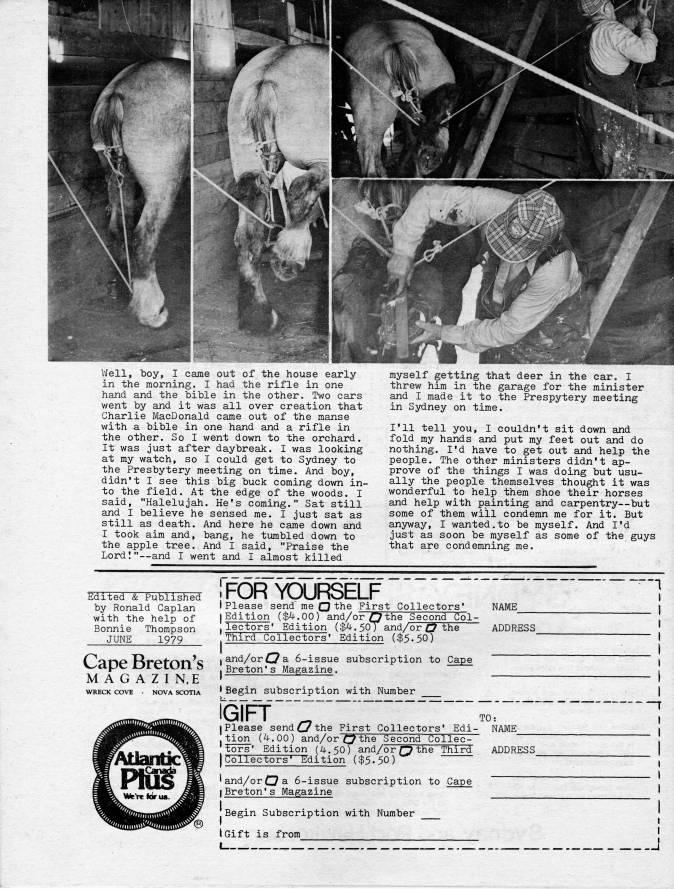 Well, boy, I came out of the house early in the morning. I had the rifle in one hand and the bible in the other. Two cars went by and it was all over creation that Charlie MacDonald came out of the manse with a bible in one hand and a rifle in the other. So I went down to the orchard. It was just after daybreak. I was looking at my watch, so I could get to Sydney to the Presbytery meeting on time. And boy, didn't I see this big buck coming down in? to the field. At the edge of the woods. I said, "Halelujah. He's coming." Sat still and I believe he sensed me. I just sat as still as death. And here he came down and I took aim and, bang, he tumbled down to the apple tree. And I said, "Praise the Lord I " • and I went and I almost killed myself getting that deer in the car. I threw him in the garage for the minister and I made it to the Prespytery meeting in Sydney on time. I'll tell you, I couldn't sit down and fold my hands and put my feet out and do nothing. I'd have to get out and help the people. The other ministers didn't ap? prove of the things I was doing but usu? ally the people themselves thought it was wonderful to help them shoe their horses and help with painting and carpentry • but some of them will condemn me for it. But anyway, I wanted.to be myself. And I'd just as soon be myself as some of the guys that are condemning me. Edited & Published by Ronald Caplan with the help of Bonnie Thompson JUNE 1979 Cape Breton's M A G A Z I N.E TfOR YOURSELF t Please send me the First Collectors* [Edition ($4.00) and/or Qthe Second Col- ,lectors' Edition ($4.50) and/or O the Third Collectors' Edition ($5-50) I and/or C? a 6-issue subscription to Cape I Breton's Magazine. NAME ADDRESS WRECK COVE . NOVA SCOTIA ?? Begin subscrlptlon with Number iGrpf ""I ~'r [Please send c7 the First Collectors' Edi- NAME_ tion (4.00) and/orlrythe Second Collec- ' tors' Edition (4.50) and/or r7 the Thir"cr ADDRESS [Collectors' Edition ($5-50) ($5.50) ' and/or O 21 6-issue subscription to Cape I Breton's Magazine Begin Subscription with Number (Gift is from__ I ' J